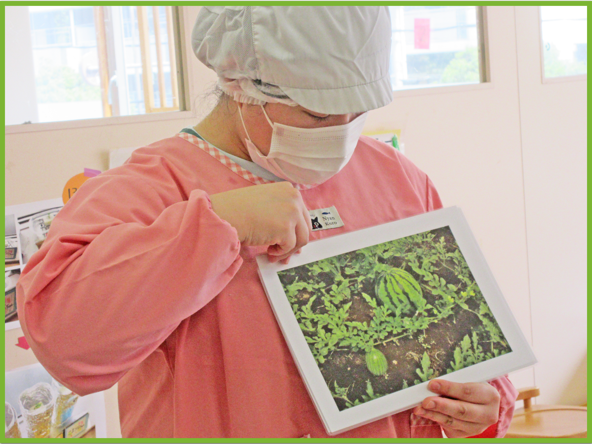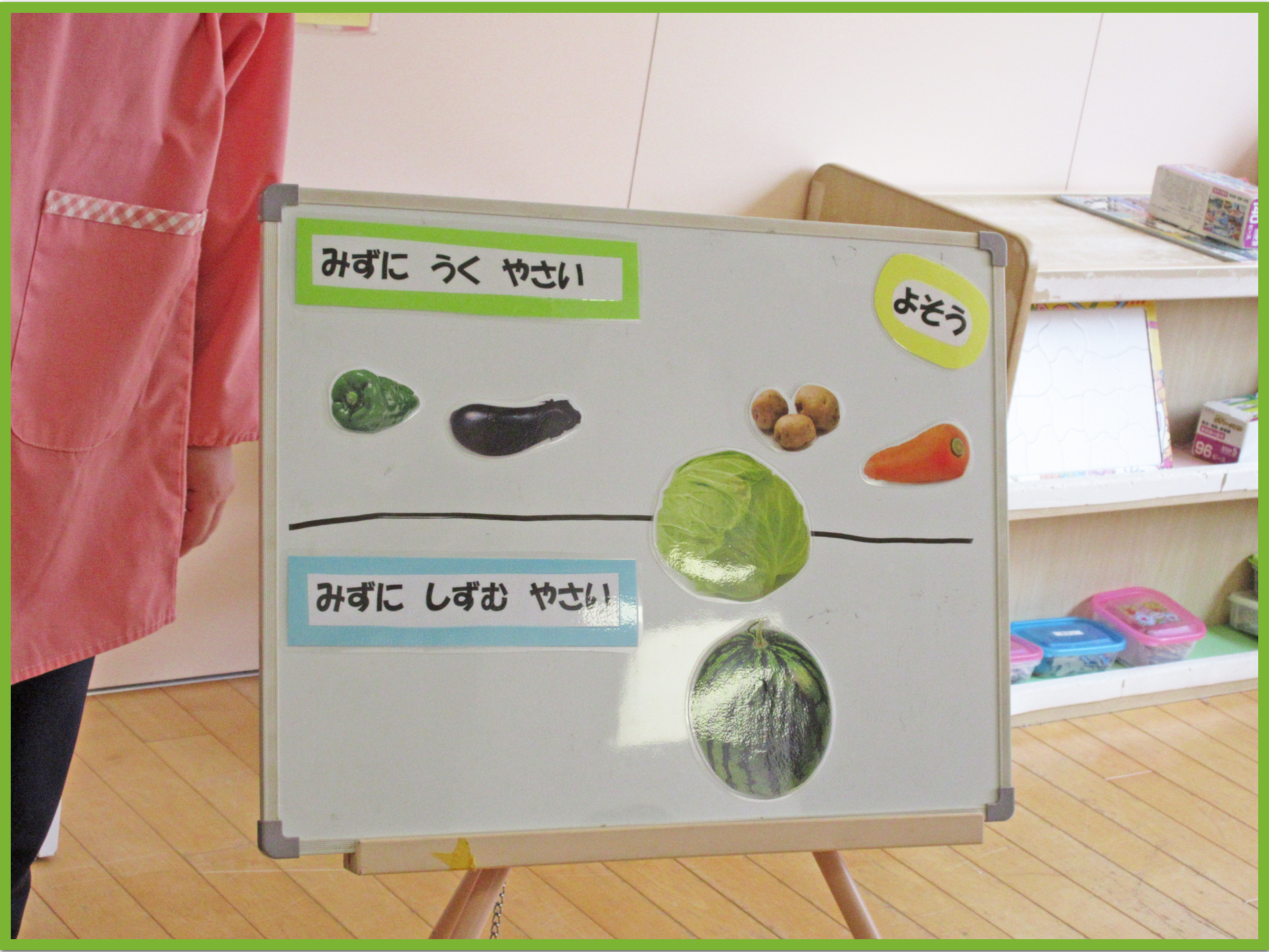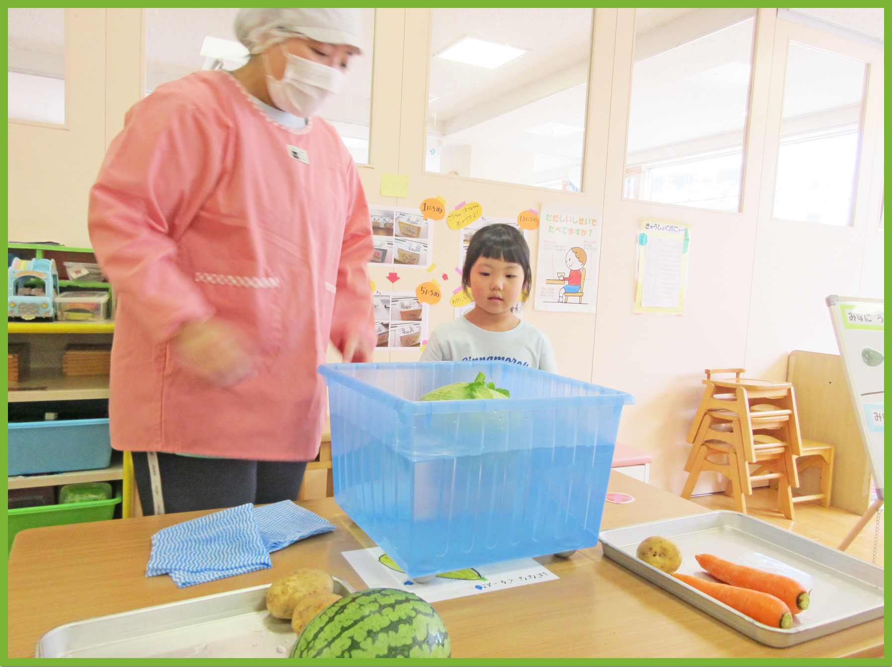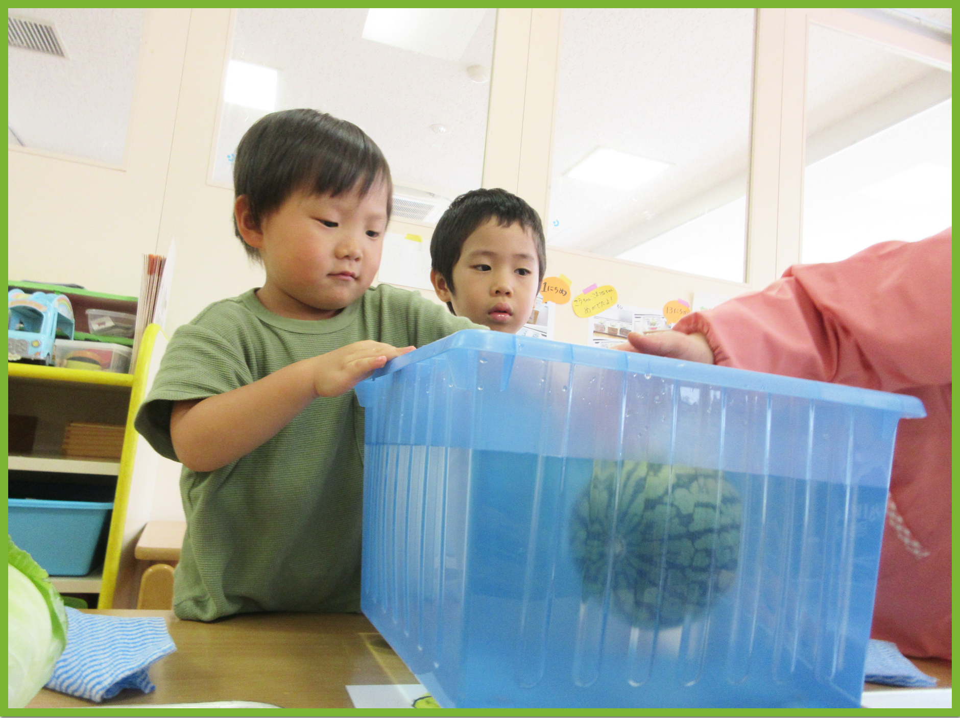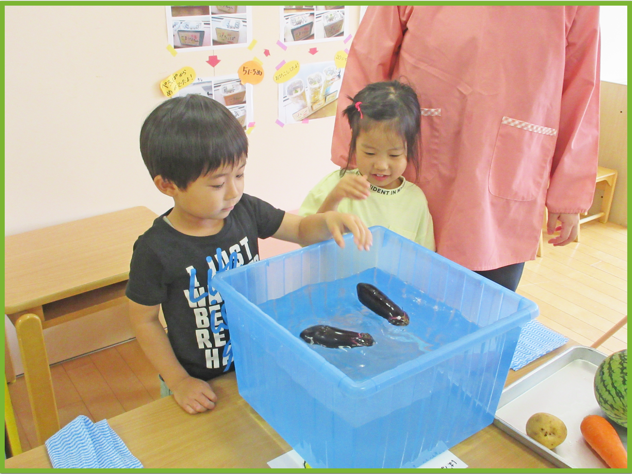 どんな野菜が水に浮くのか沈むのかという予想を立てて実験をしました。キャベツやスイカ等の重い物は沈むと予想し、ナス、ピーマン、人参等の軽い食材は浮くと予想している子が多かったです。実際に水の中に入れてみると重くて沈むと思っていたスイカやキャベツが水に浮き、こどもたちは驚いていました。その後どのような食材が浮いて、どのような食材は沈むのかということを教えてもらうと「他の食材でもやってみたい」「果物だったらどうなるんだろう」と目をキラキラさせていました。