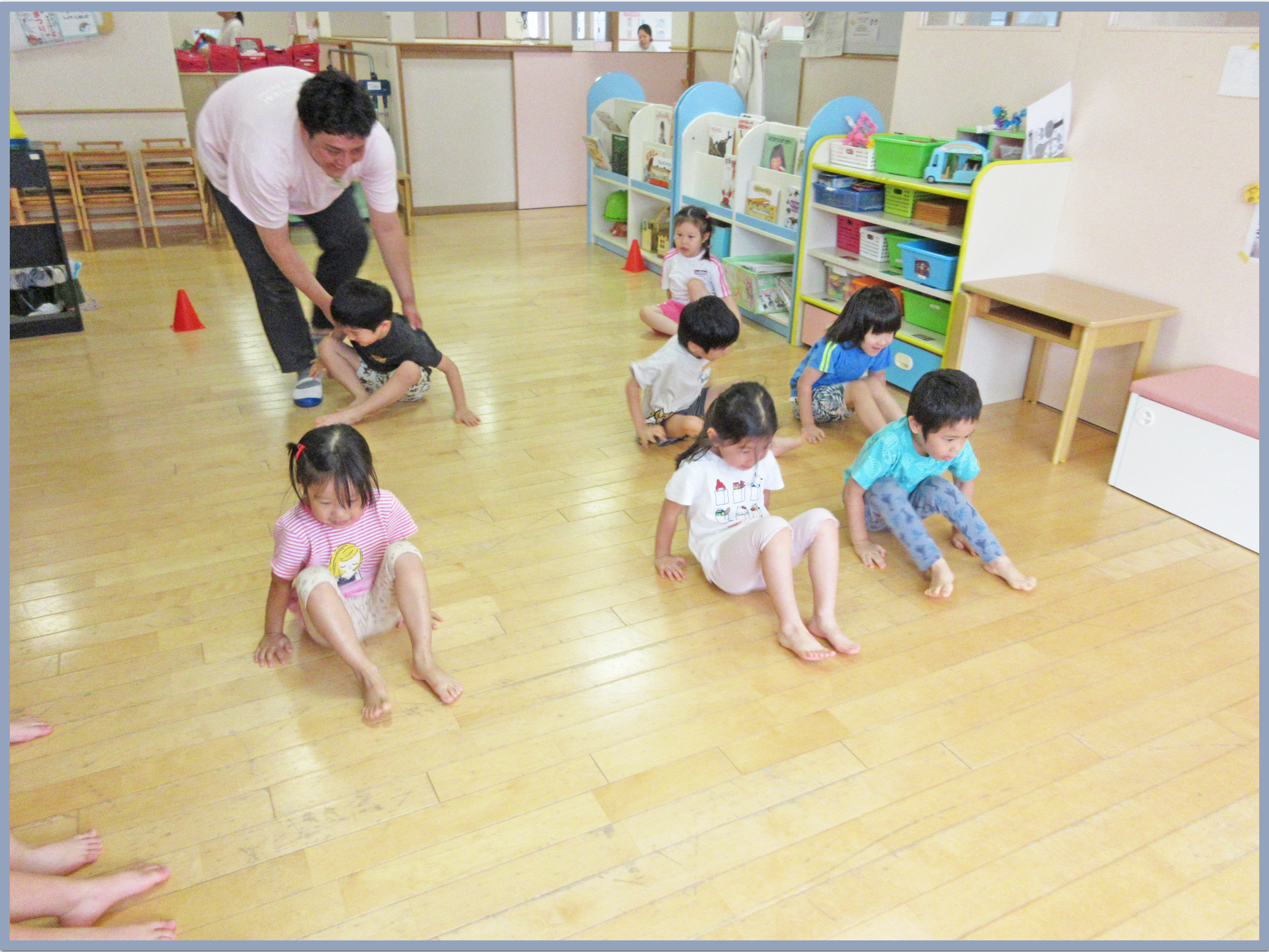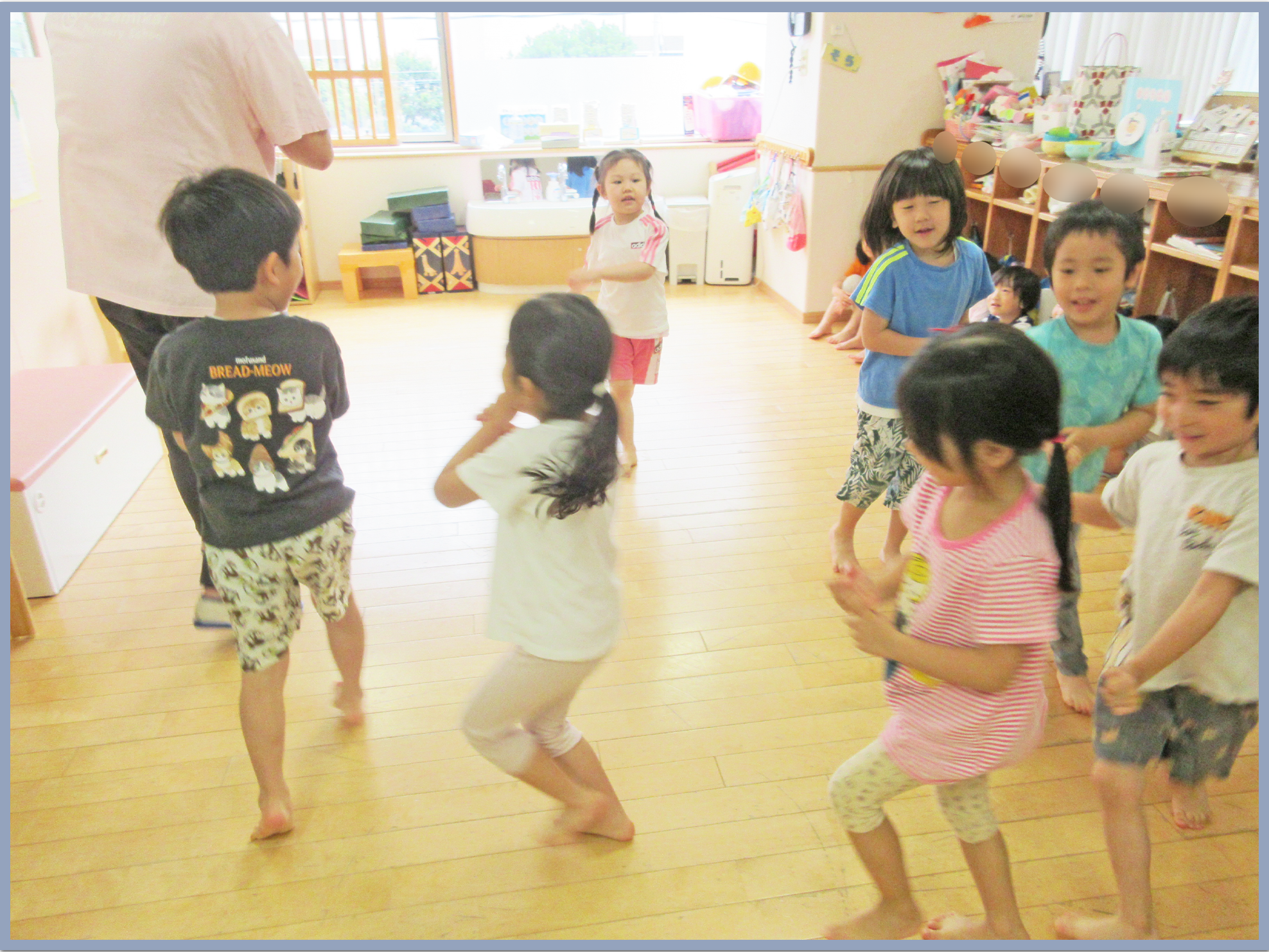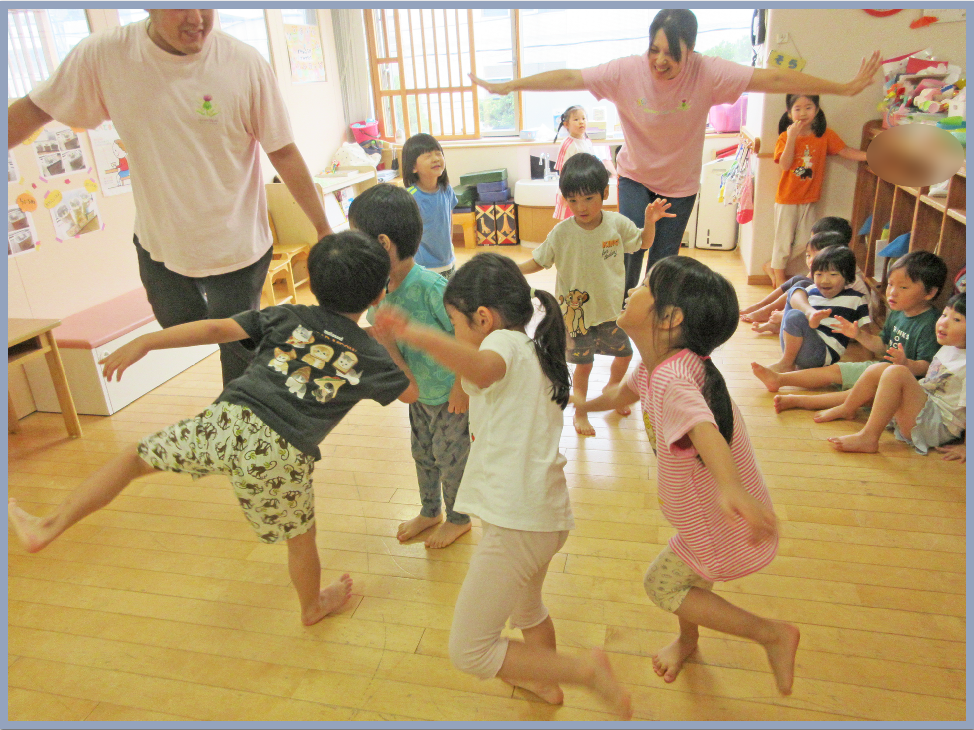 忍者ゲームをして遊びました。忍者になりきって保育者の後ろを歩き、保育者が後ろを向くとピタッと止まります。忍者が変わり身の術でフラミンゴやクマなどに変身すると、その動物になりきって上手に止まることもできました。