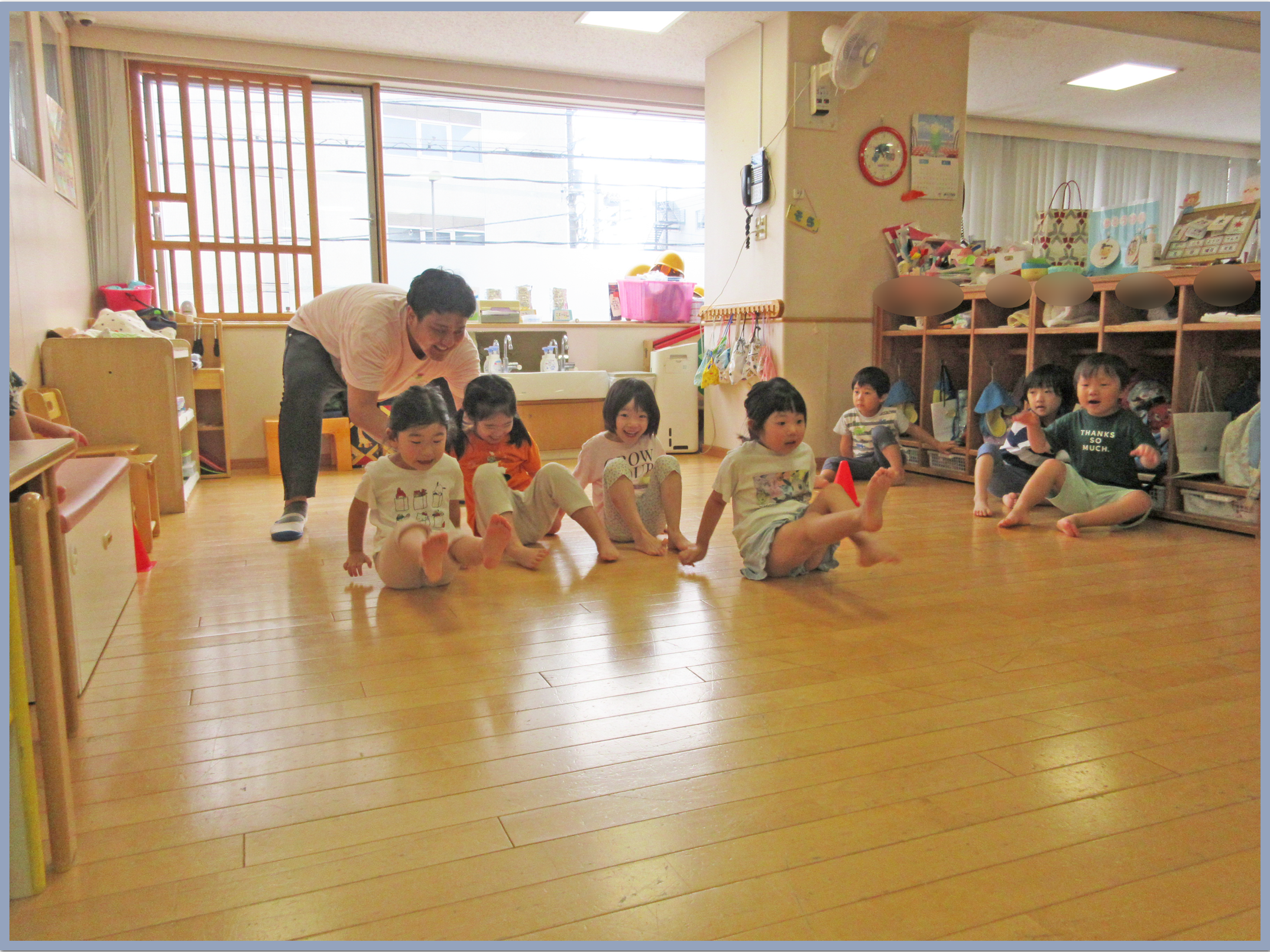 引っ越しゲームをでは、お尻歩きやほふく前進をしながら新しいお家へ引っ越すというルールを決め、保育者に捕まらないよう一生懸命移動していました。途中で捕まってしまったお友だちも最後は全員で引っ越すことができ「やったー」「何とか引っ越せた」と喜んでいました。
