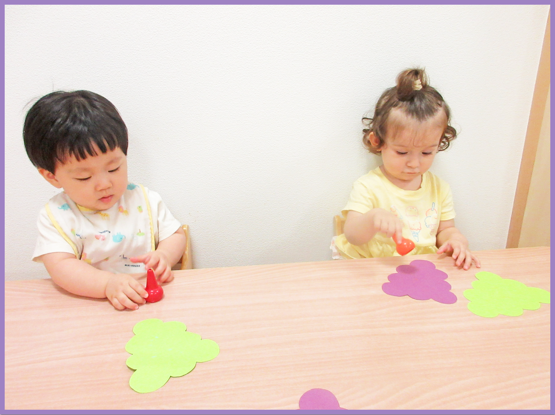 また、初めてクレヨンを使ってぶどうの型紙に製作活動をしました。保育者がクレヨンの箱から「どんな色が好き」「あか」「あお」「きいろ」等の色を伝えながらこどもたちに見せると、クレヨンが登場するたびに「あー」「うー」と声を出し興味を示している姿がみられていました。嬉しそうにクレヨンを選び、ぶどうの紙に「トントン」したり、保育者に手を添えられて自由に線などを描いたりする姿が見られました。