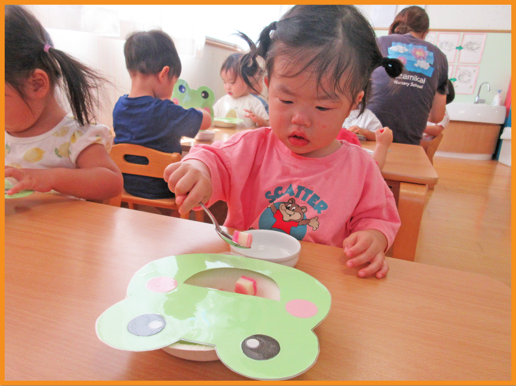 まだ上手持ちをしている子がほとんどですが、三指持ちができる子も数名います。それぞれの持ち方で小さく切ったスポンジをカエルの器(口)へ運び入れていきました。