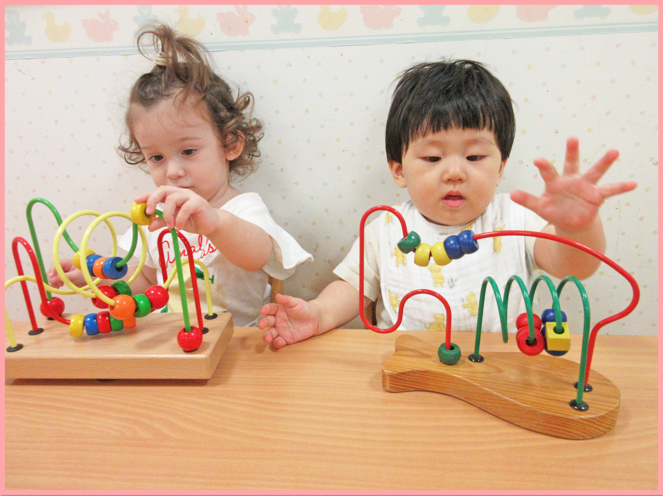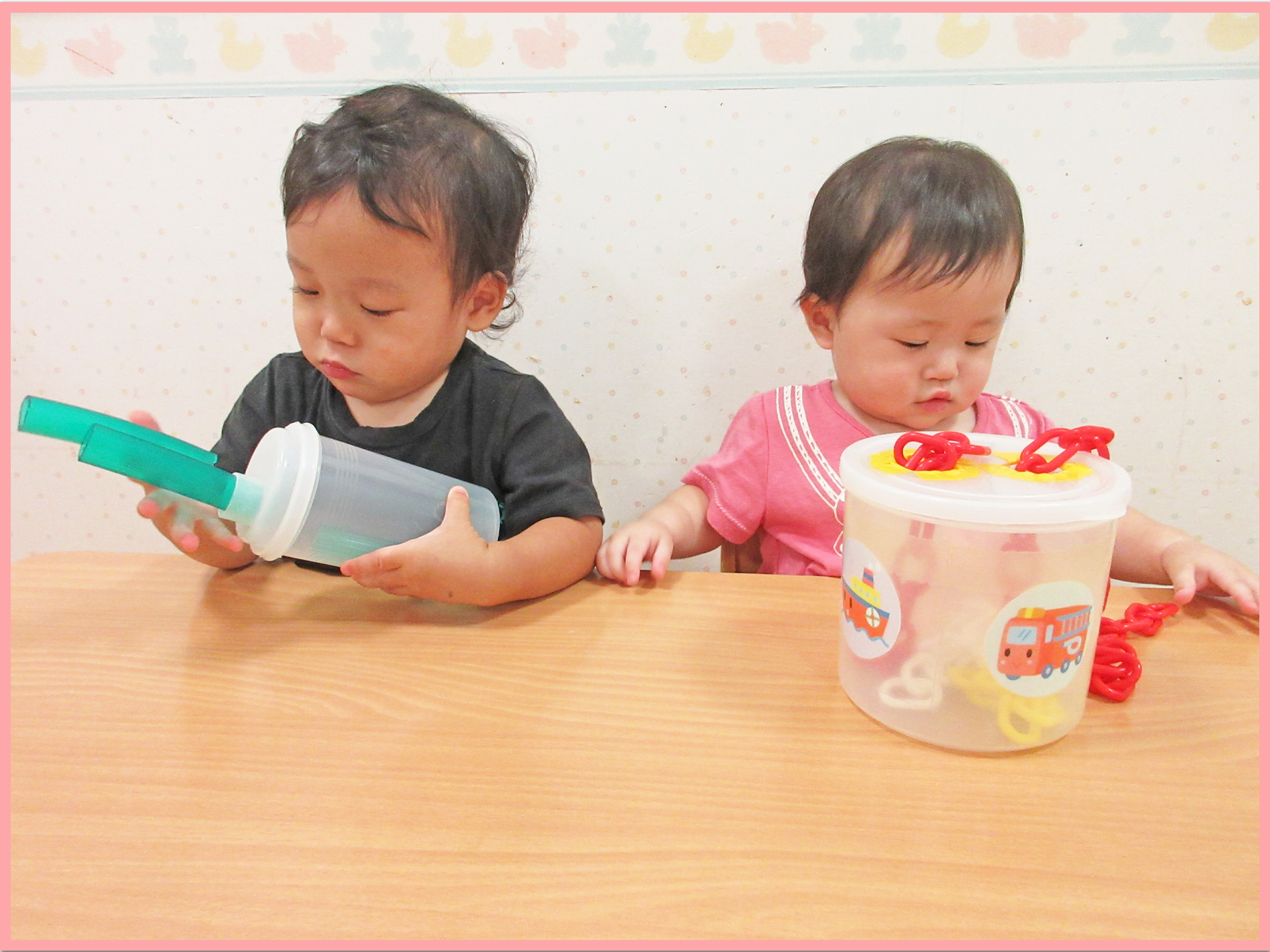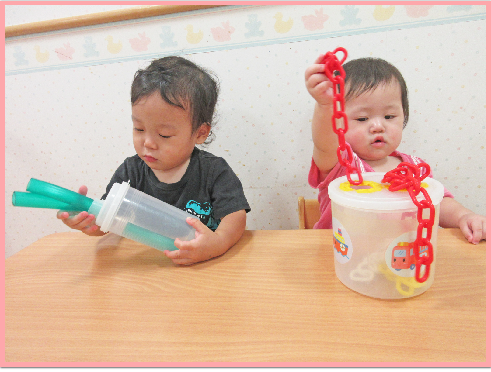 ホースやチェーンなどを落として入れる手作り玩具やルーピングで手指を使う遊びを楽しみました。2人ずつ順番に椅子に座って保育者が遊び方を見せて誘うと、こどもたちは興味津々にその様子を見ながら、真似をしていました。最初は、ゆっくりつかんで入れ物の中に落として入れていましたが、慣れてくると、コツをつかみ上手にホースやチェーンを何度も出し入れしたり、ルーピングのピーズを手指でつまんで動かしたりしながら楽しそうに遊んでいました。