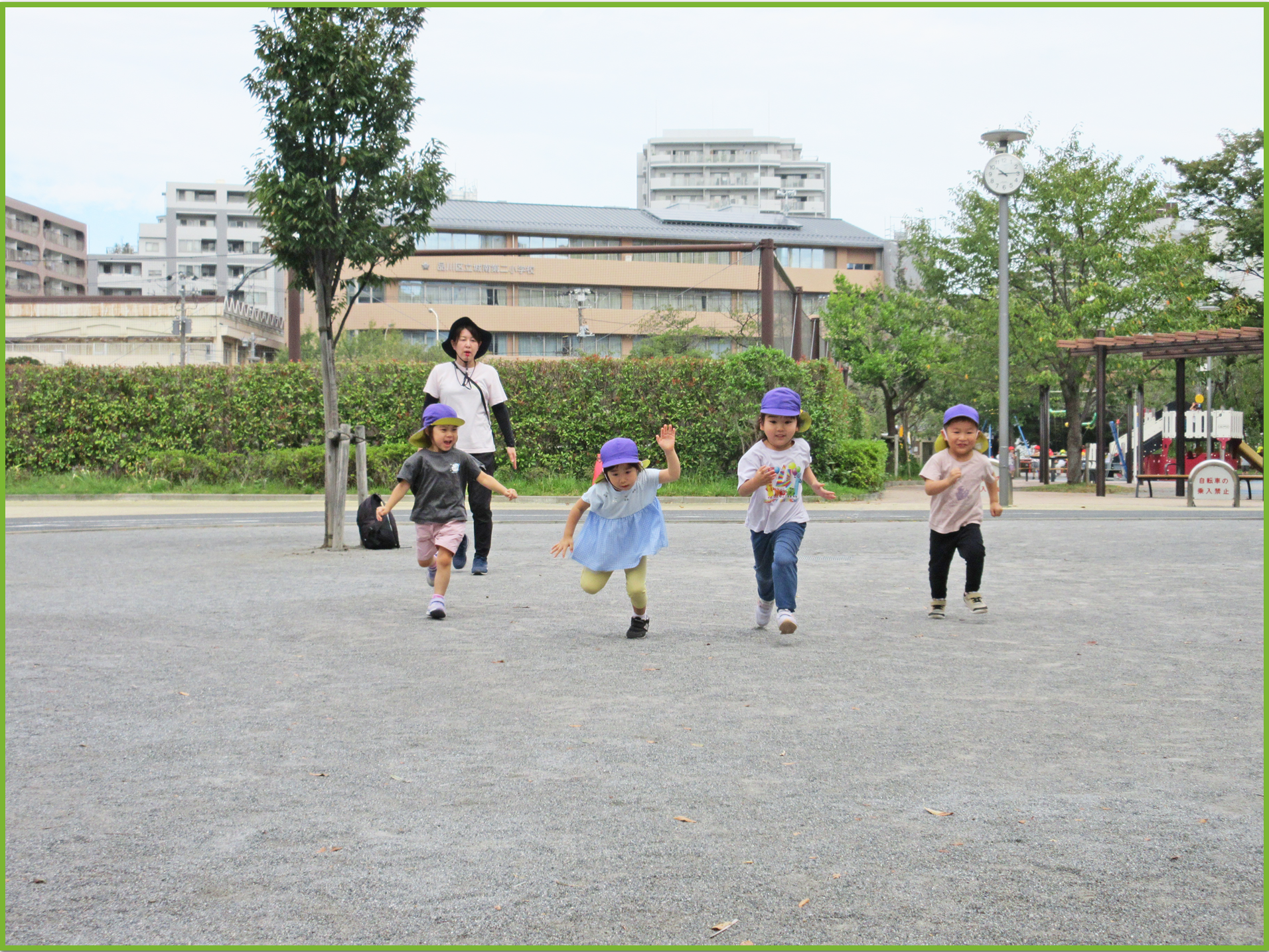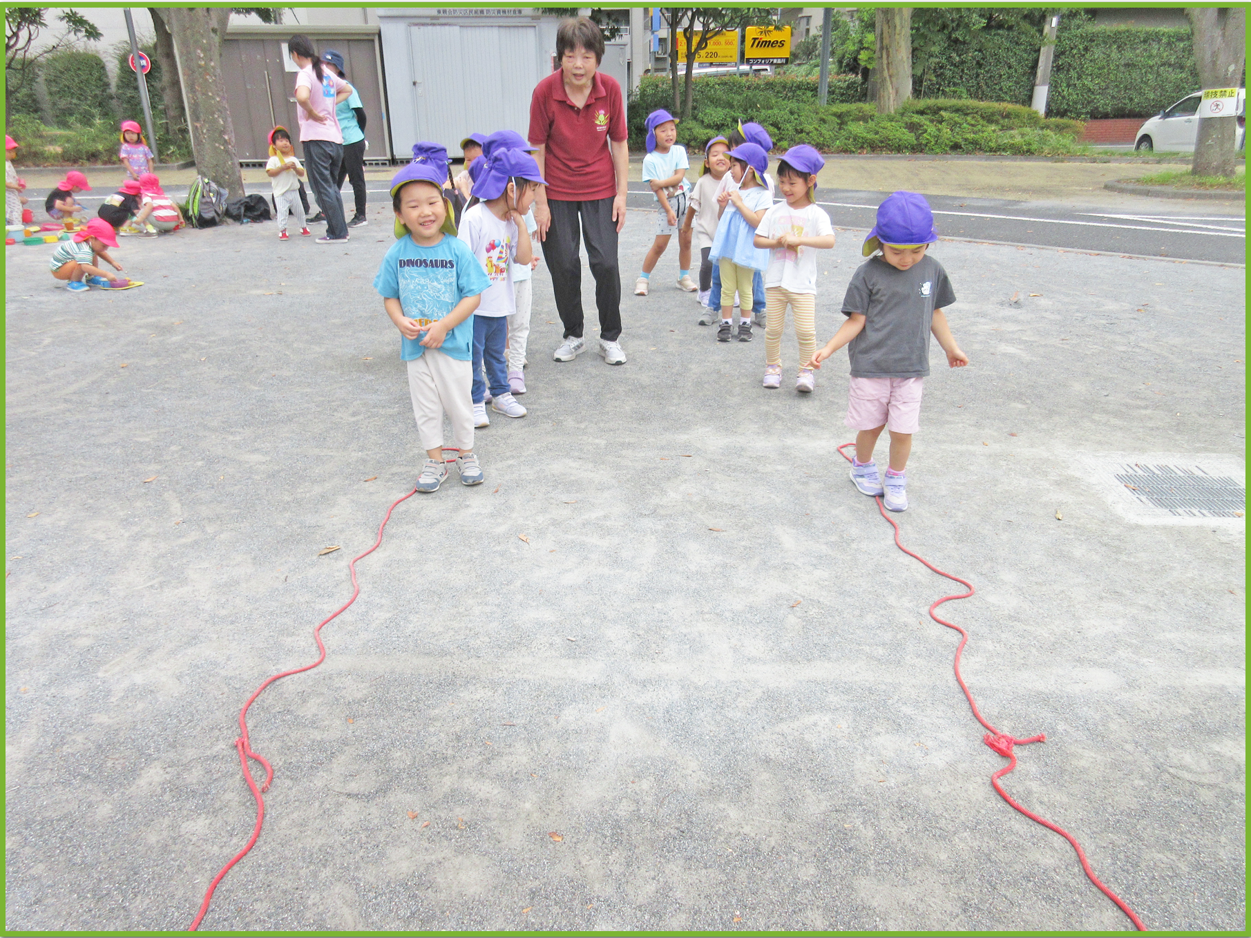 運動会に向けて、かけっこと綱渡りの練習をしました。こどもたちは「ママとパパが来る」「お姉ちゃん、おじいちゃんおばあちゃんが来る」など喜んで話をしていました。かけっこの練習も楽しみな気持ちを持ったまま、名前を呼ばれると大きな声で返事をし、ゴールまで力いっぱい走り切っていました。綱渡りは親子競技で行います。「綱から落ちるとワニになった保育者に食べられちゃうよ」と伝えると落ちないように上手に渡っていました。