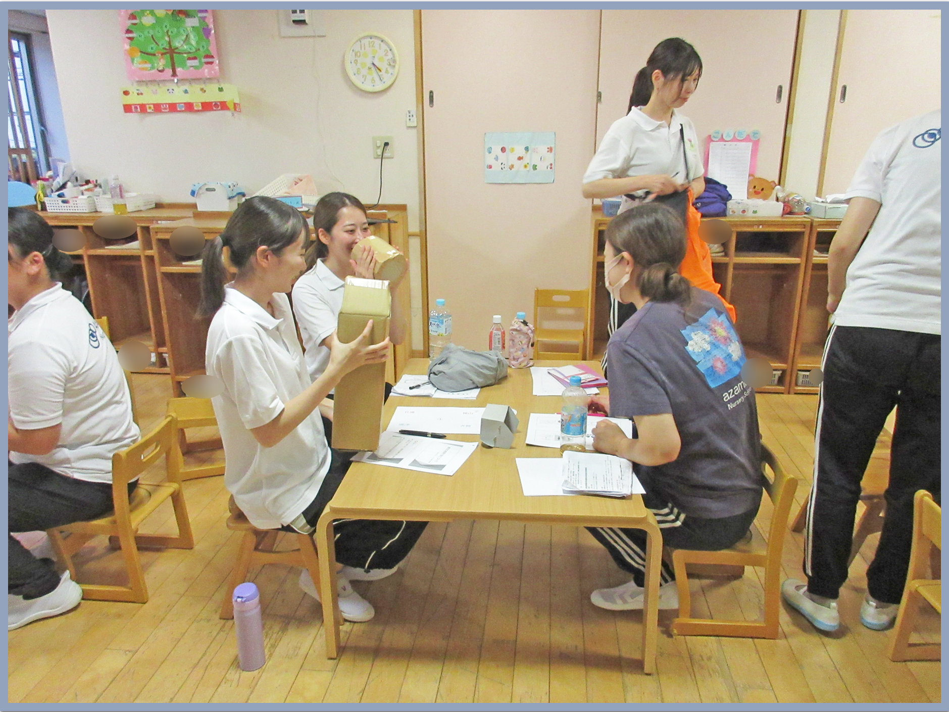 こどもの視点研修では、こどもから見た大きさ、重さ、見え方、速さなど、実物大の物を用意したり、こどもの歩幅を体験したり、こども目線でのことを実際にやってみました。