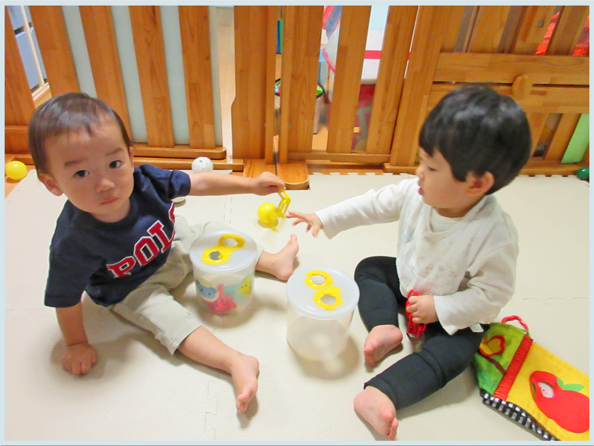 今日は雨だったので室内を2つに分けてマットやポットン落としを出して遊びました。