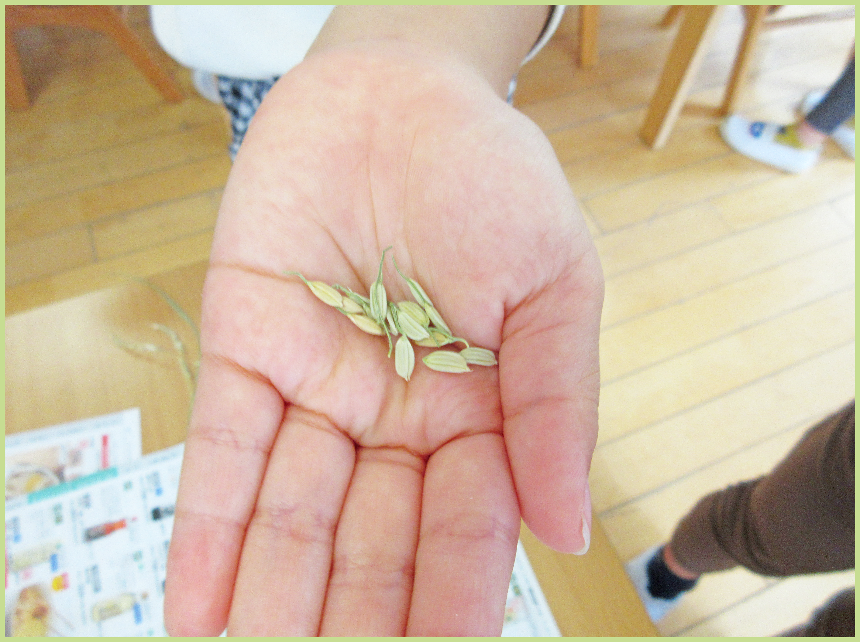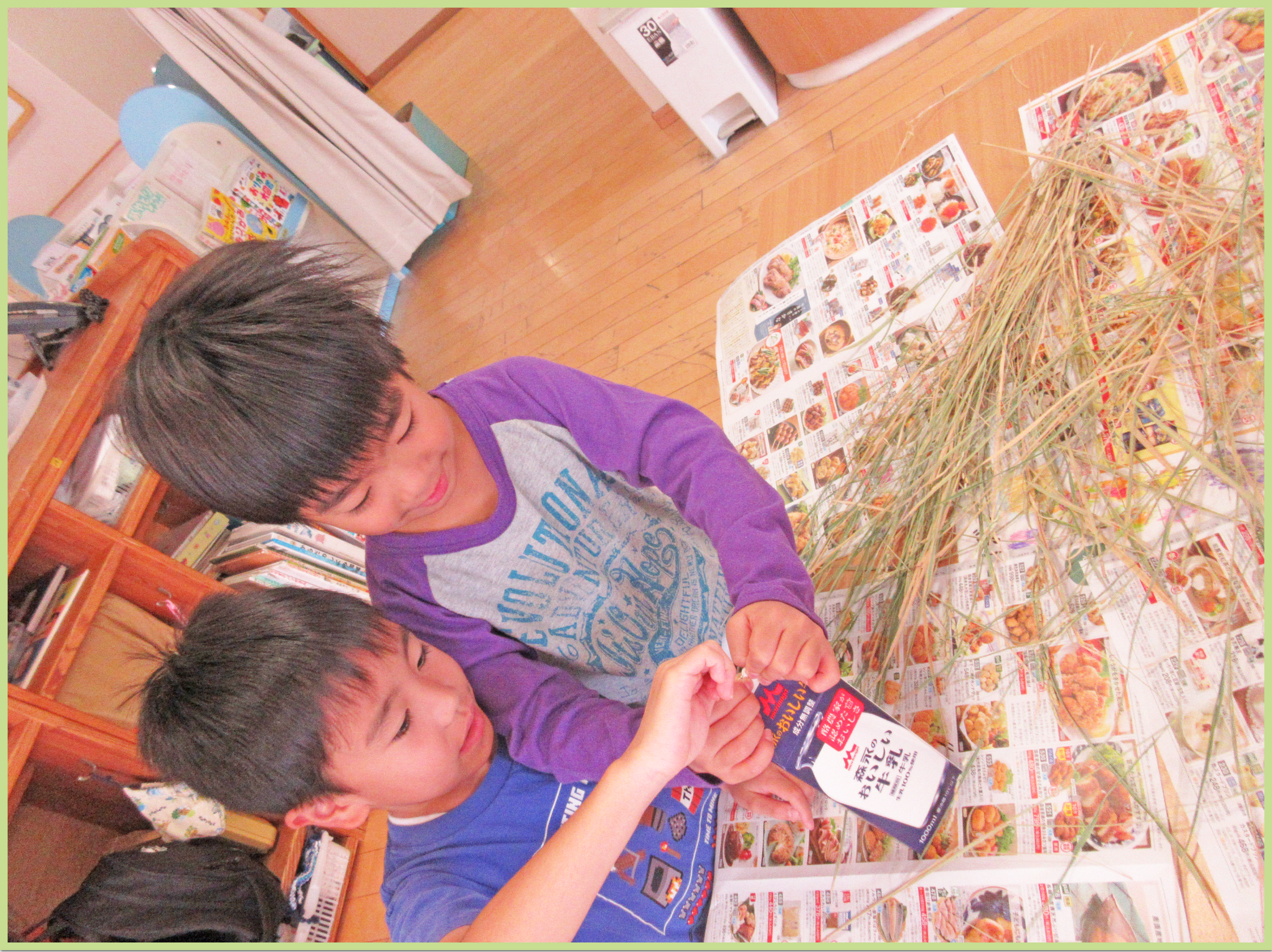 園で育てていた稲の脱穀をしました。二人一組でペアになり、牛乳パックを使用して稲穂から粒を取っていきました。力加減が難しく「お米一粒取るのも大変だね」と、様々な感想が聞かれました。粒のにおいを嗅いだり、指で潰してみたりと、五感を使って観察を楽しむ様子が見られました。