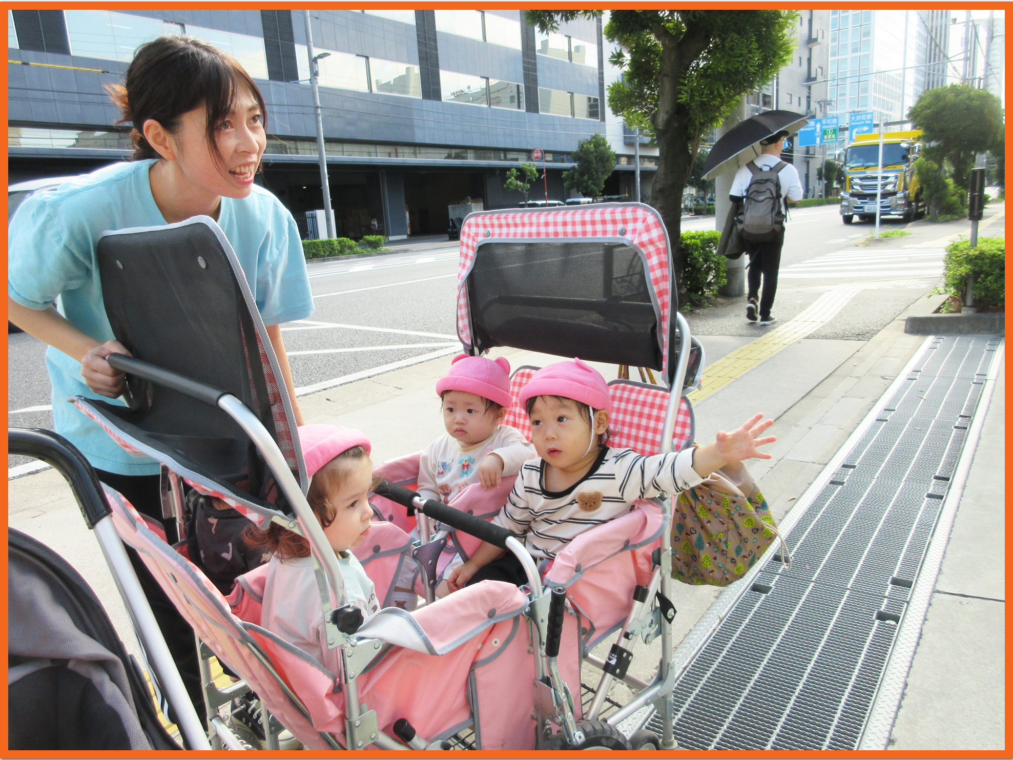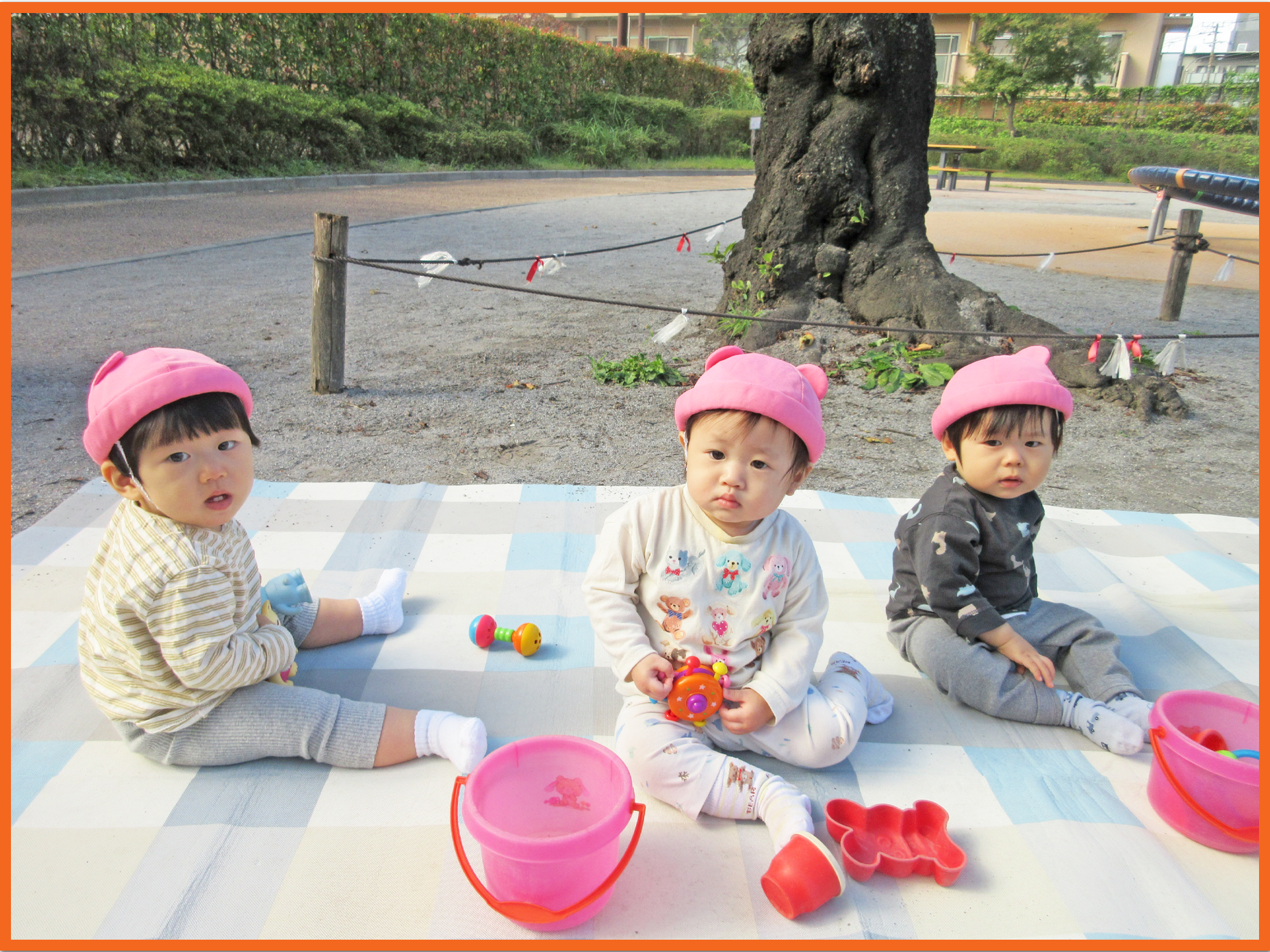 公園で探索遊びを楽しみました。金木犀の木の近くにレジャーシートを敷いて音の出る玩具で「おもちゃのチャチャチャ」や「トンボのめがね」を歌って遊びました。金木犀の良い匂いが風に乗って感じられたりトンボが飛んできたりして身近な秋の自然を楽しんでいました。また、歩行が出来るようになったこどもたちは保育者と滑り台や船の遊具を見に行き、探索を楽しんでいました。