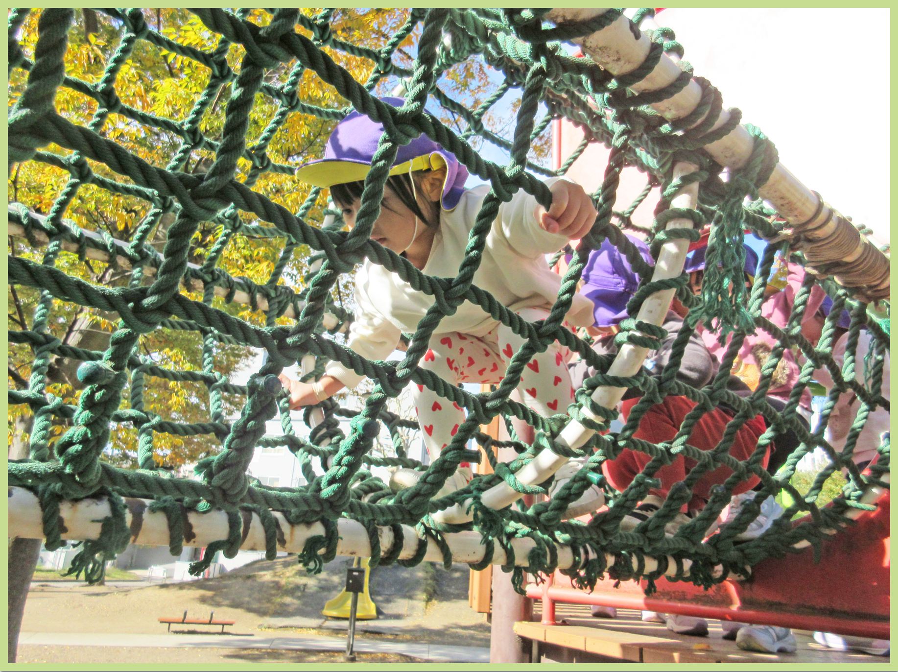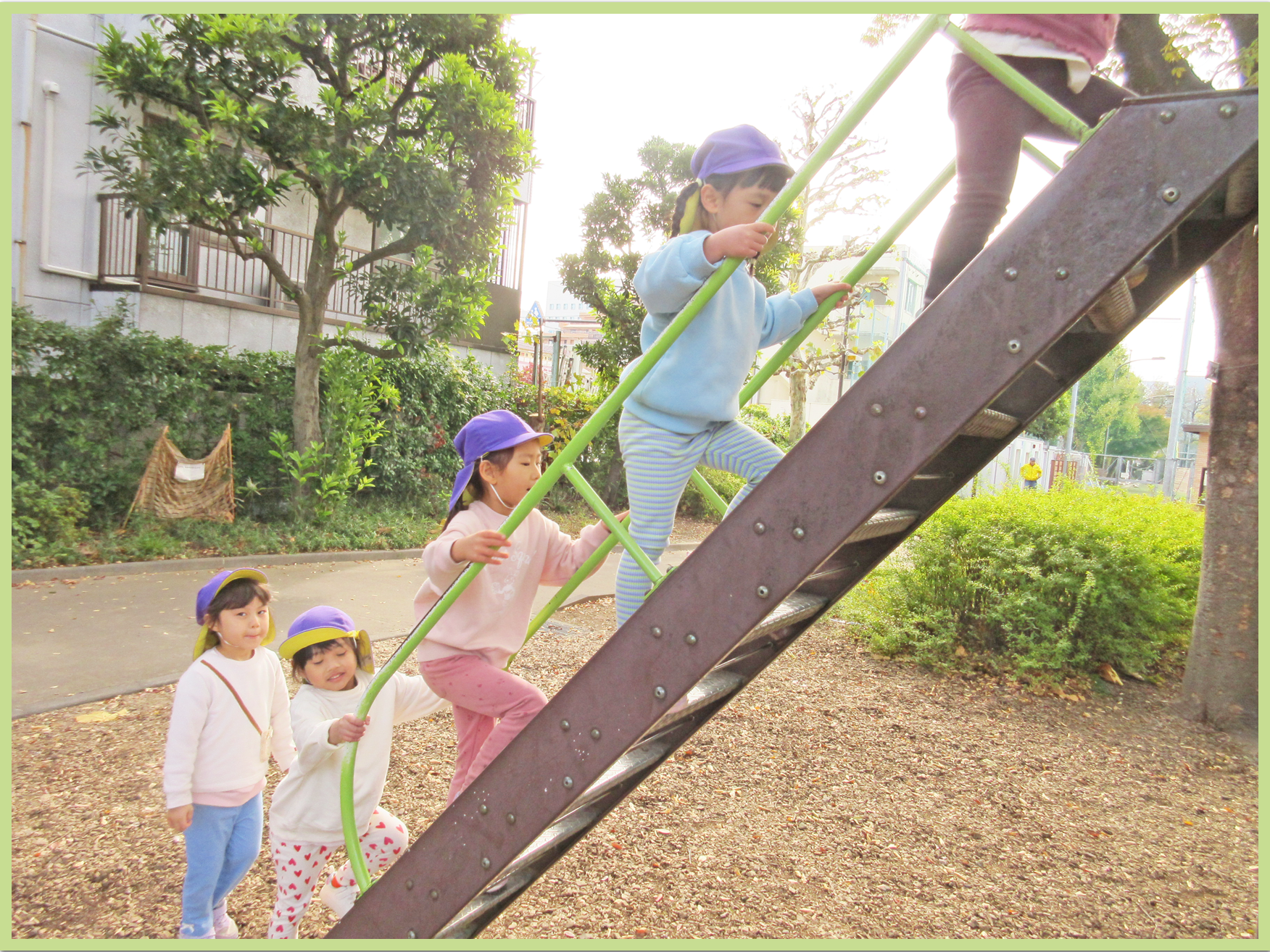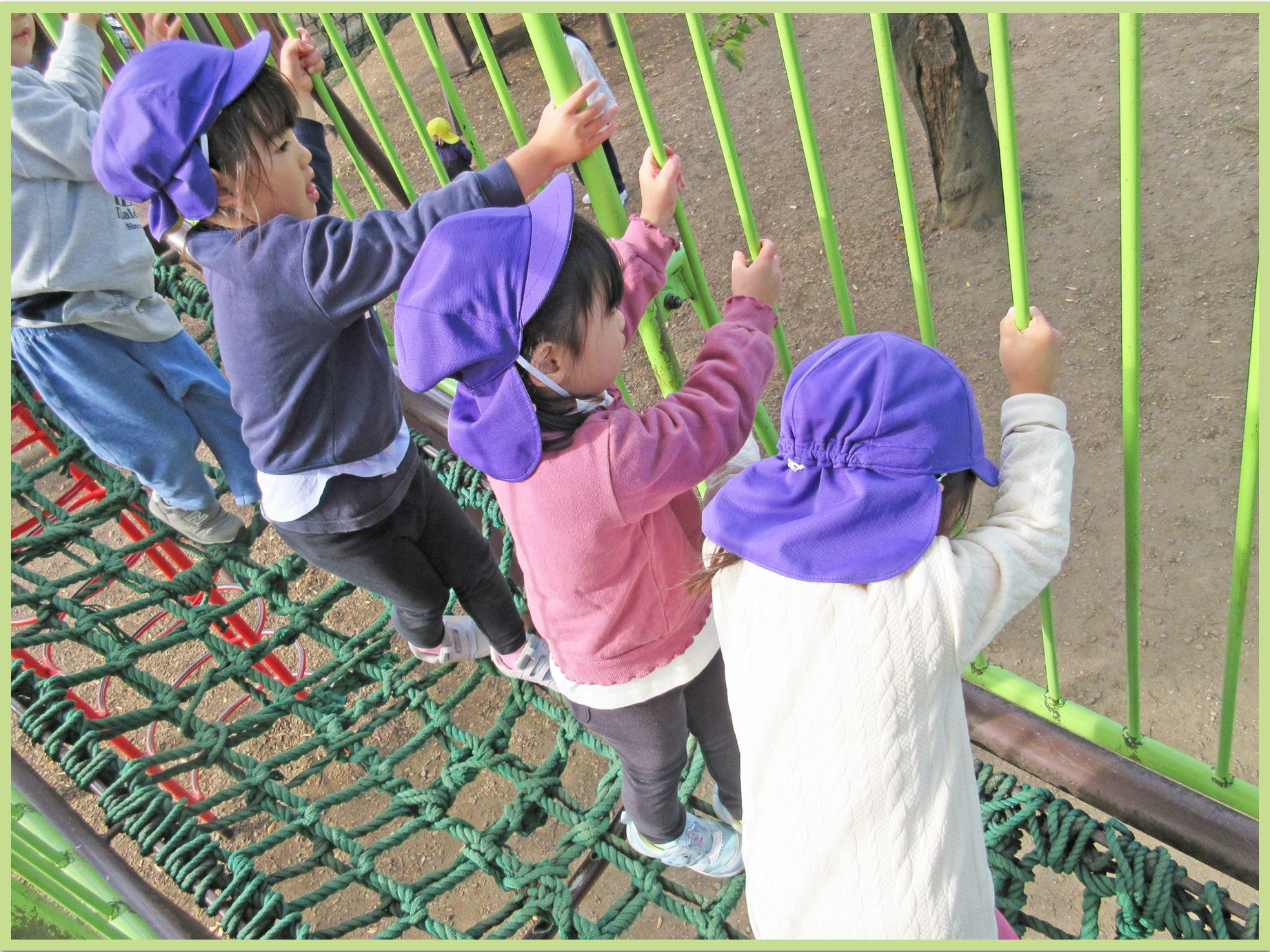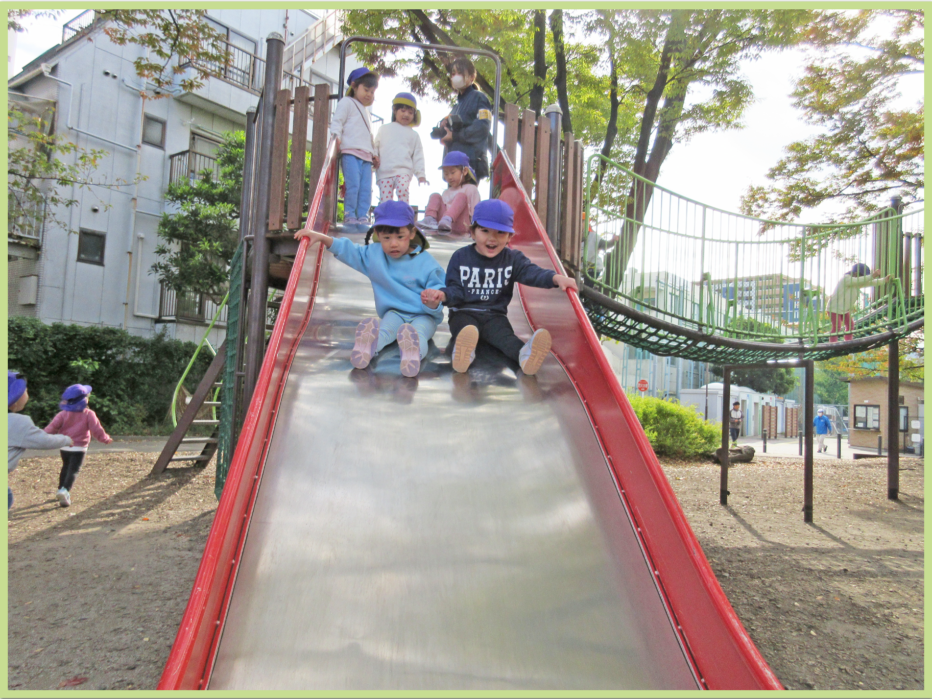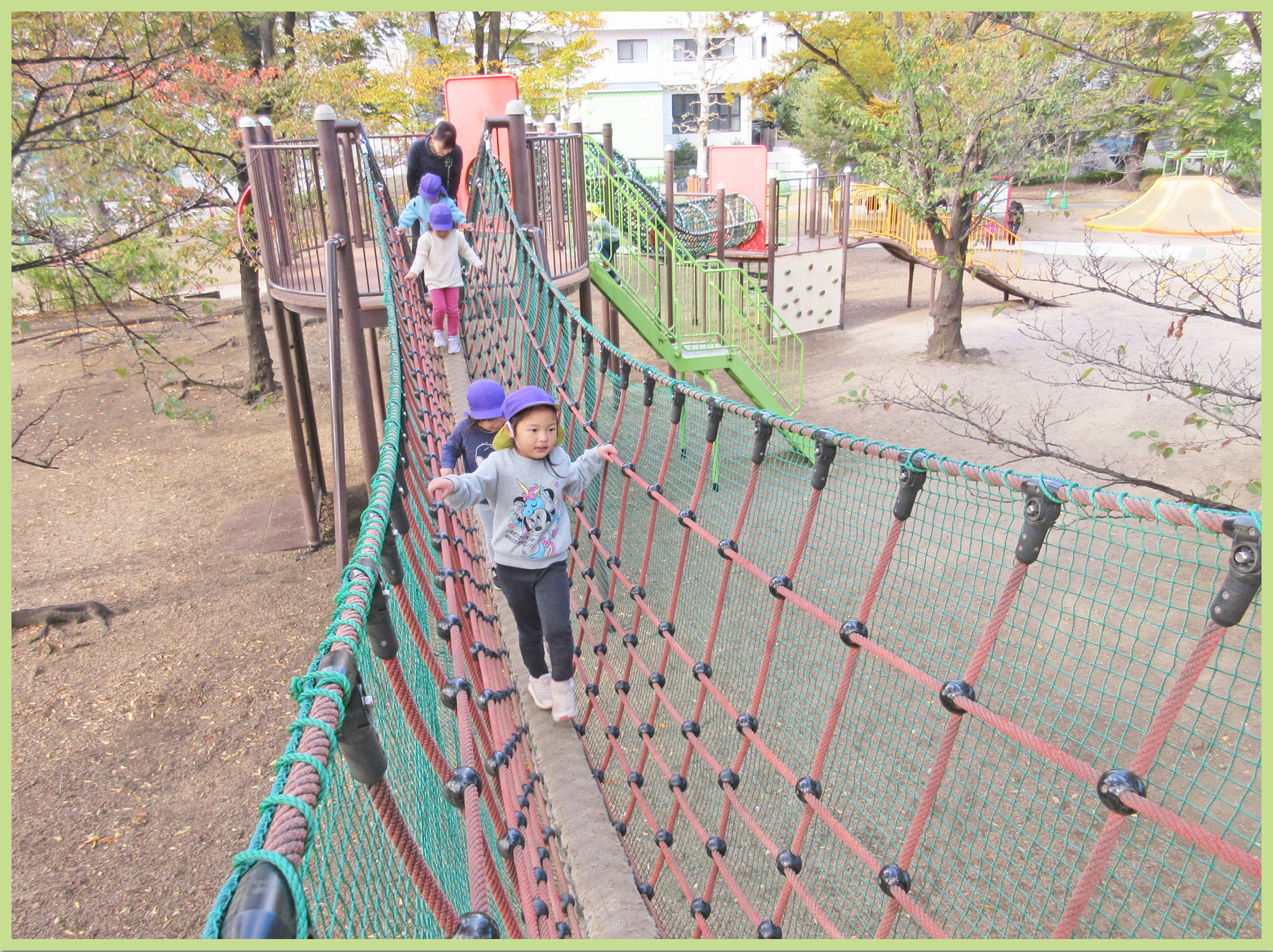 今日の遠足の日をずっと楽しみにしていたこどもたち。公園までの道中はお弁当の中身の話で盛り上がっていました。公園では主に遊具で遊びました。吊り橋を渡る際には「ゆらゆらするー」と言いながら両手でしっかりと綱をつかみ慎重に歩いていました。幅の広い大きな滑り台では、お友だちと一緒に「いっせーのせー」と言いながら何度も滑って楽しんでいました。