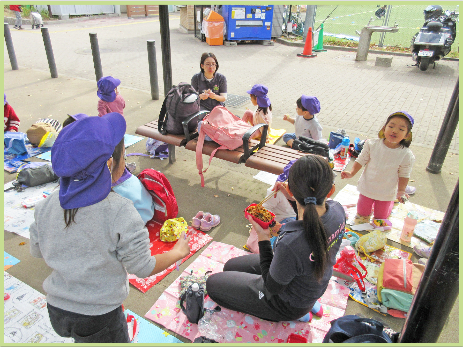 その後は公園内を探検して、楽しみにしていたお弁当を食べました。「ウインナー、一緒だね」「サンドイッチだよ。見てー」などと言いながらお友だちと見せ合って美味しそうに食べていました。たくさん遊んだので帰り道は疲れた様子でしたが、保育園まで頑張って歩くことができました。