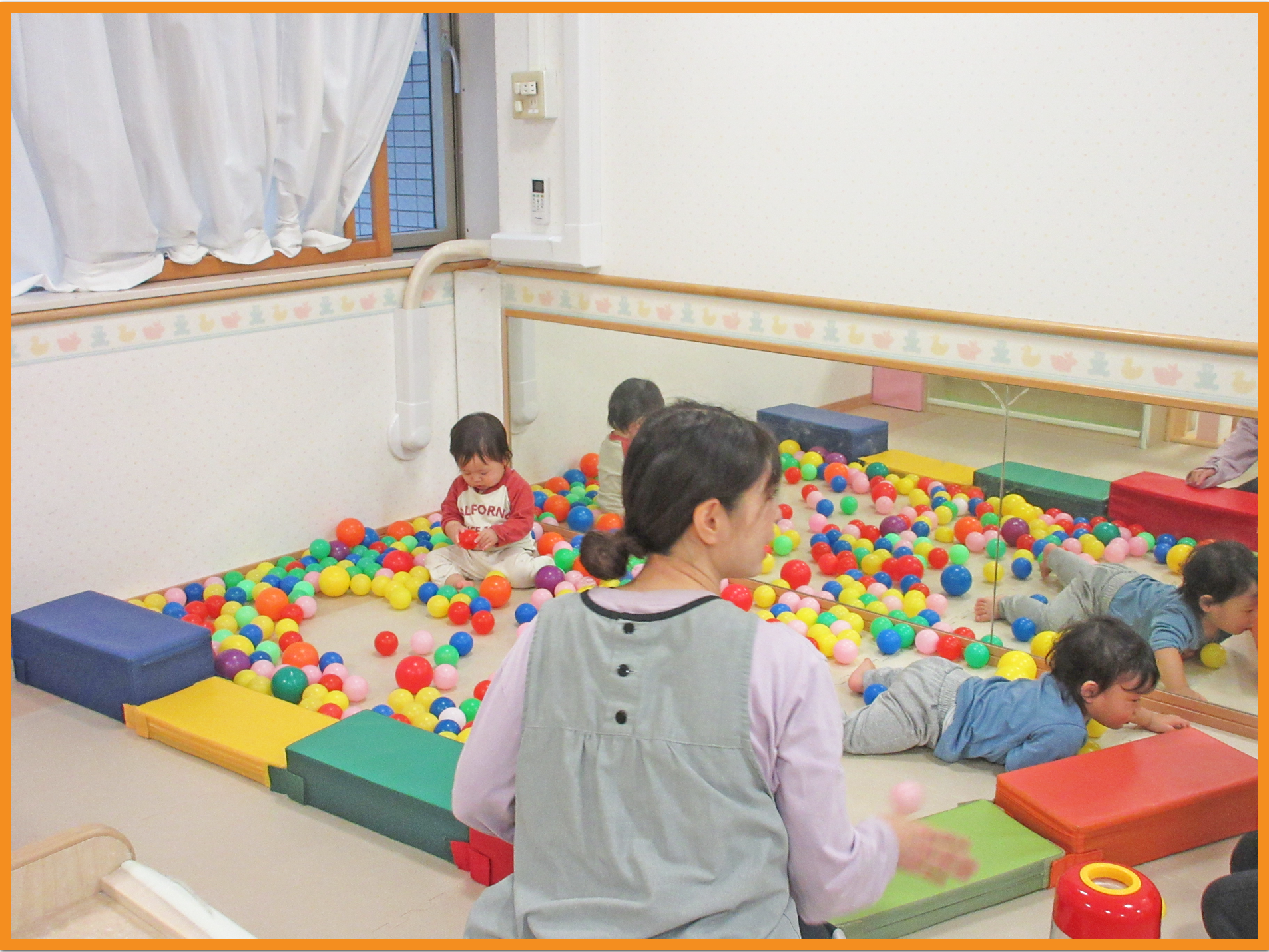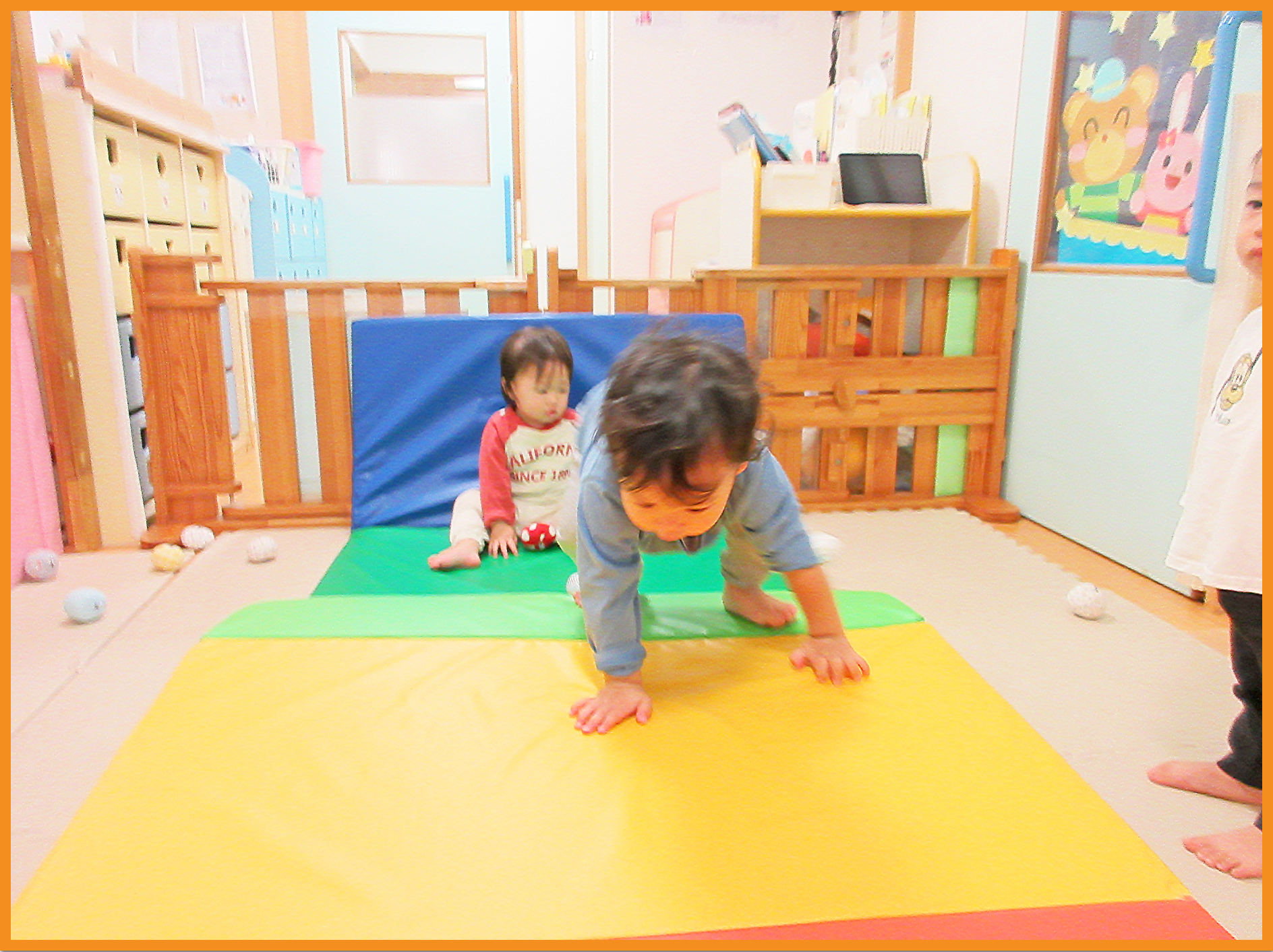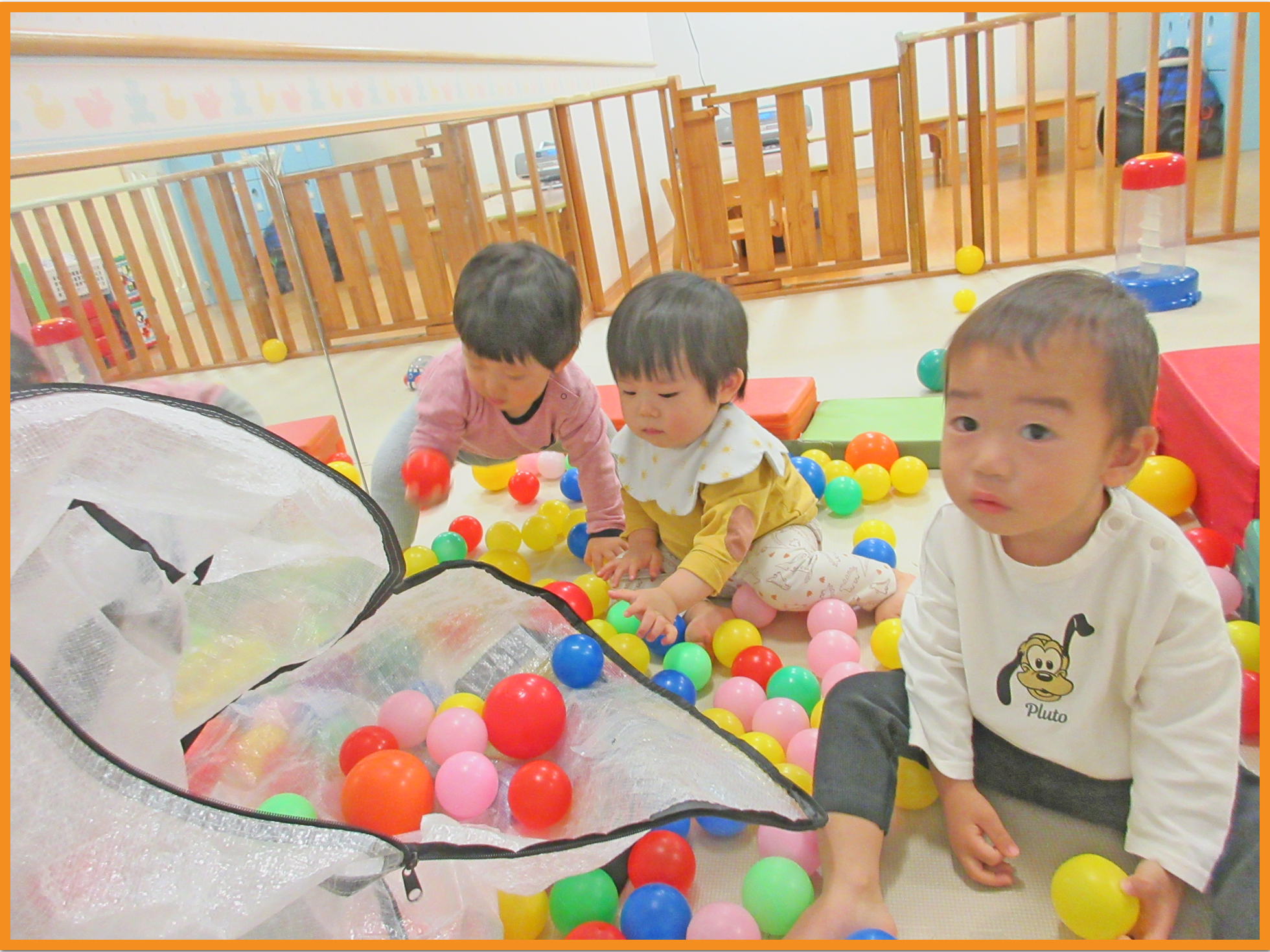 今日は、保育園体験の方が遊びに来てくれたので、一緒に室内でマット遊びとボールプールで遊びました。最初はマットを平らにしながらその上を歩行や這い這いで進んでいき体を動かしていましたが、しばらく遊んだ後に形を変化させてトンネルや山越えのように斜面を作って遊びました。トンネル遊びでは、こどもたちが自分から中に入っていき。反対側にいる保育者や友だちに「ばぁ」と顔をのぞかせてニコニコの笑顔を見せていました。山越え遊びでは、足腰に力を入れてバランスを取り元気に遊べていました。ボールプールでは、ボールをつかんで「ポーン」と投げたり、追いかけたりしている姿が見られました。保育者がボール色を「あか」「あお」など「りんごがゴロゴロ」の歌に合わせて実物を見せて伝えると興味津々に見ていました。