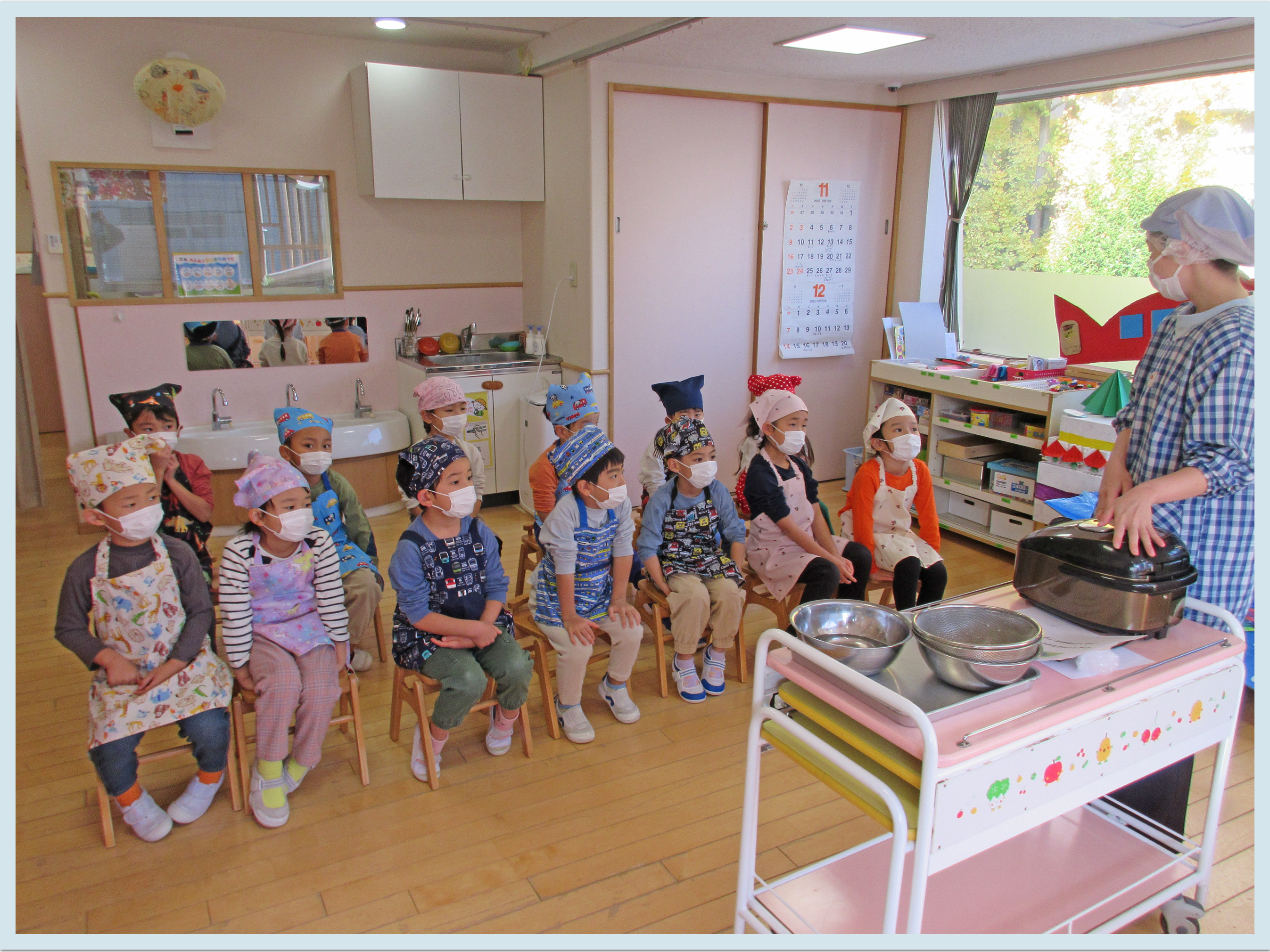 9月に収穫したお米を洗米しました。「お家でのお手伝いでやっているよ」という子も多く、手慣れた手つきでお米を洗っていました。その日の給食でみんなが洗米した白米が出て、「いつもよりおいしい気がする」などと言いながら、美味しく食べていました。5月に苗を植えてから早7か月、やっと食べられた白米に感謝の気持ちを持つこどもたちでした。