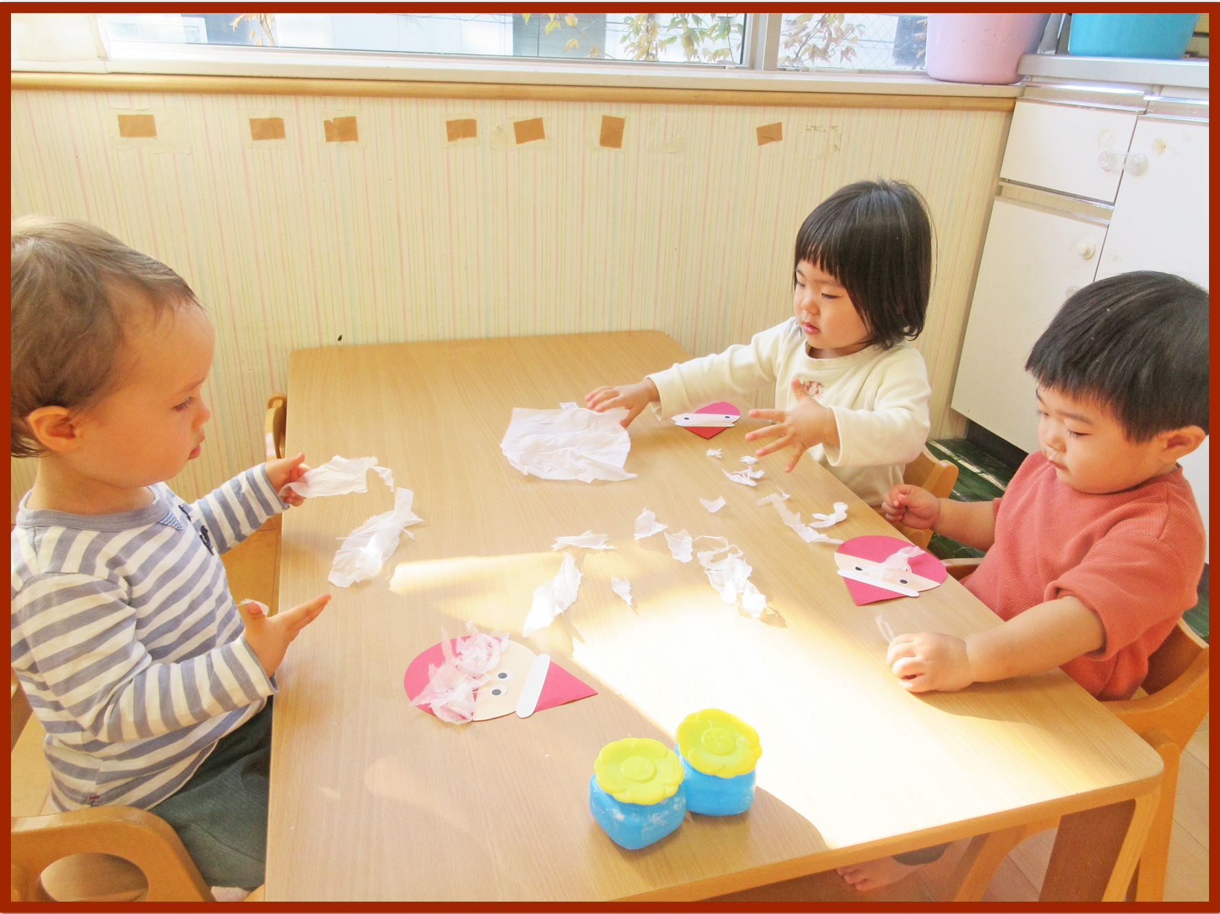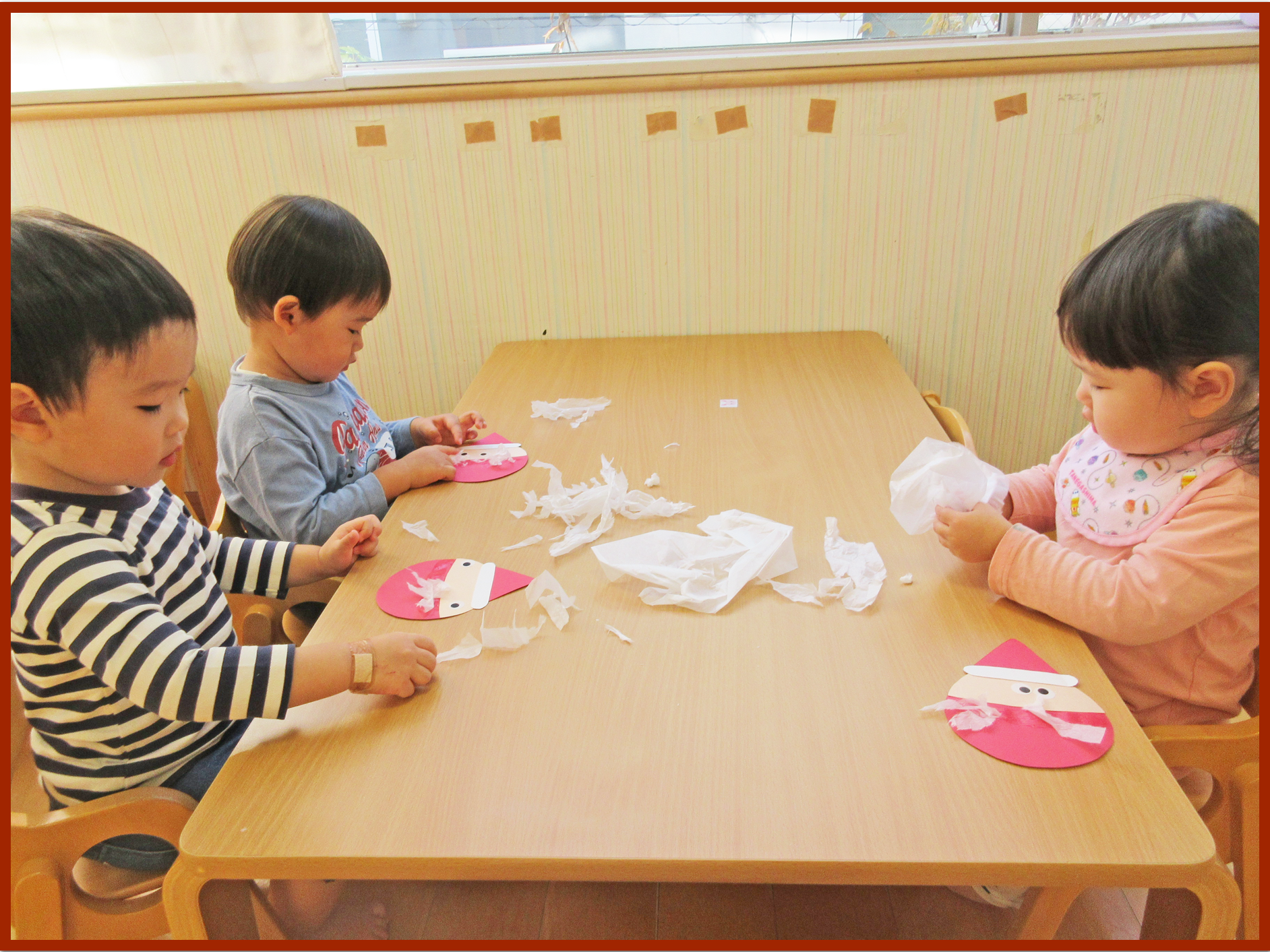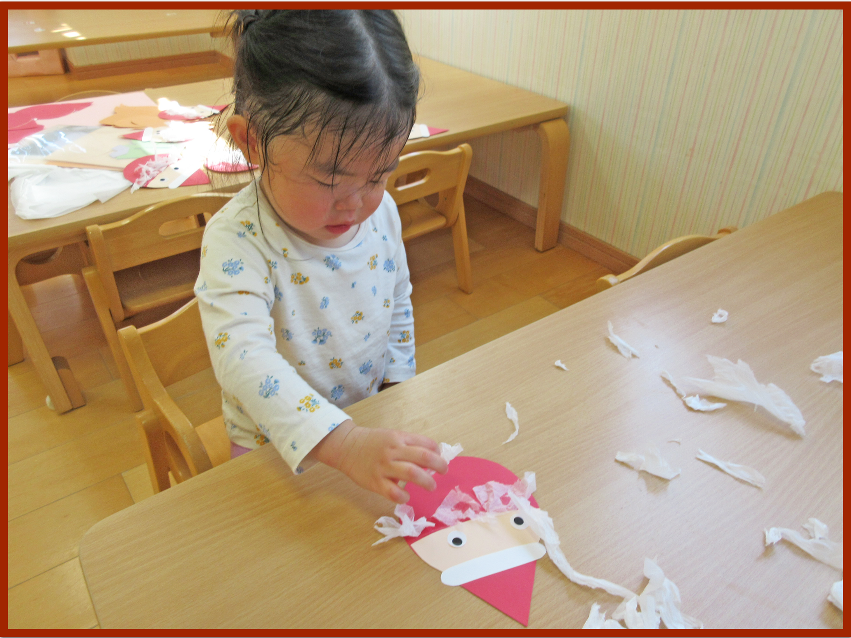 12月の製作を行いました。サンタさんのおひげは、花紙をちぎって糊で付けて再現しました。花紙を小さく上手にちぎって、「ここにつける」「ぺったんしたよ」などとお話ししながら、とても素敵なサンタさんが完成しました。みんな楽しんで製作を行っていました。