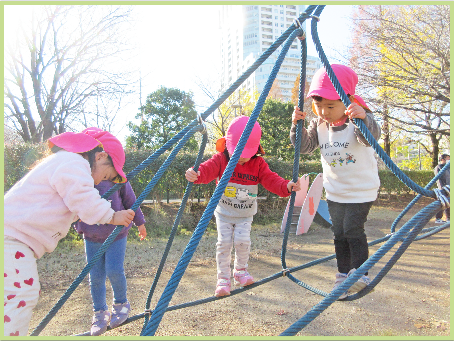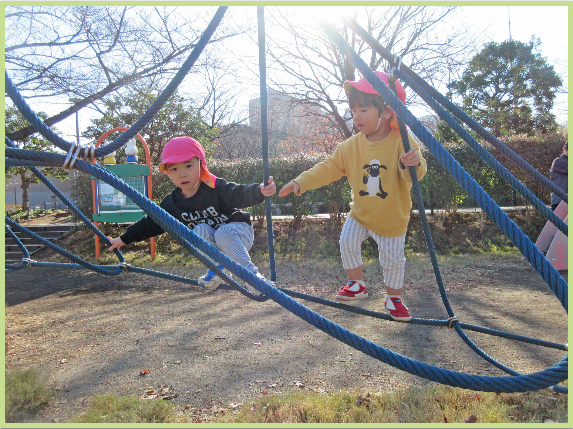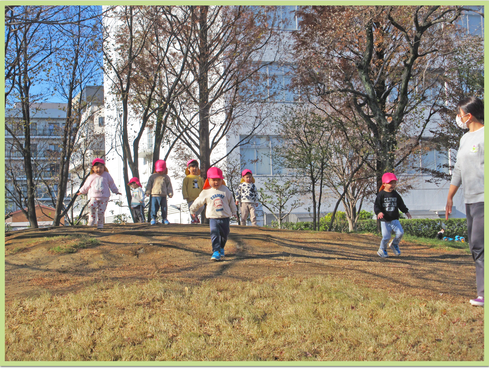 到着すると「何をしてあそぼうかな」とわくわくした表情を見せるこどもたち。ピラミットタワーでは、「登れるよ」と保育者に伝え、挑戦していました。登ることができると、「やった」と言いながらとても嬉しそうにしていました。築山では、根っこを「かぶ」に見立てて「うんとこしょ、どっこいしょ」とみんなで言いながら「大きなかぶ」遊びを始めたり、好きな遊具遊びをしたり、元気いっぱいに遊びました。
