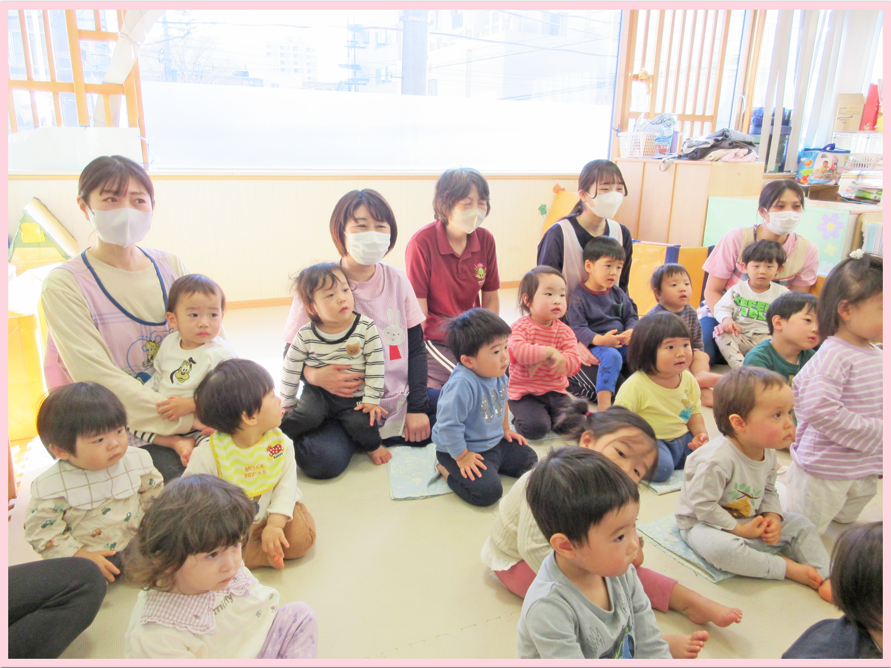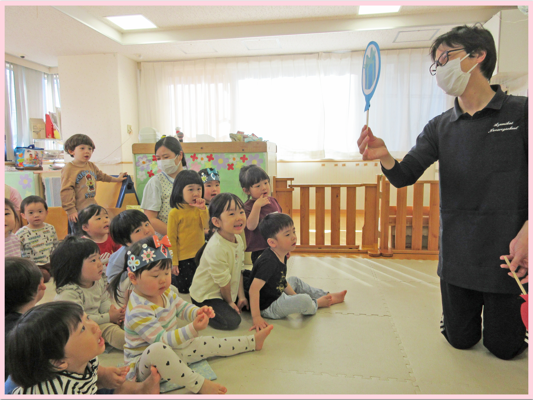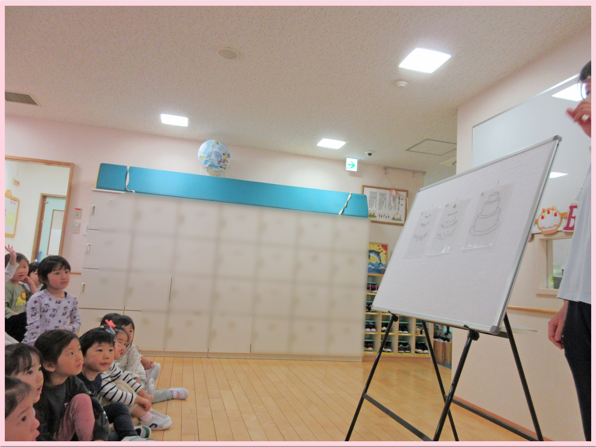 乳児クラスは風船のペープサート、幼児クラスは重ね絵クイズの出し物をみんなで楽しみながらお祝いをしました。