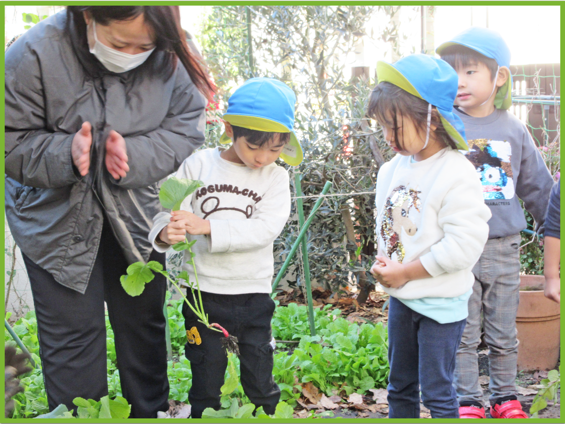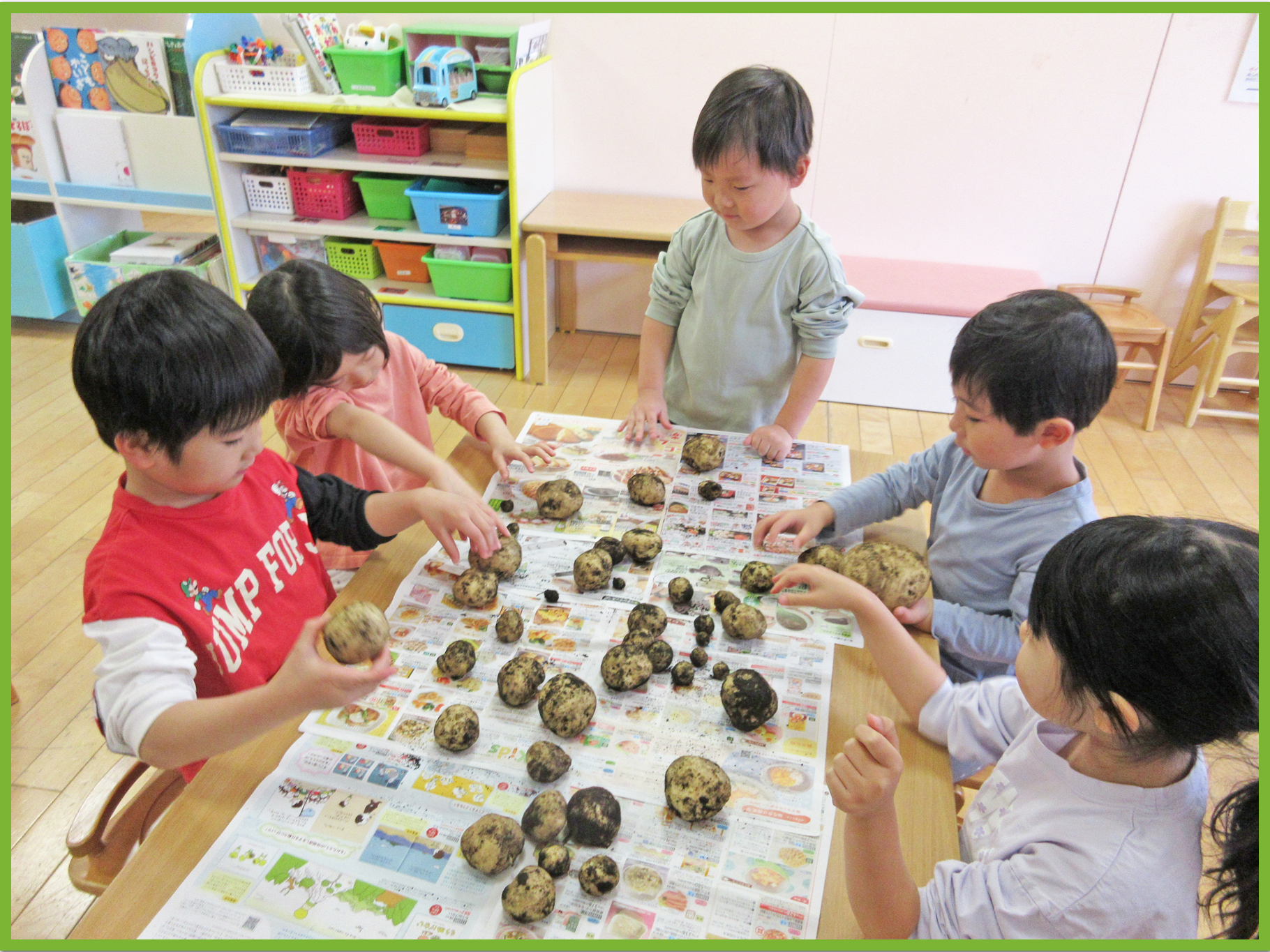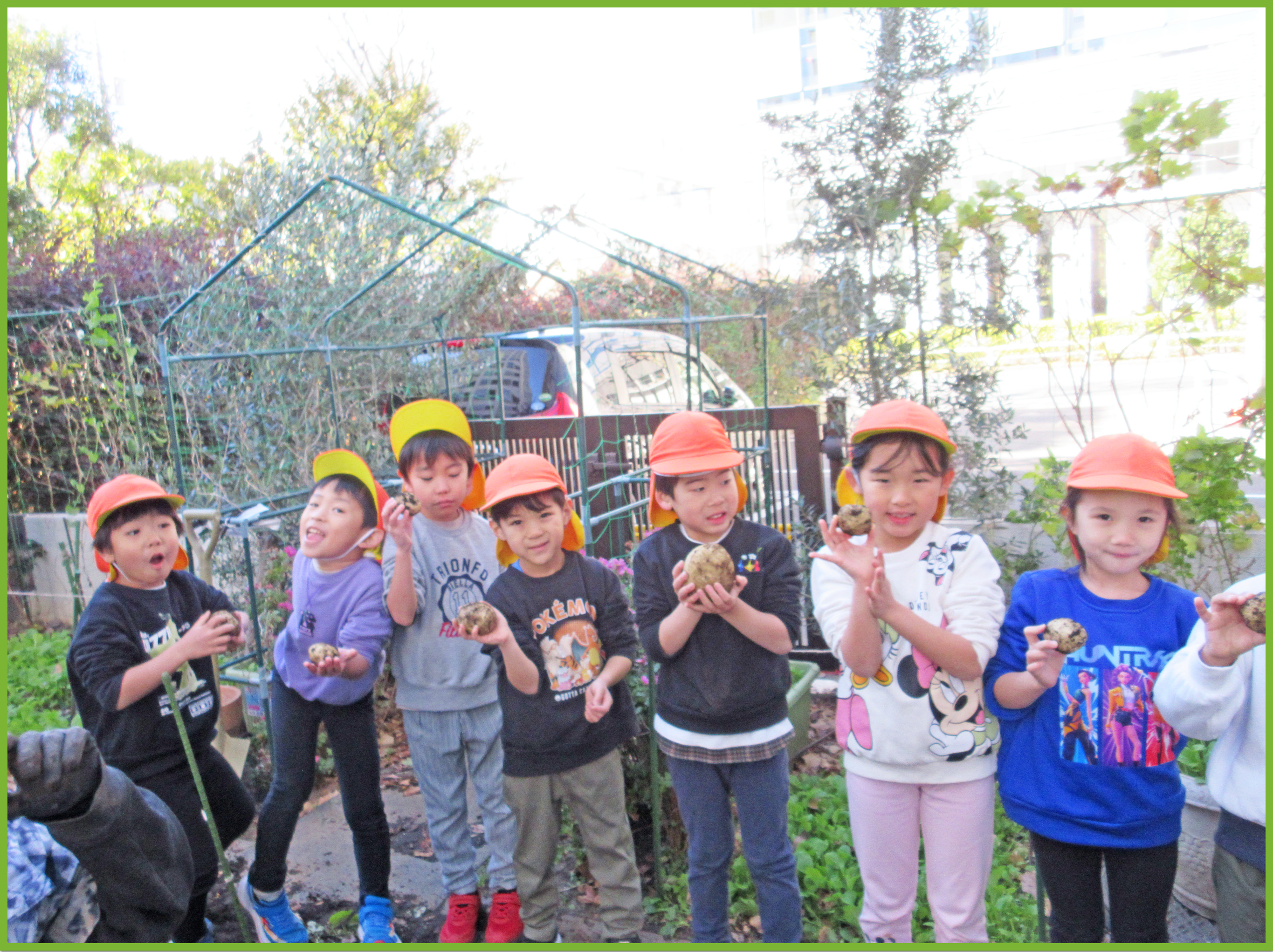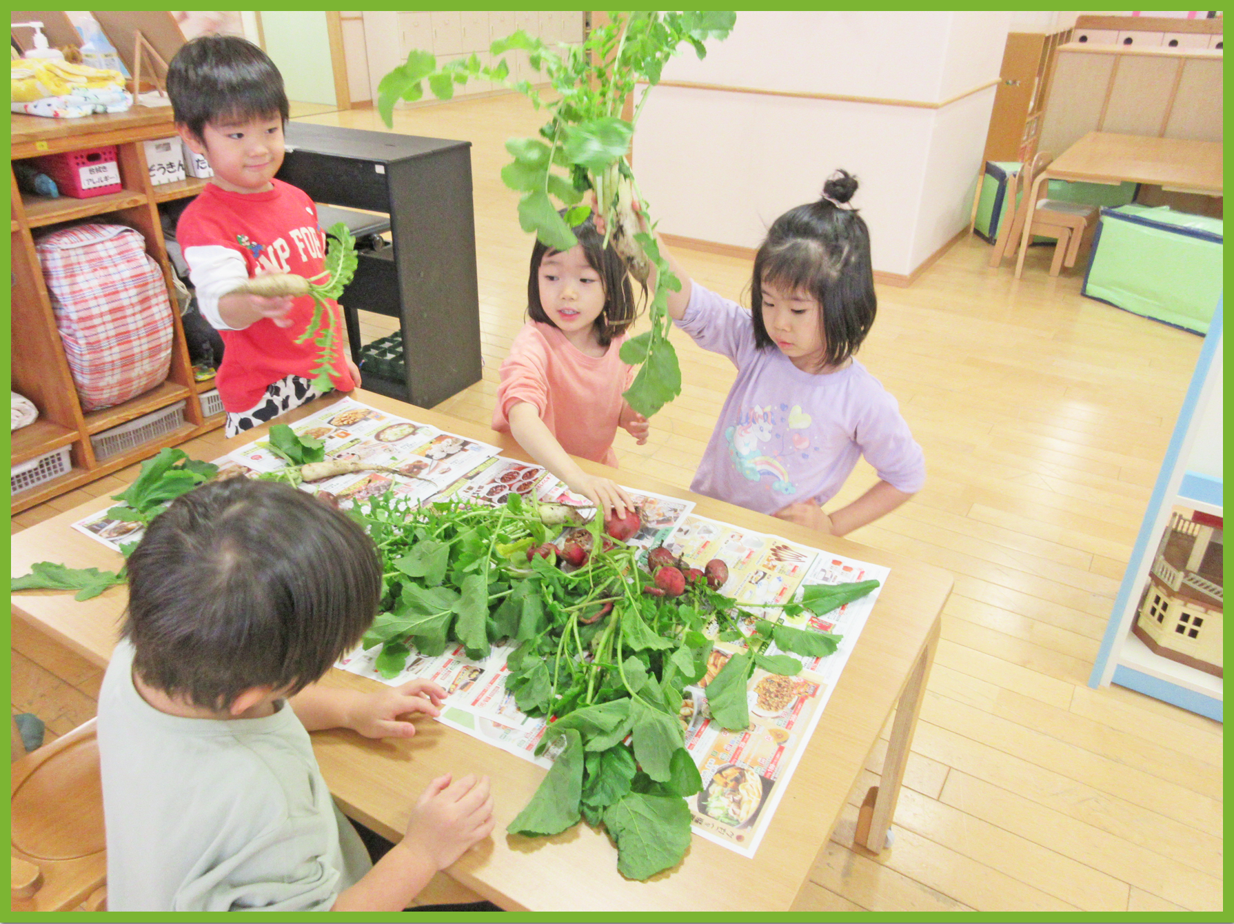 今日はそら組とたいよう組でゆうゆうプラザへじゃがいも掘りに行きました。みんなで植えたじゃがいもがどのくらい育ったか興味津々のこどもたち。たいよう組が行っている間そら組の子は「どのくらい大きいのかな」等と会話しながら楽しみに待っていました。実際に掘る際には、ゆうゆうプラザの職員の方がある程度掘り起こしてくれたので、こどもたちは土から出てきたじゃがいもを見つけて「あった、あった」と喜びながら収穫していました。その後は、ラディッシュと大根を収穫させてもらいました。一人一株ずつ収穫体験ができて、とても嬉しそうでした。保育園に戻ってからは、収穫した大根、ラディッシュ、じゃがいもをテーブルの上に並べて重さを比べたり、大きさや葉の違いを観察したりしました。