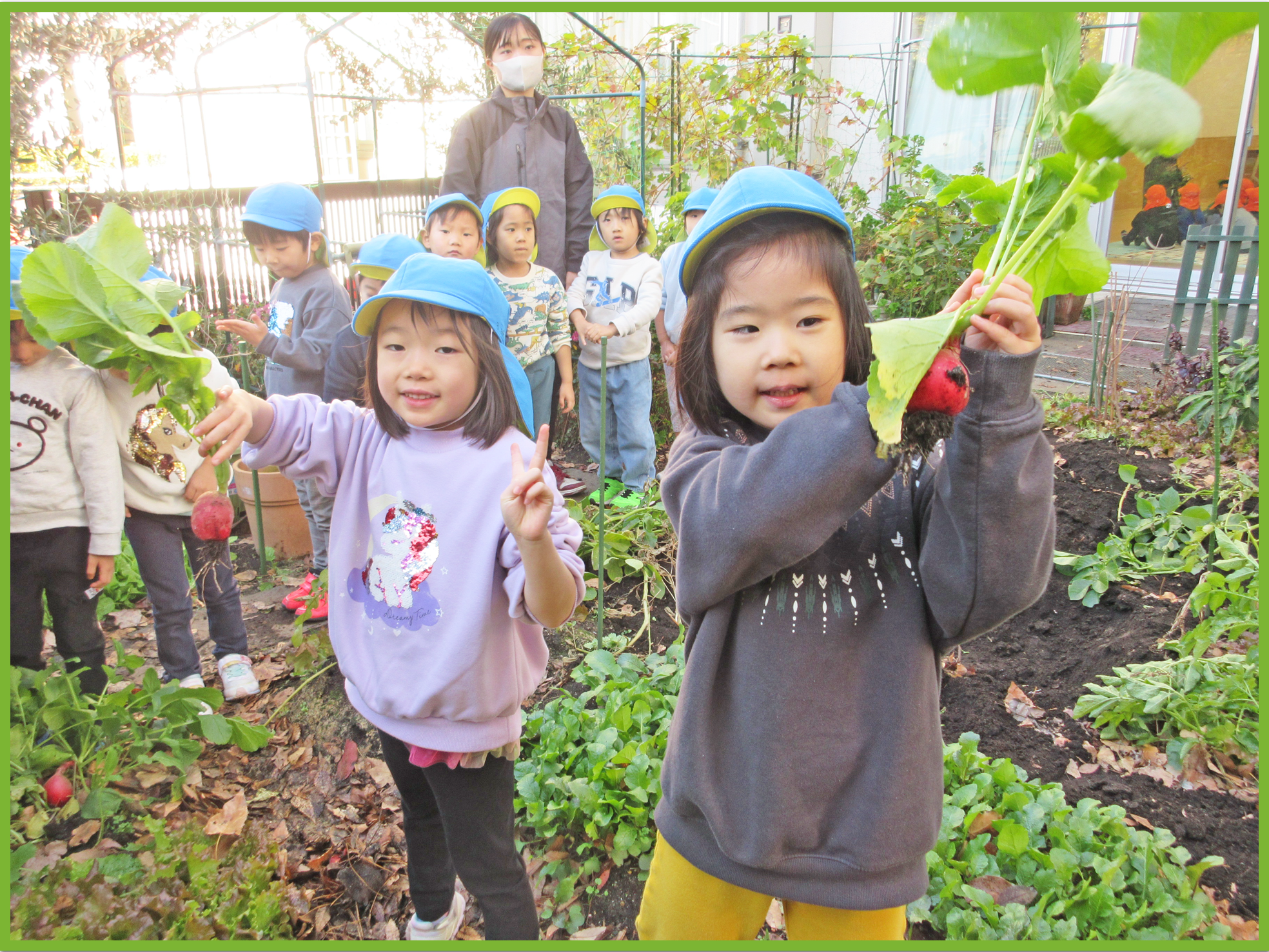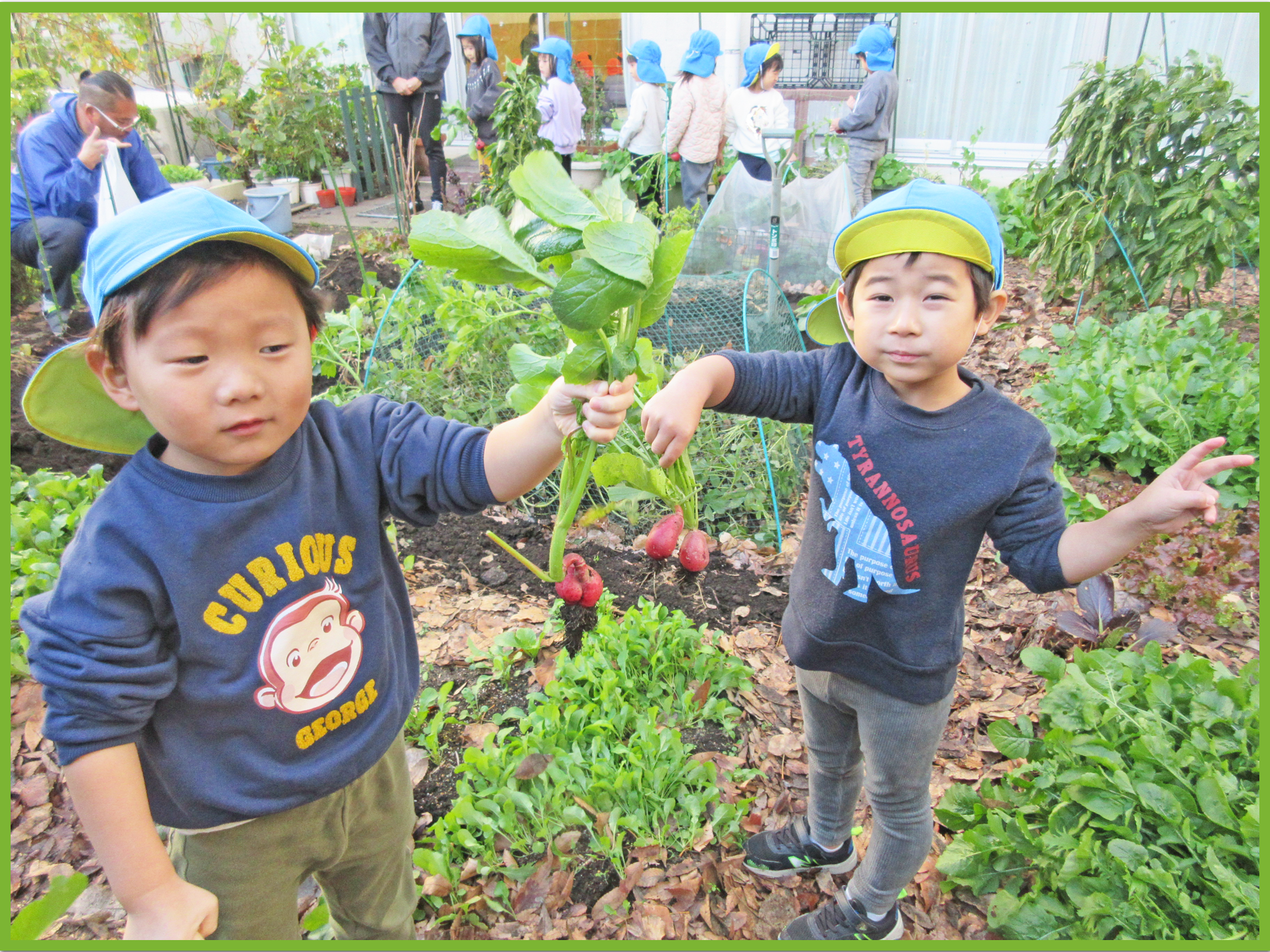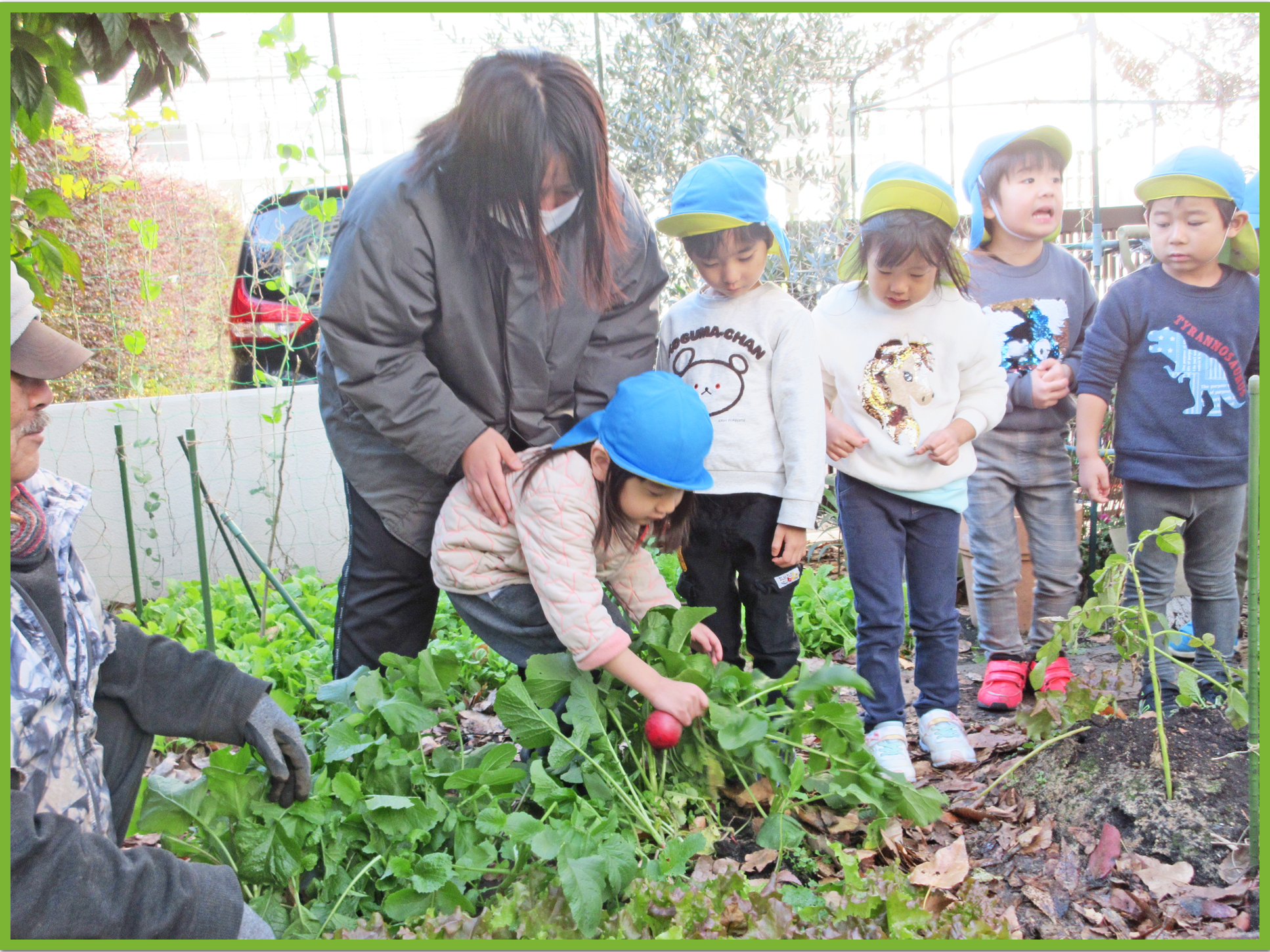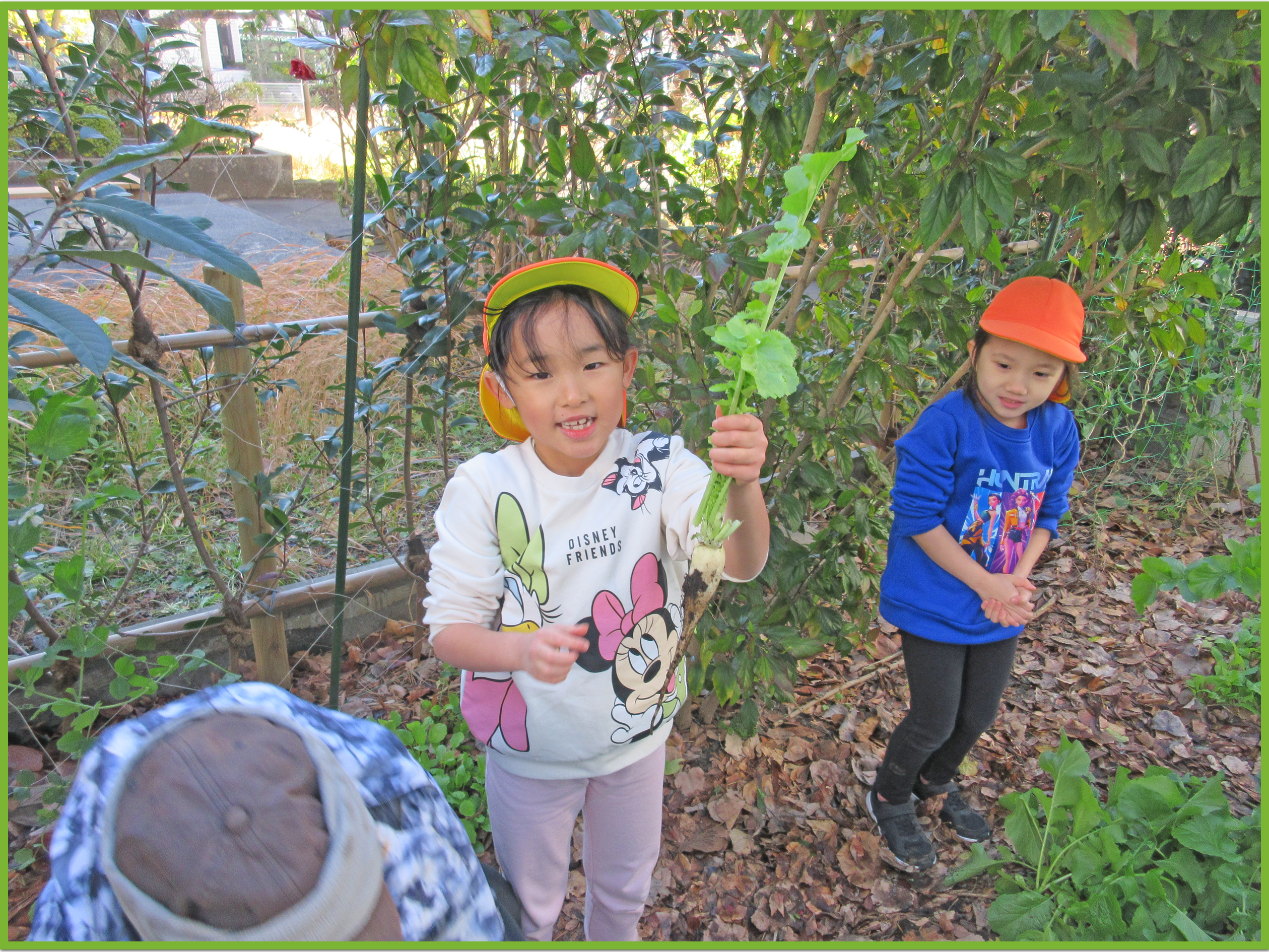 今日はそら組とたいよう組でゆうゆうプラザへじゃがいも掘りに行きました。みんなで植えたじゃがいもがどのくらい育ったか興味津々のこどもたち。たいよう組が行っている間そら組の子は「どのくらい大きいのかな」等と会話しながら楽しみに待っていました。実際に掘る際には、ゆうゆうプラザの職員の方がある程度掘り起こしてくれたので、こどもたちは土から出てきたじゃがいもを見つけて「あった、あった」と喜びながら収穫していました。その後は、ラディッシュと大根を収穫させてもらいました。一人一株ずつ収穫体験ができて、とても嬉しそうでした。保育園に戻ってからは、収穫した大根、ラディッシュ、じゃがいもをテーブルの上に並べて重さを比べたり、大きさや葉の違いを観察したりしました。