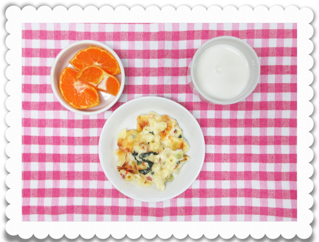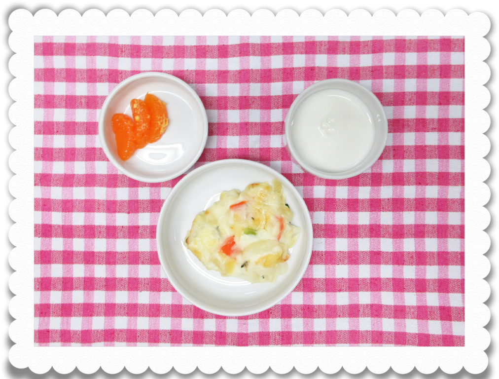 【幼児おやつ】牛乳、マカロニグラタン、果物