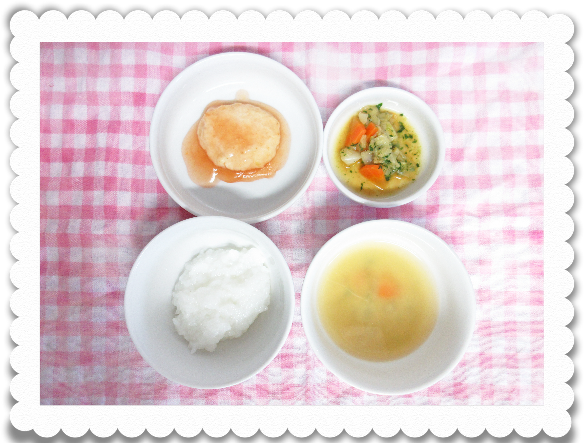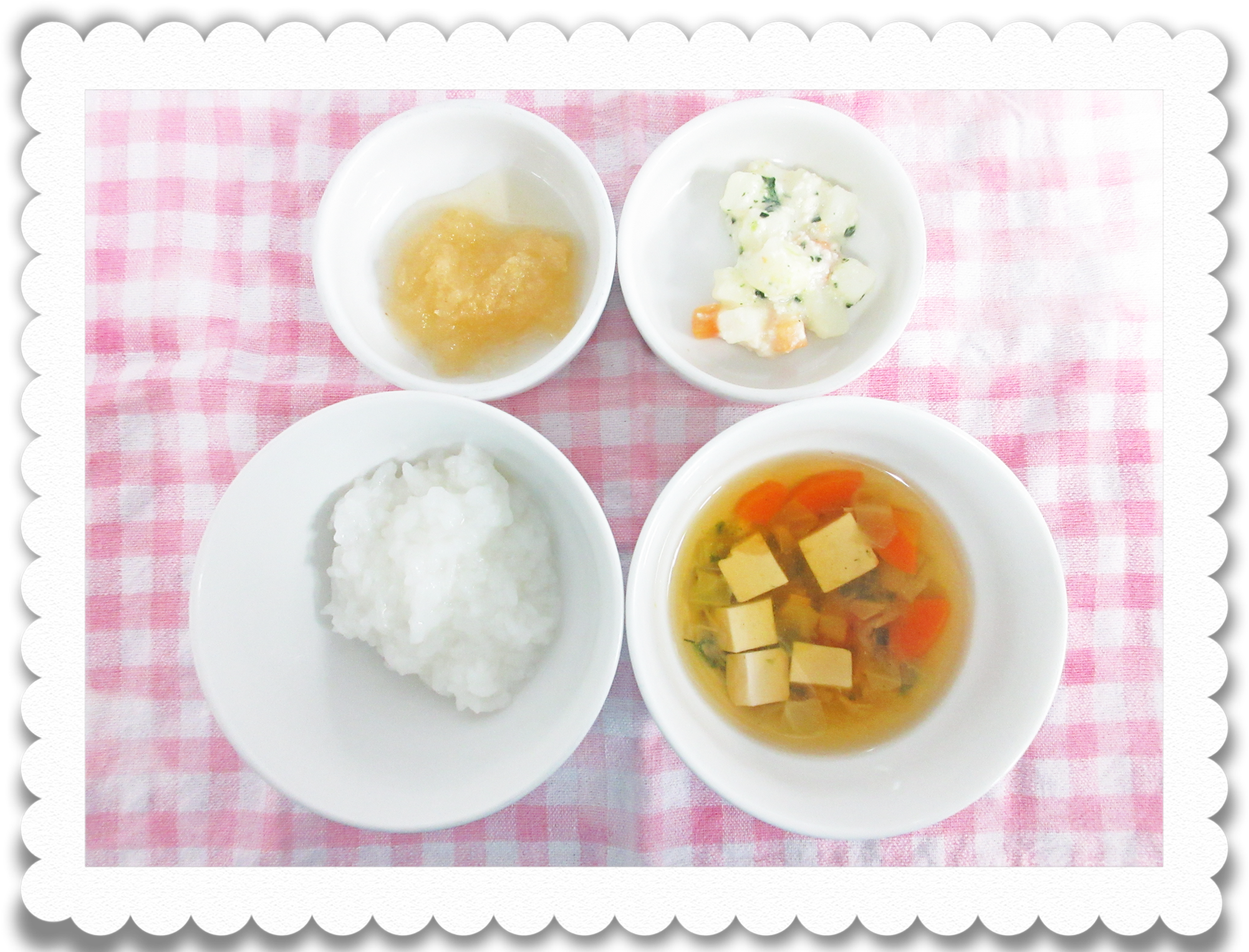 午後食:スープパン粥、ミルク煮、豆腐と人参のスープ、果物