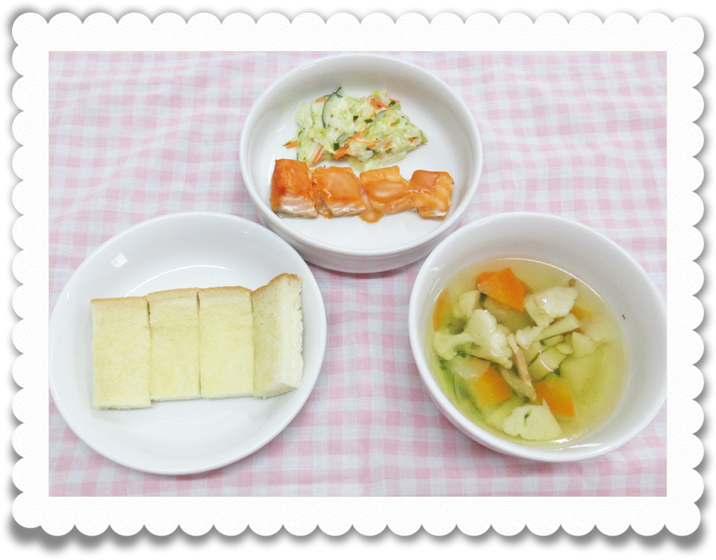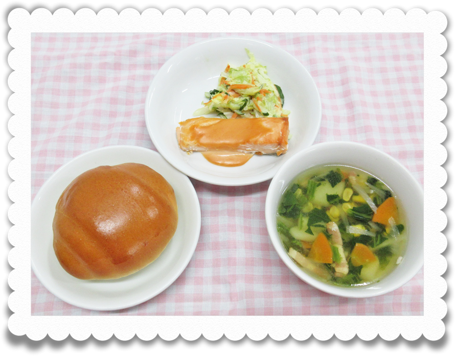 【幼児給食】バターロール、鮭のオーロラソース焼き、コールスロー、ベジタブルスープ