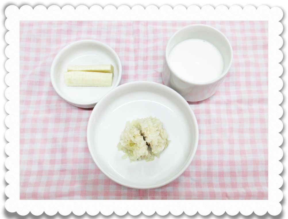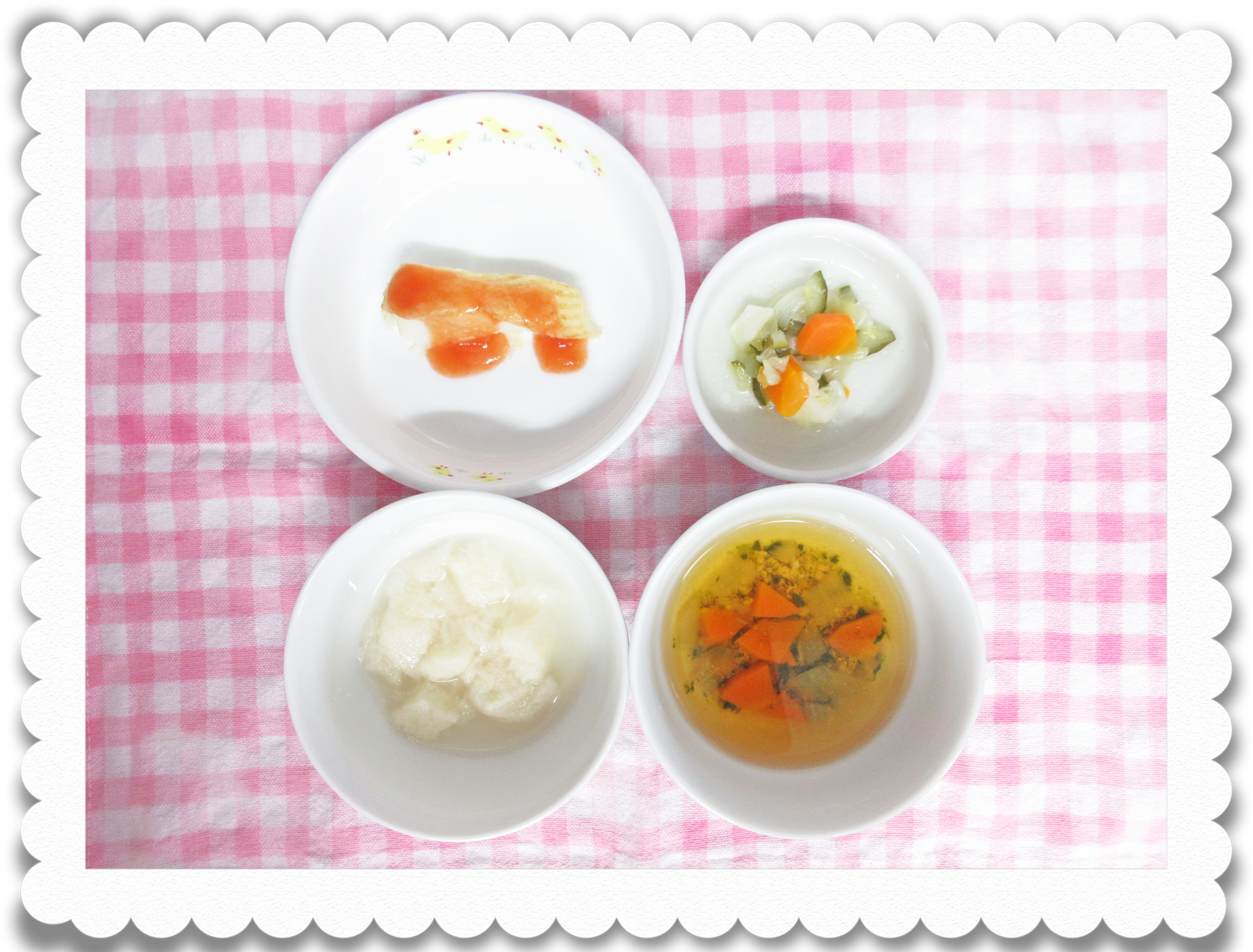 午前食:スープパン粥、白身魚のくず煮、おろし煮、ベジタブルスープ