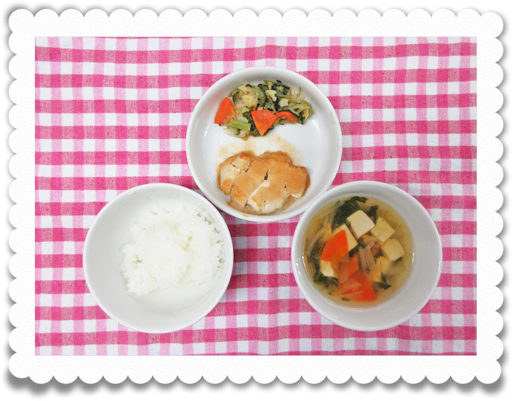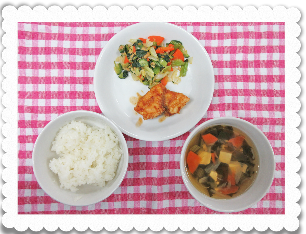 【幼児給食】ご飯、かじき鮪のトマトみそ煮、小松菜サラダ、豆腐スープ