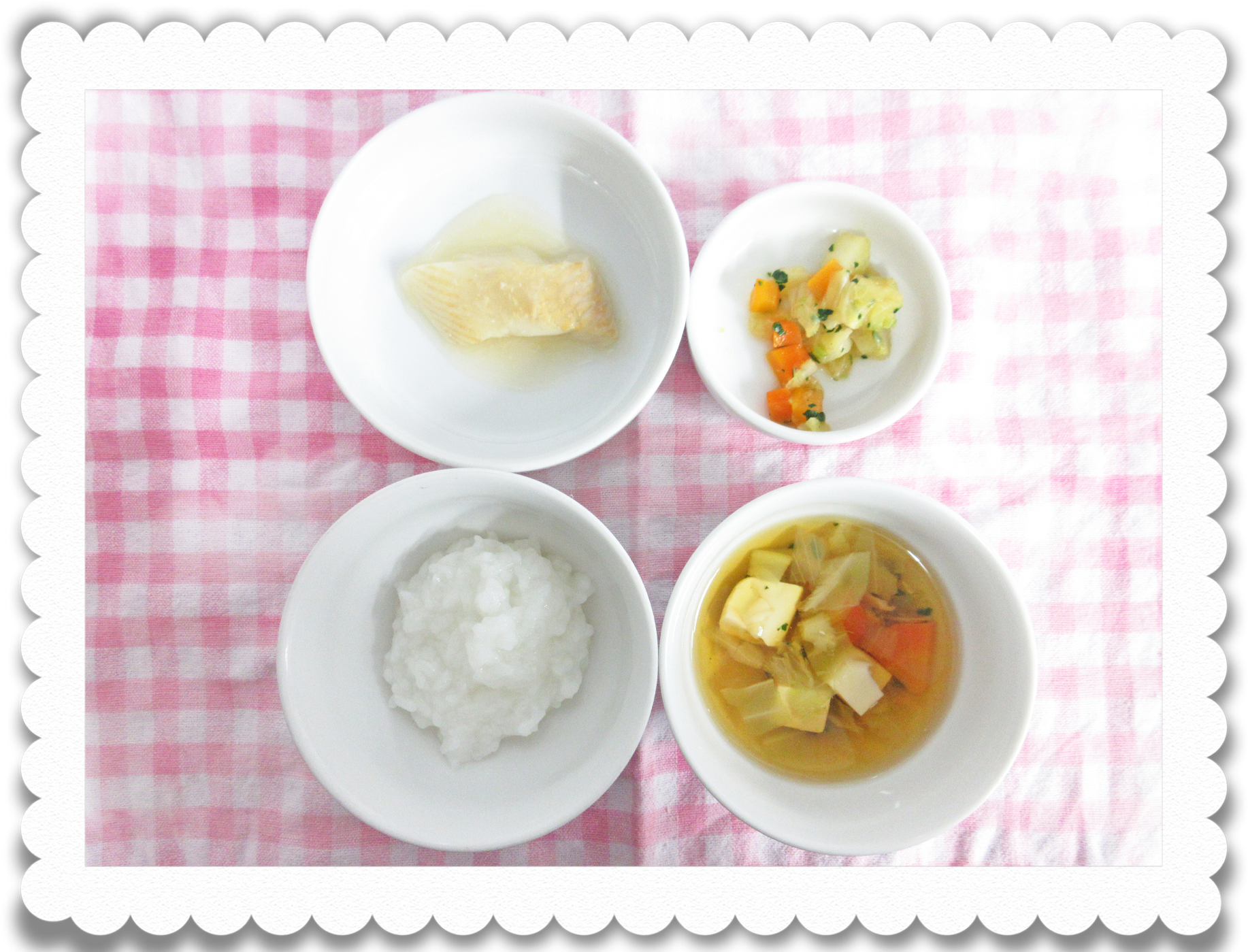 午前食:硬粥、白身魚の味噌煮、煮野菜、豆腐スープ