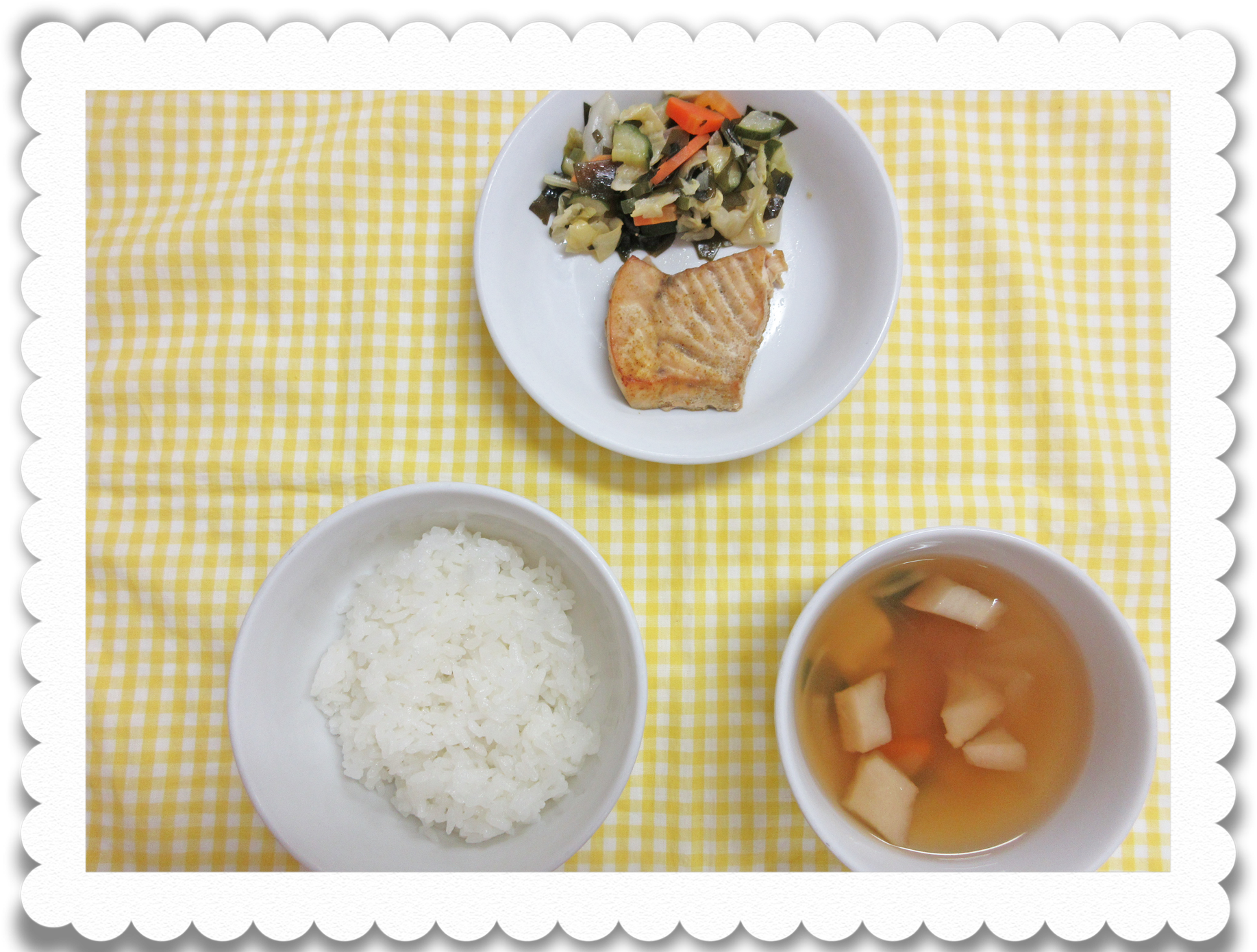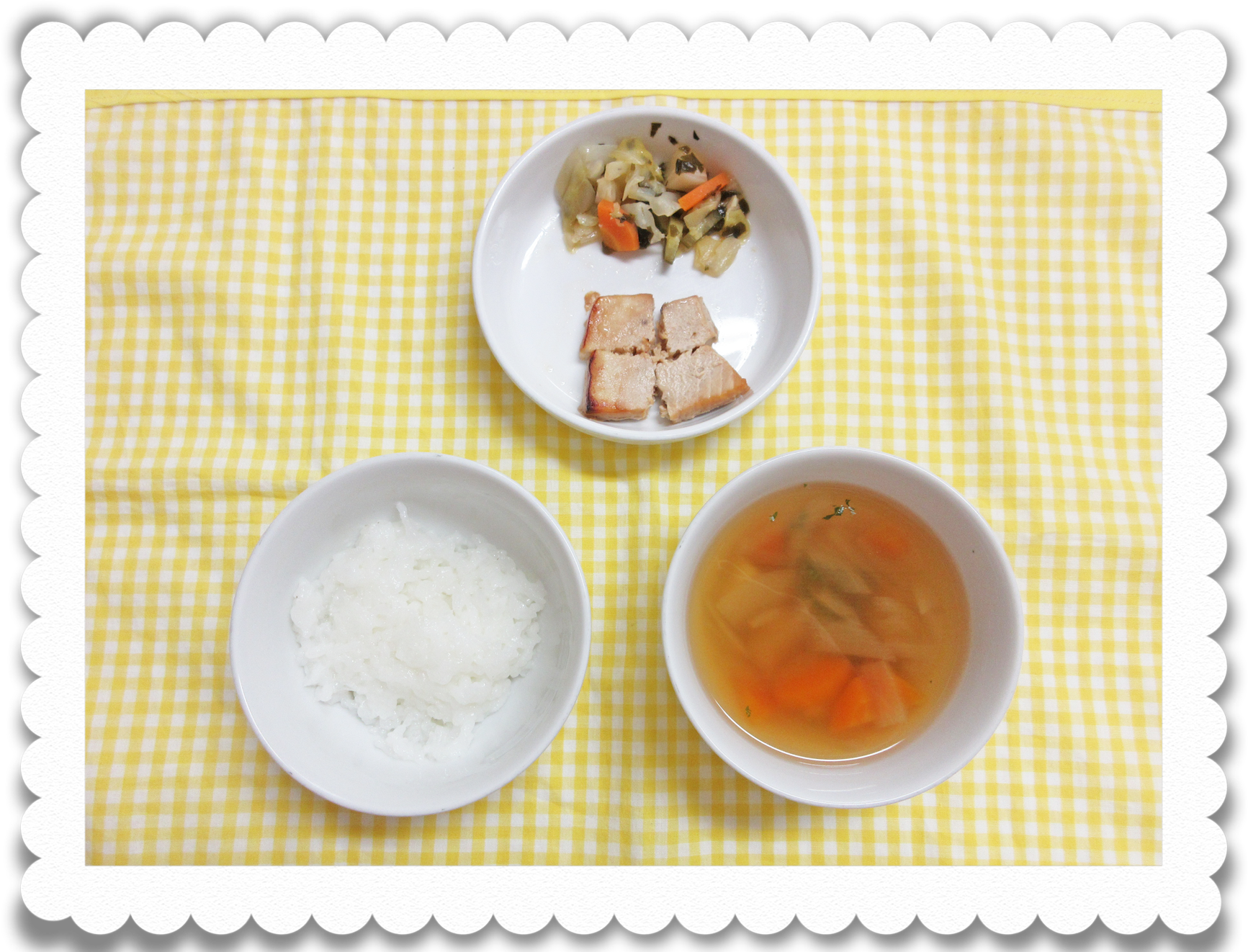 午前食:全粥、白身魚のくず煮、キャベツと人参煮清汁