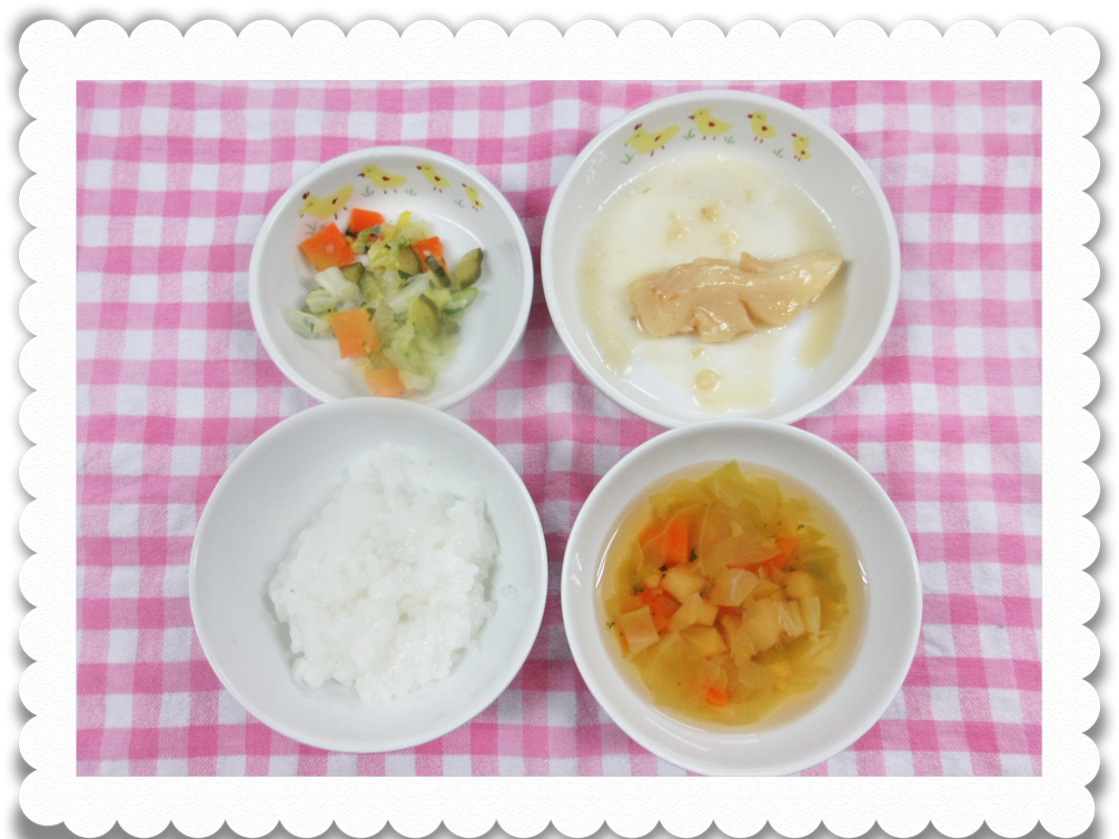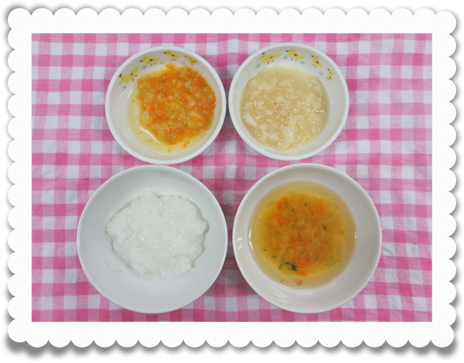 午前食:10倍粥、白身魚のペースト、キャベツと小松菜のうらごし、野菜スープ