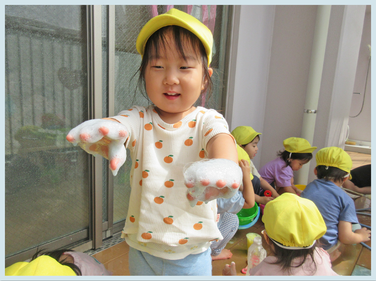 今日はテラスで泡色水遊びをしました。小さな石鹸と色水を入れてかき混ぜると、色付きのモコモコの泡が完成し、「すごーい」「かわいい」と嬉しそうな姿がみられました。