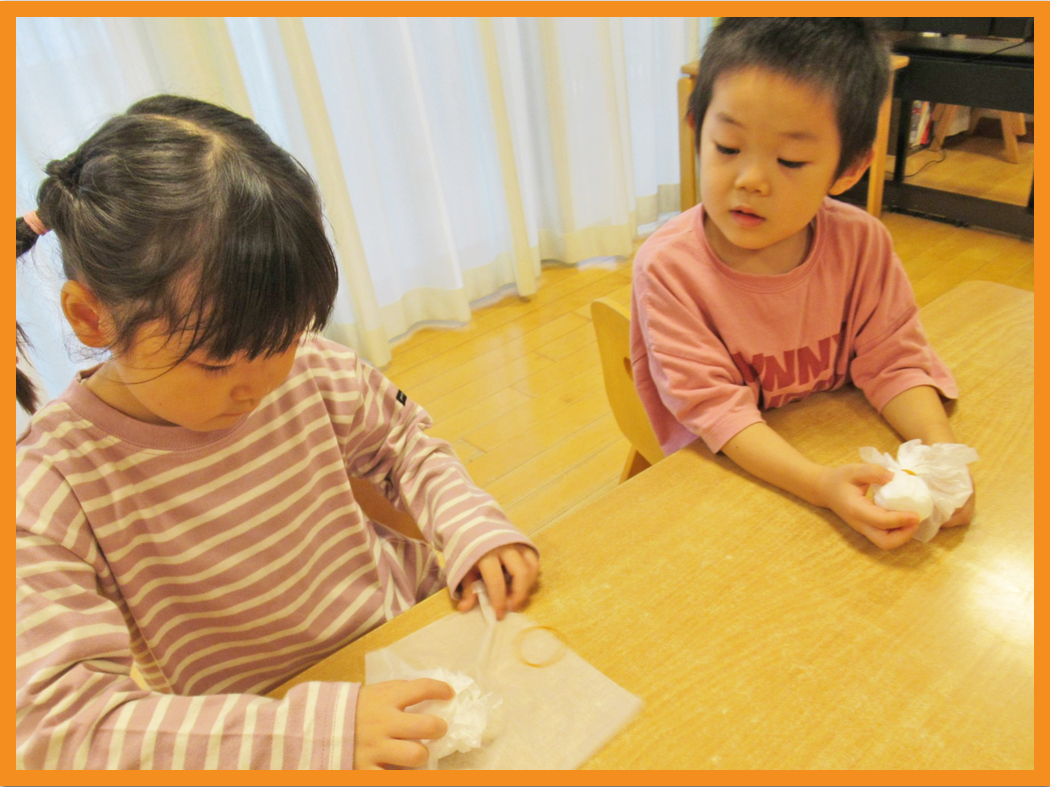 必要な材料を配ると、材料一つひとつに「お願いします!」と手を合わせて晴れることをお願いするこどもたち。まずはお花紙を丸めることに挑戦!「大きい顔がいいかな」や「ドレスみたいにしたいなぁ」と完成を楽しみにしながら愛情を込めて作る姿がありました。