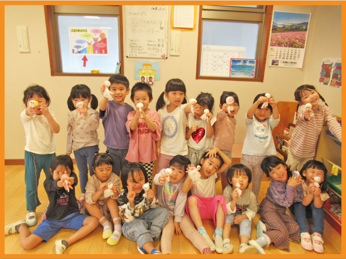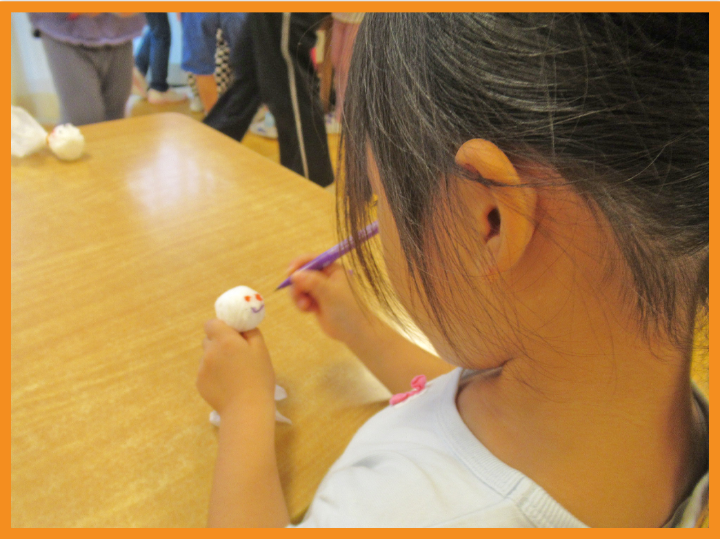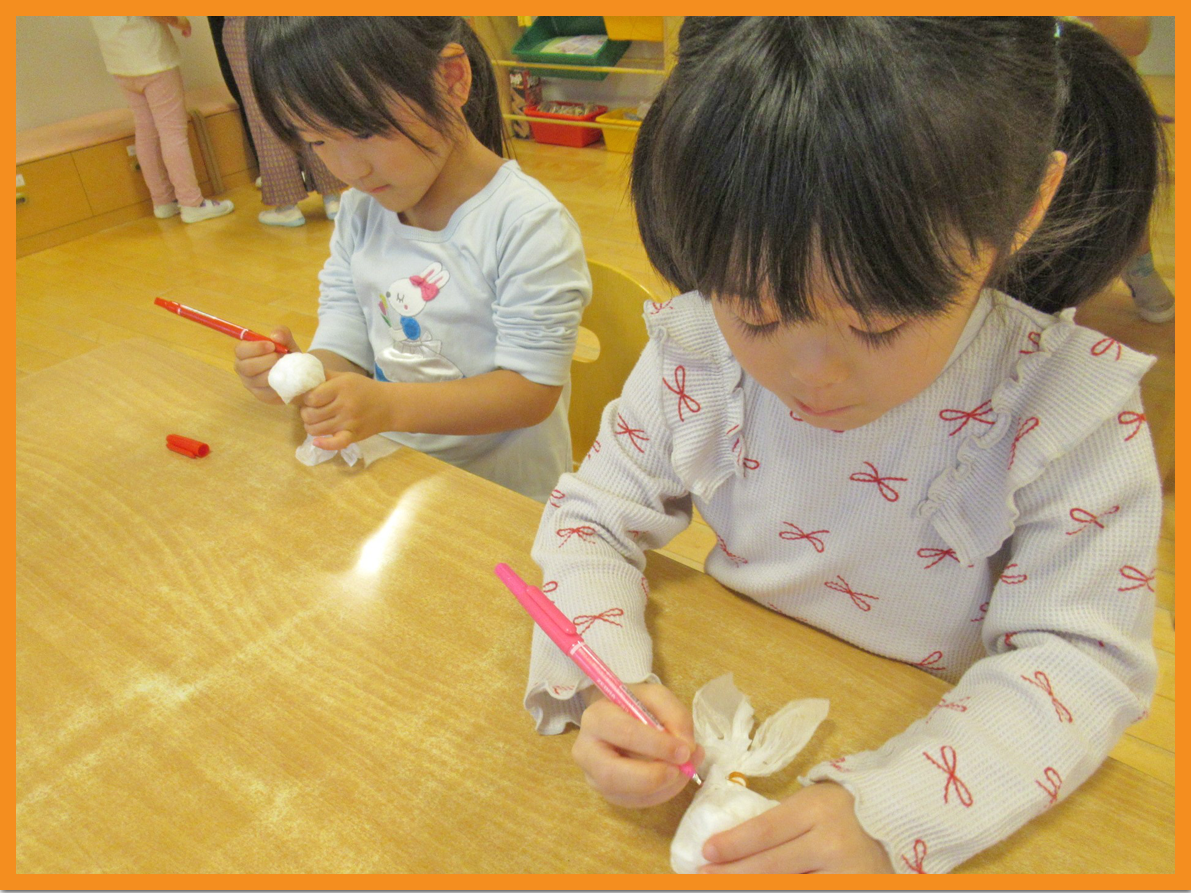 朝の会では明日の園外保育(芋ほり)の話をすると、こどもたちから「みんなで てるてる坊主を作るのはどうかな」という声が聞こえてきました。そこで、急遽こどもたちのリクエストに応えて『てるてる坊主づくり』をすることに!!