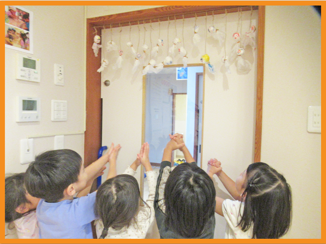 完成した後は、みんなで「明日、晴れますようにっ!」と手を合わせててるてる坊主さんにお願いをしています。
