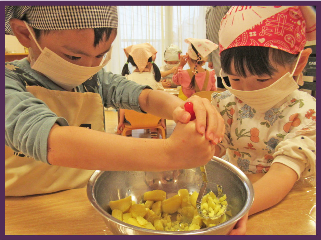 マッシャーを使い、サツマイモを潰す作業をお願いされると「じゃあ順番にやろう!5回ずつね!」や「私がこれ(ボール)を押さえておくよ」等とこどもたち同士で声を掛け合い、協力して作業を進める姿があり、頼もしかったです!ボールの中に調味料を入れた後はスプーンを使って混ぜ合わせました。だんだん滑らかになっていく様子に釘付けで「すごーい、もう食べたくなっちゃったよ」とおなかがすいた様子のとんぼさんでした。