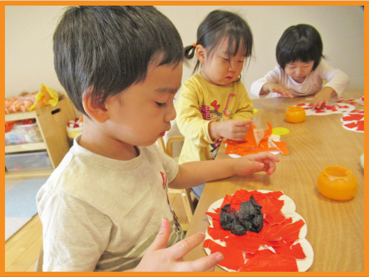 4月にちぎり絵を行った際は、一人でちぎるのが難しく「せんせい手伝って~」という声が多くありましたが、今日は自分たちで集中して行う姿に成長を感じました。