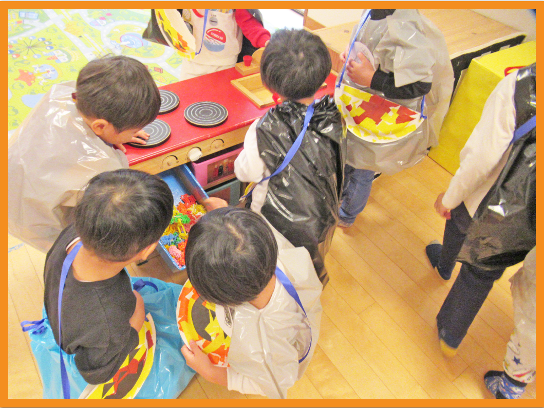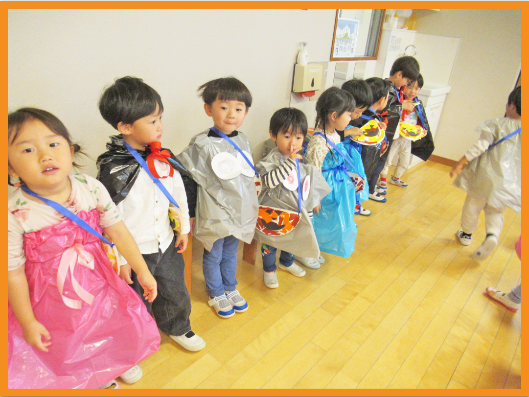 今日は待ちに待ったハロウィンです。以前、クラスで「みんなでハロウィンパーティーをしたいね」という意見が出たため、こどもたちと話し合い「みつばち組ハロウィンパーティー」を計画していました。