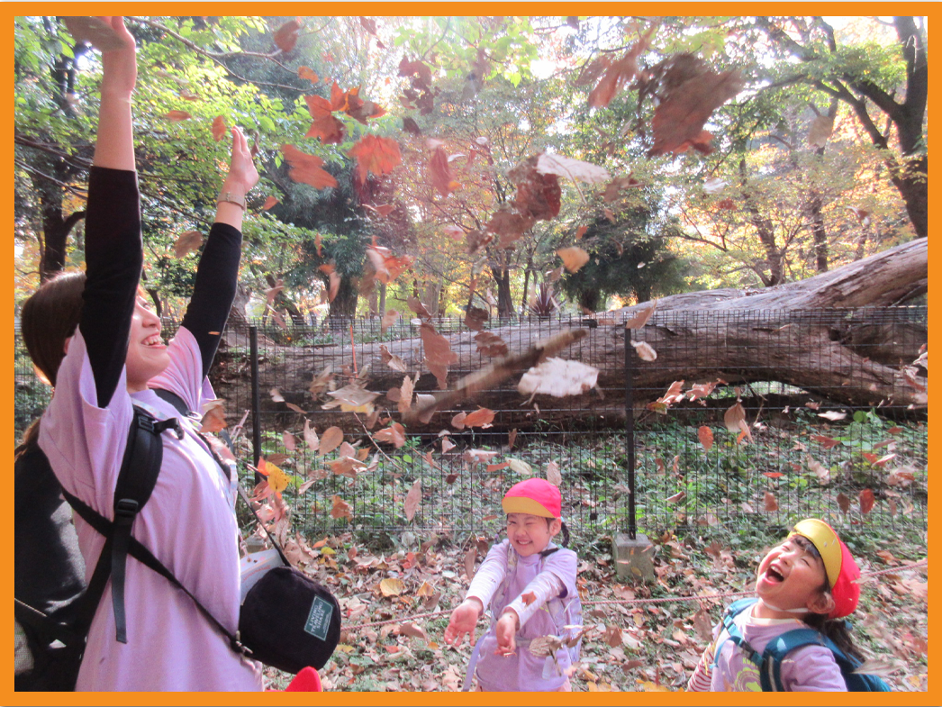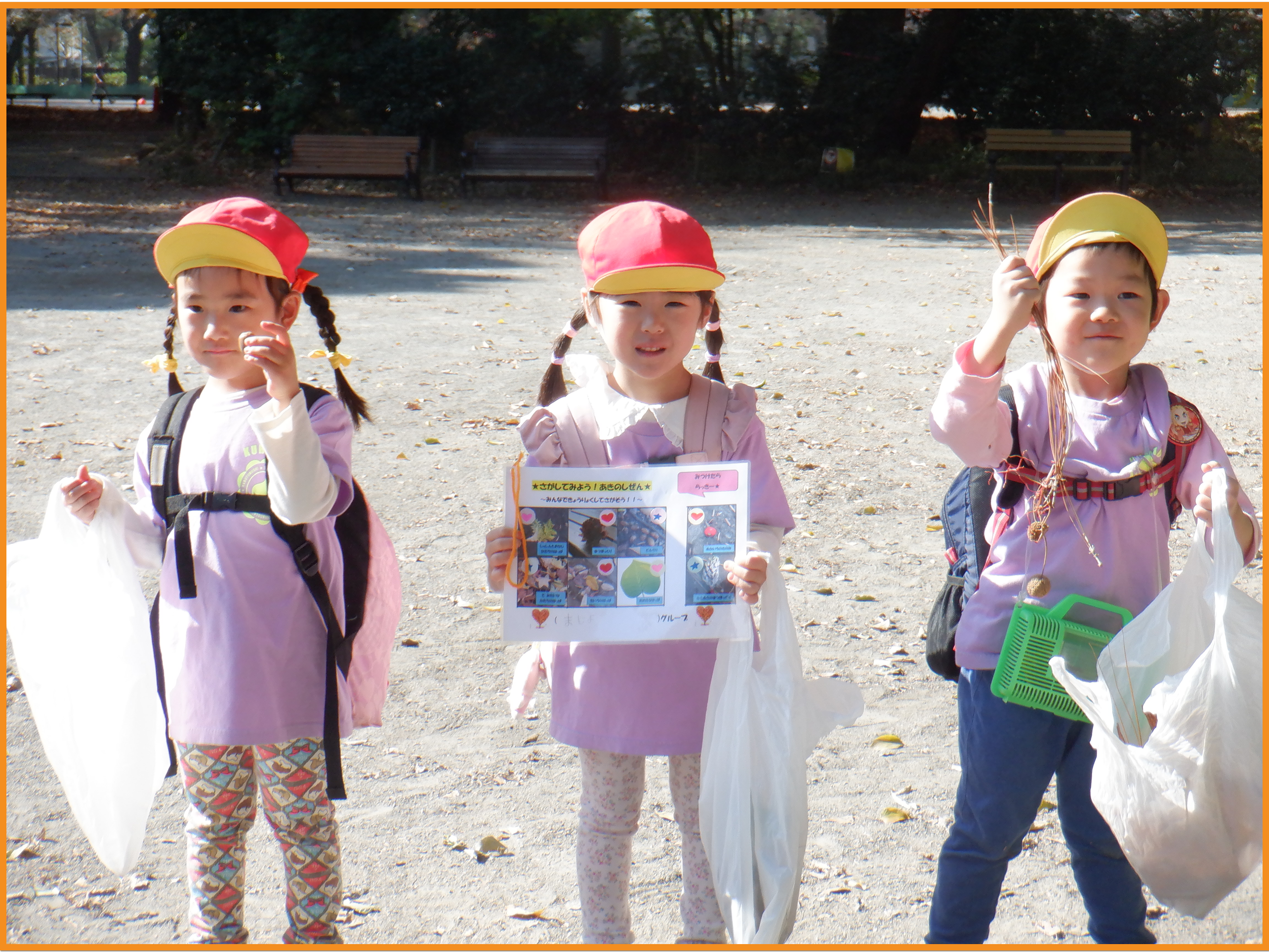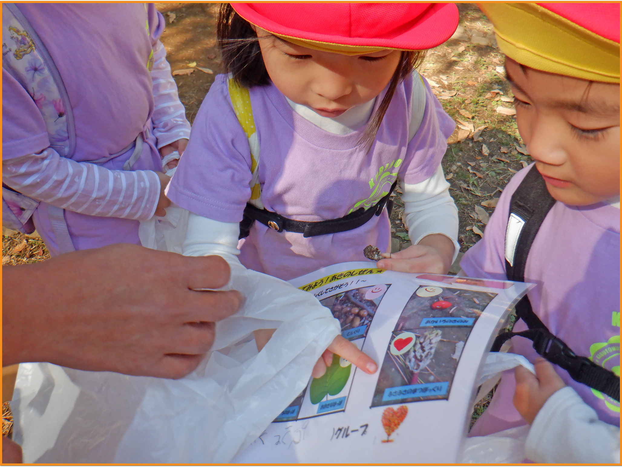 公園に着くと、さるすべりの木や大きなクスノキを発見!さるすべりという名前の由来や大きなクスノキはみんなが生まれる何年も前からあることを教えてもらい、またひとつ自然物への知識が増えたようです。その後は、保育者から出された自然物ミッションに挑戦しました。手のような形の葉っぱやドングリや松ぼっくりなどの秋の木の実などを見つけると「先生、あったよ!見てみて!」と発見したことを嬉しそうに話す姿が印象的でした。ミッション以外にも持ち帰る用の袋の中にお気に入りの自然物を入れると「じゃーん、これすごいでしょ!」や「あっちにあったよ、教えてあげる」とこどもたち同士でのやり取りも広がっていました。