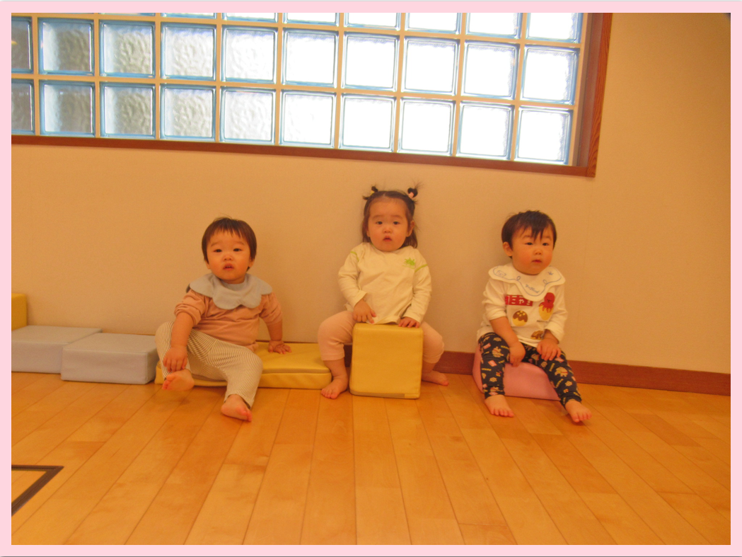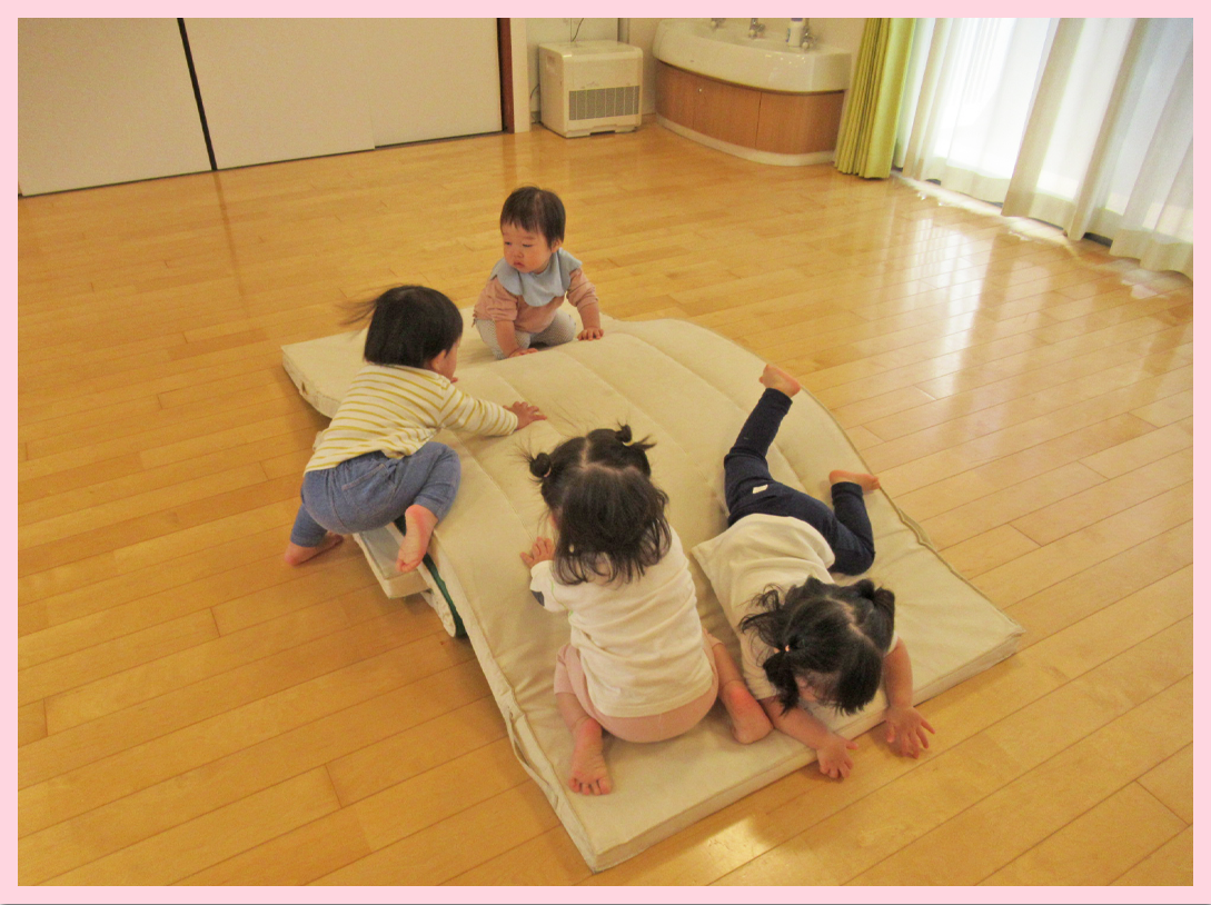 小さなマット山で遊んでいたありんこさんも今では大きな斜面のマット山もハイハイで勢いよく上って滑り降りて、保育者と手をつないで歩いて登ることもへっちゃらです。体全体を大きく動かして活動するようになりました。