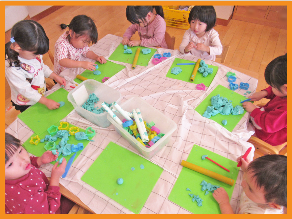 粘土遊びが大好きなこどもたち。型抜きをして「クッキーです」「チョコレートもありますよ」とお店屋さんごっこに繋がりました。