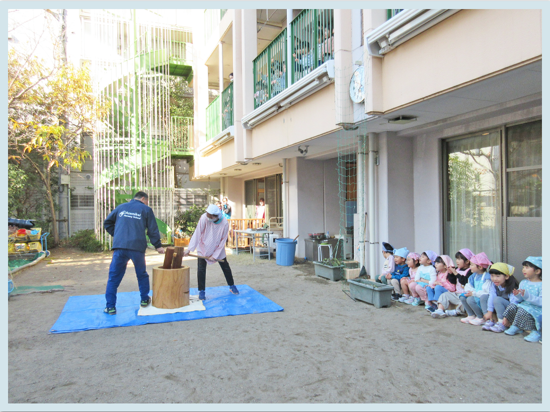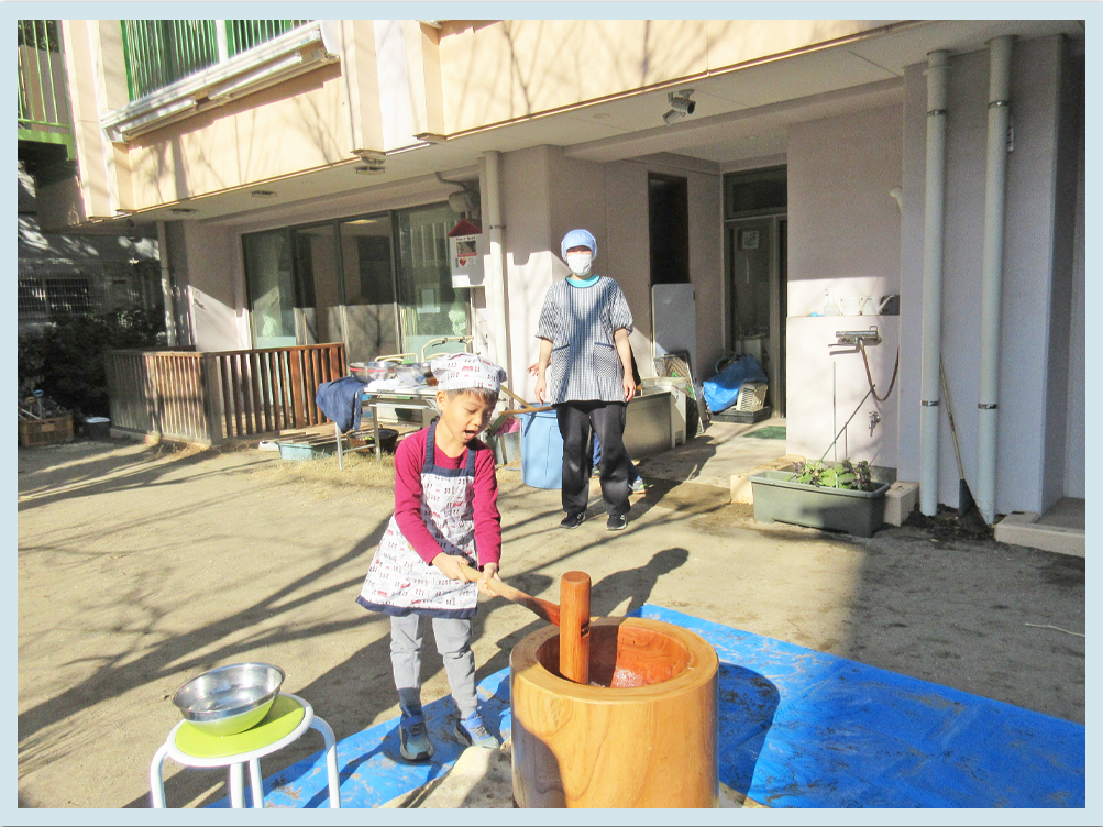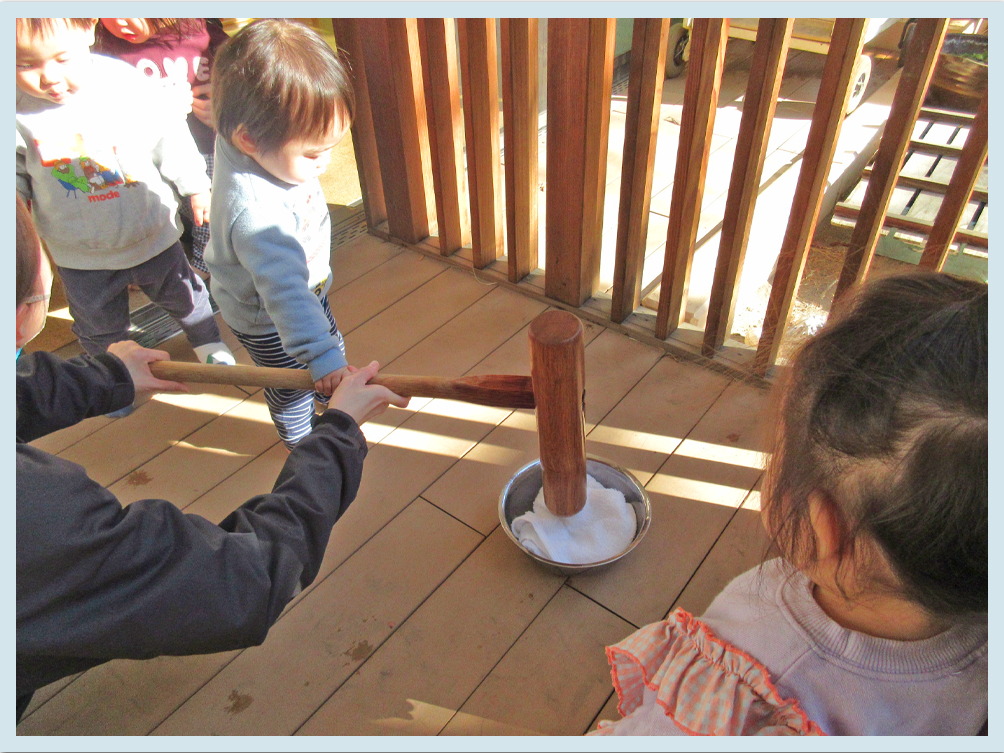 まず初めに保育士から餅つきの説明がありました。以前、給食の先生からもちつきや由来についての話を聞いていたので、こどもたちも「これはもち米なんだよね。」と理解しているようでした。初めて目にする臼と杵にこどもたちも「思っていたよりも、大きいね。」と少し驚いた様子でした。