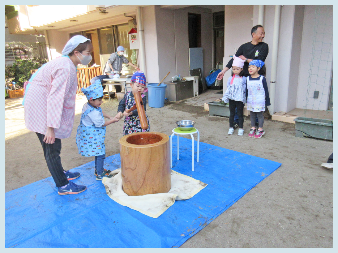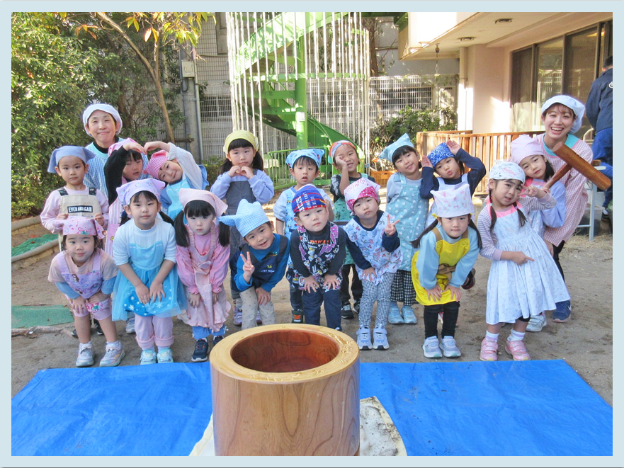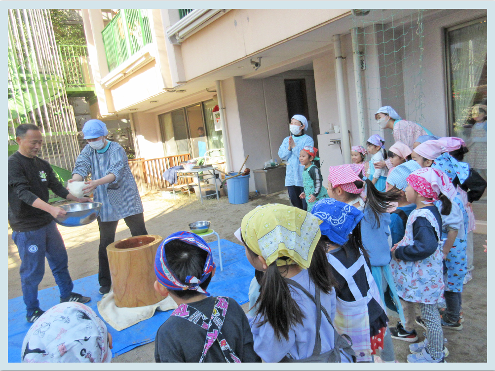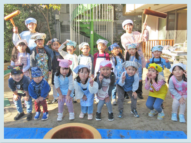 今日はこどもたちが楽しみにしていた『もちつき』がありました。数日前から楽しみにしていたこどもたち。朝の会の時間には「楽しみ~!」と期待を膨らませている様子がありました。エプロンと三角巾を身に着けて、準備完了です!!
