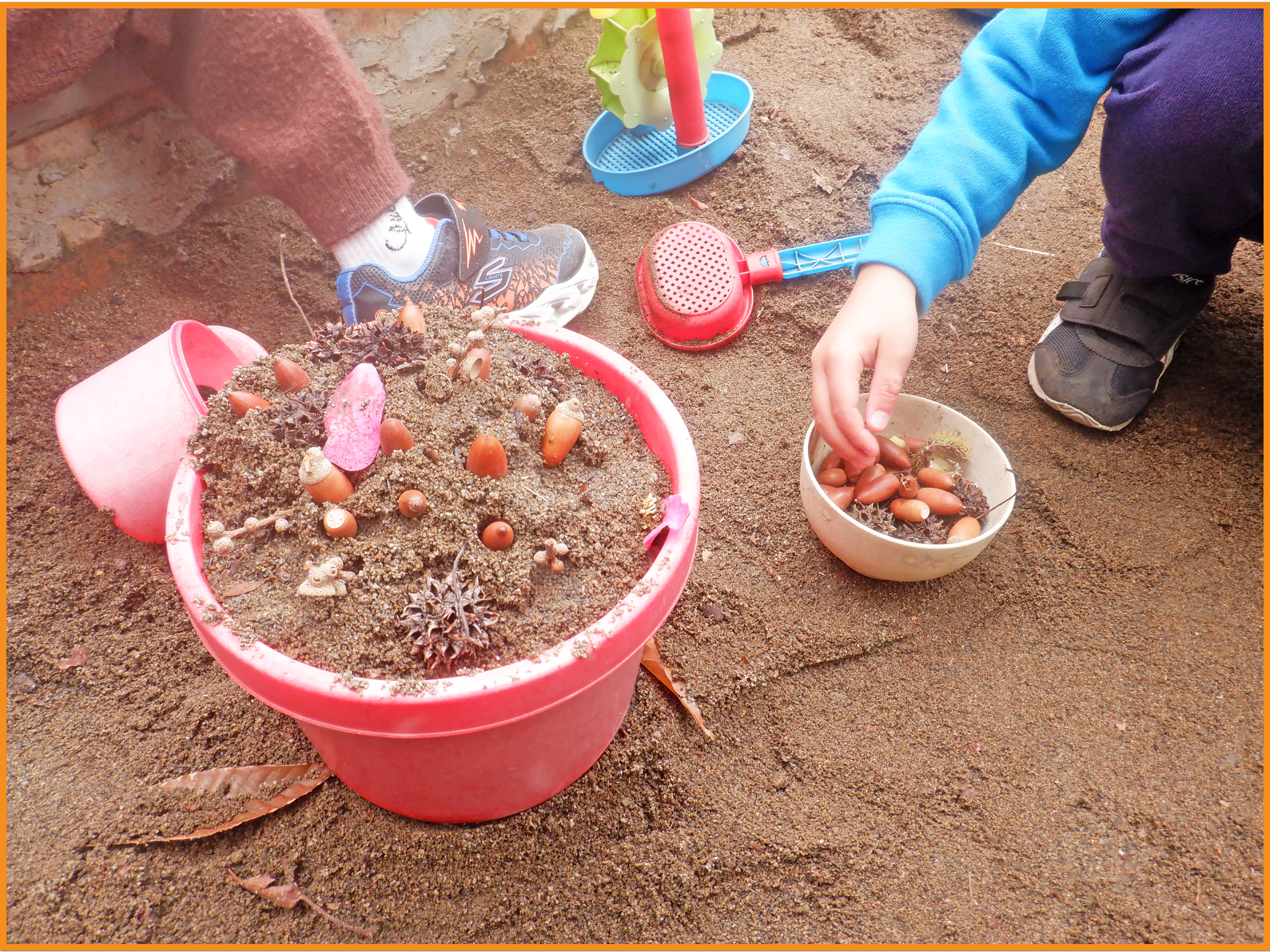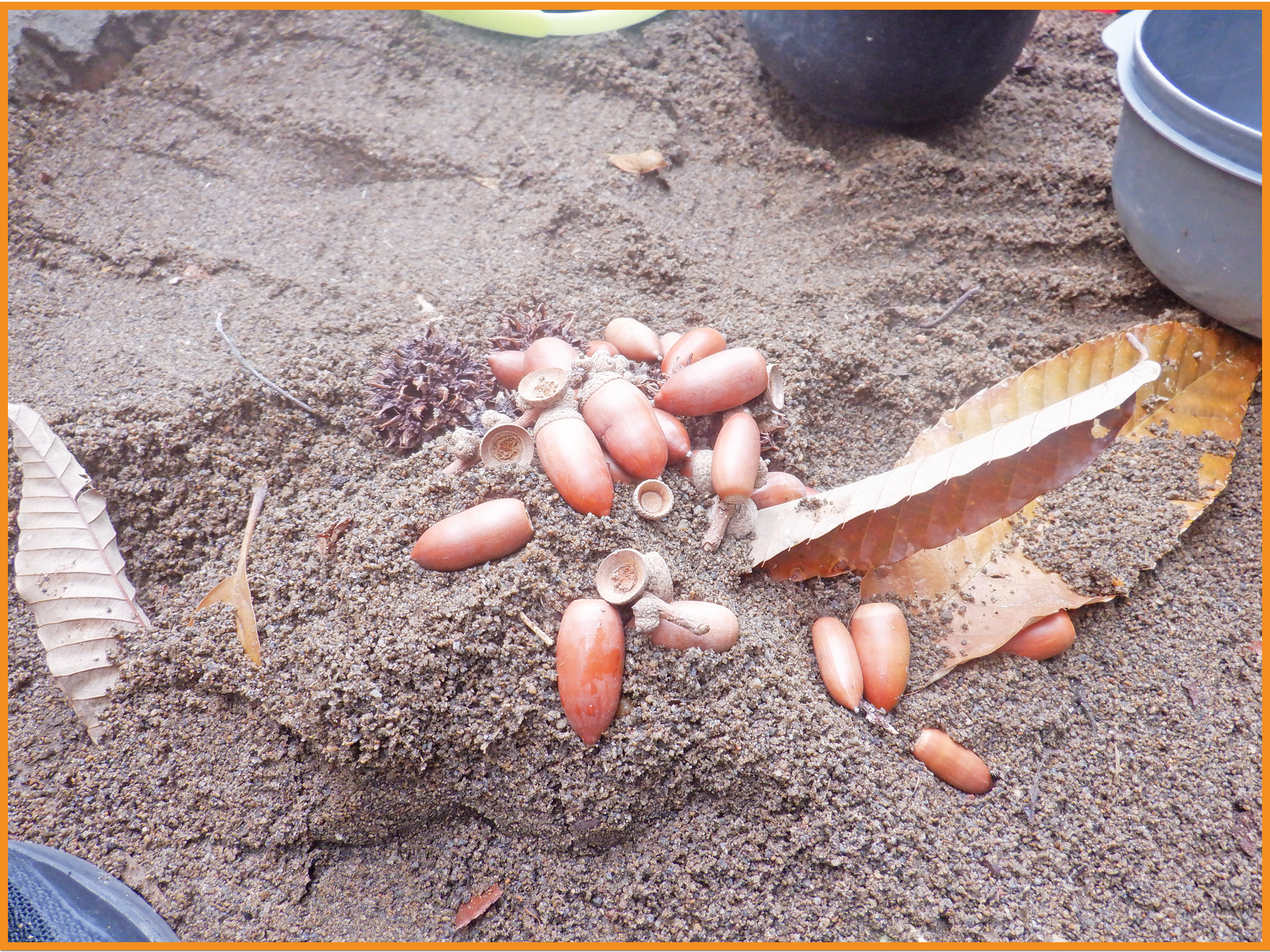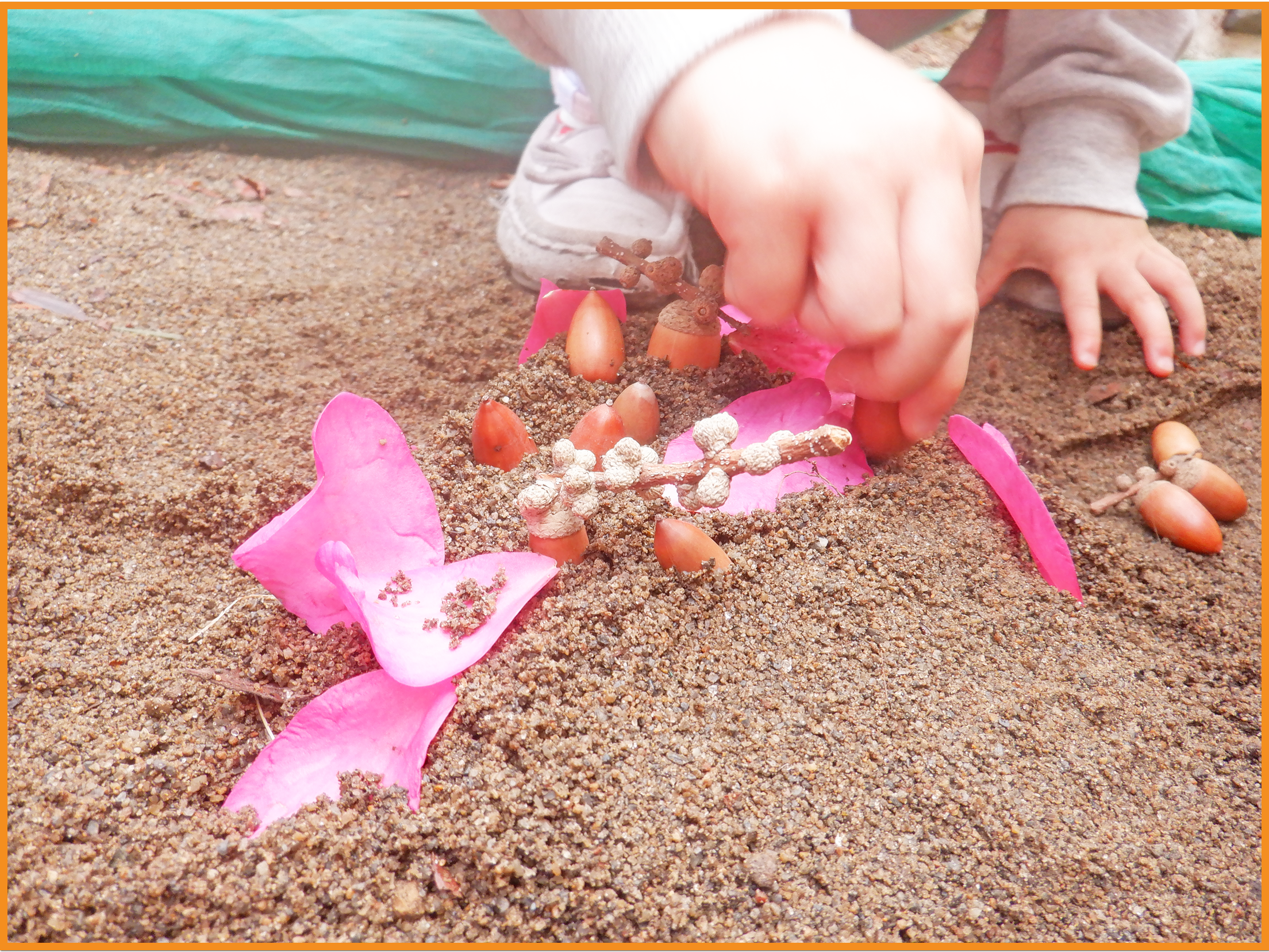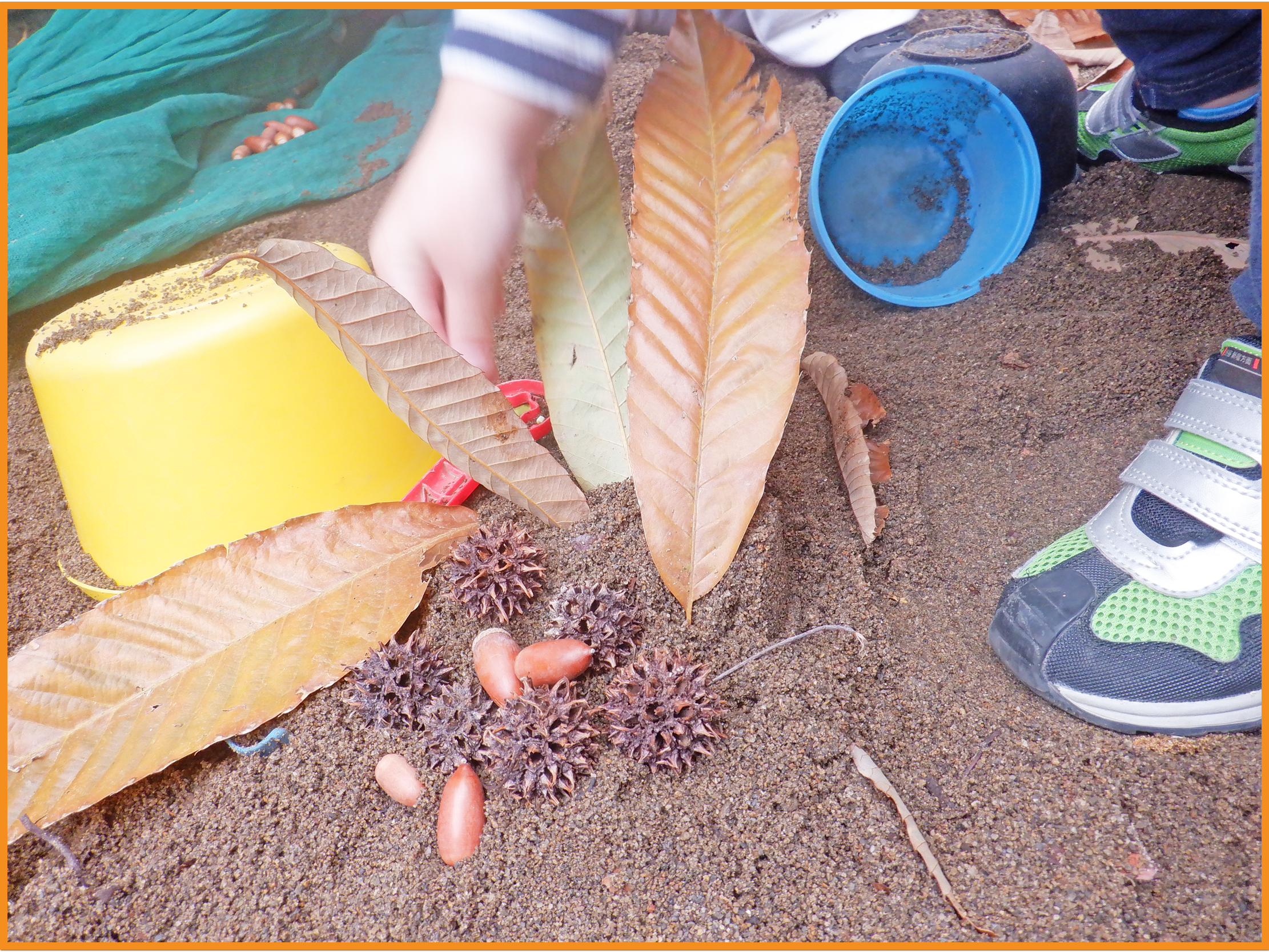 今日の園庭遊びでは、どんぐりとモミジバフウを使用しました。