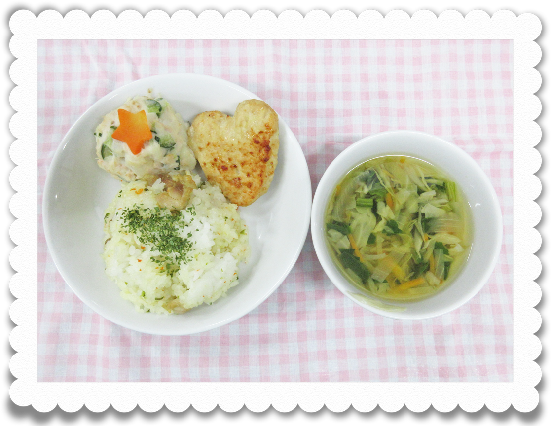 【幼児給食】 チキンピラフ、鶏つくね、ポテトサラダ、ジュリアンスープ