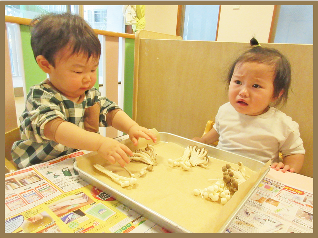 きのこにすぐに興味を示して手を伸ばす姿もあれば、「や」と手で押し返して触ることを嫌がる姿もあり、それぞれ豊かな反応を見せていたありんこ組さん。