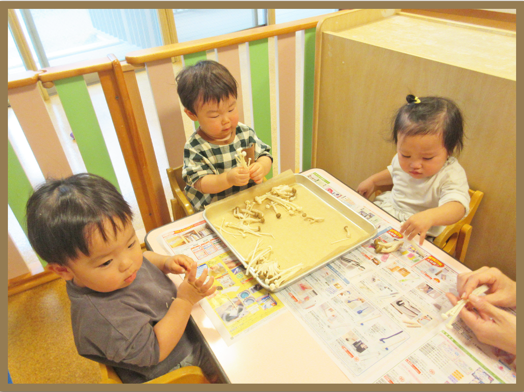 また、えのきちぎりでは真剣で集中した表情を見せ、手先を上手に使って取り組む姿があり、成長を感じる場面でした。