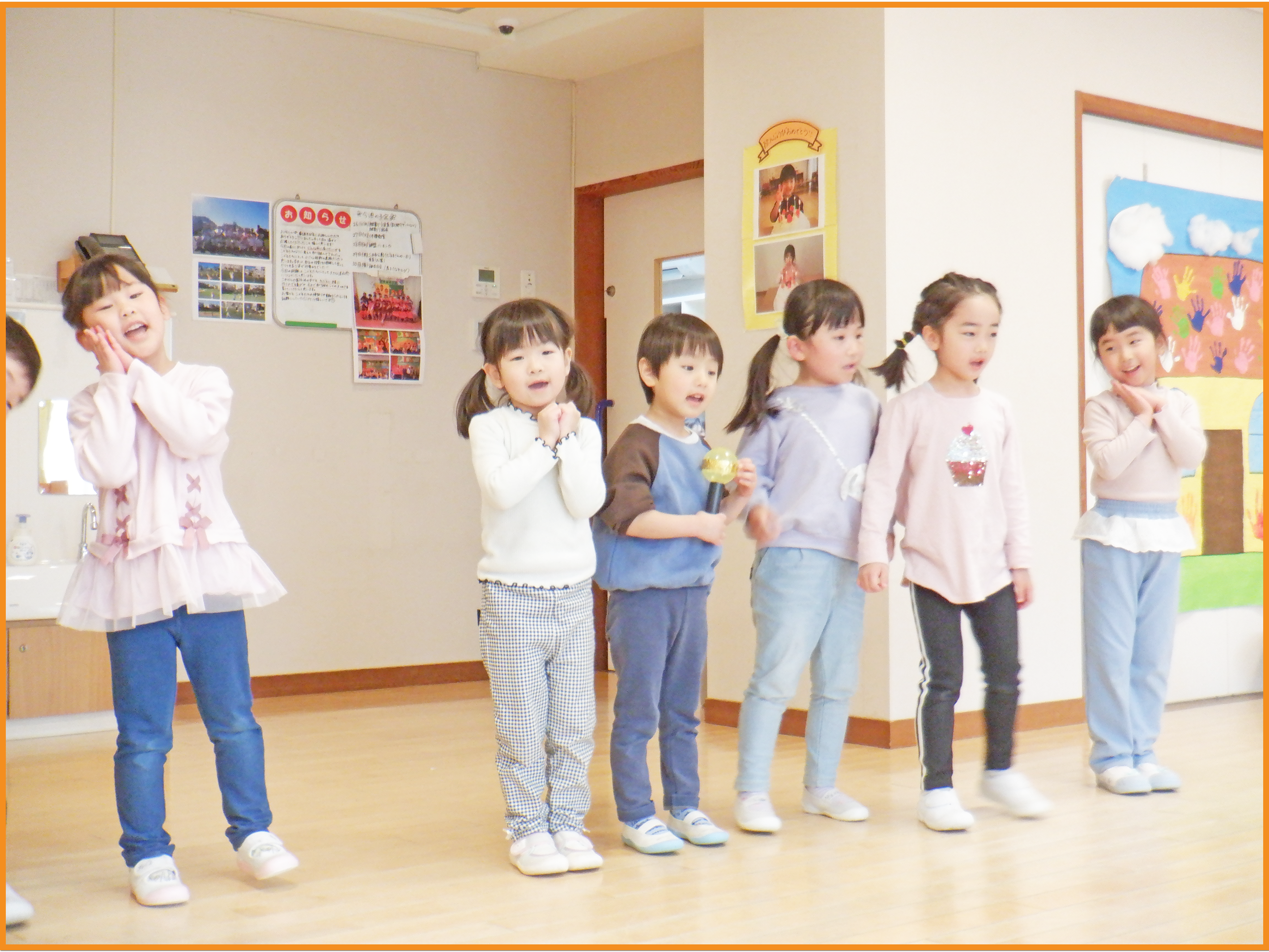 最後はみんなでマイクを持って、劇中の歌を歌って今日の室内遊びは終了です。劇遊びは終わってしまいましたが、こうして劇に関連する遊びや活動を今後も取り入れていけたらと思いました。