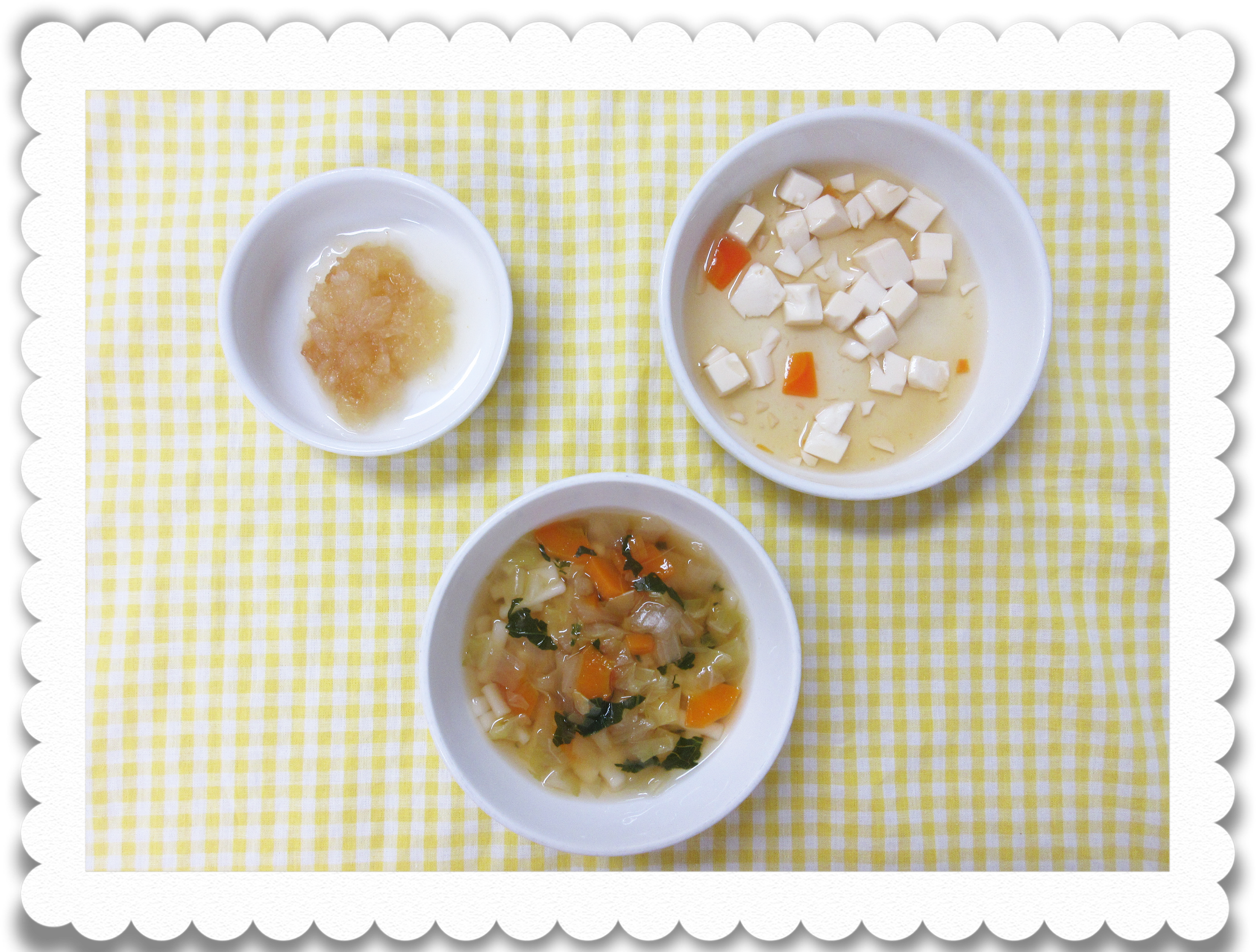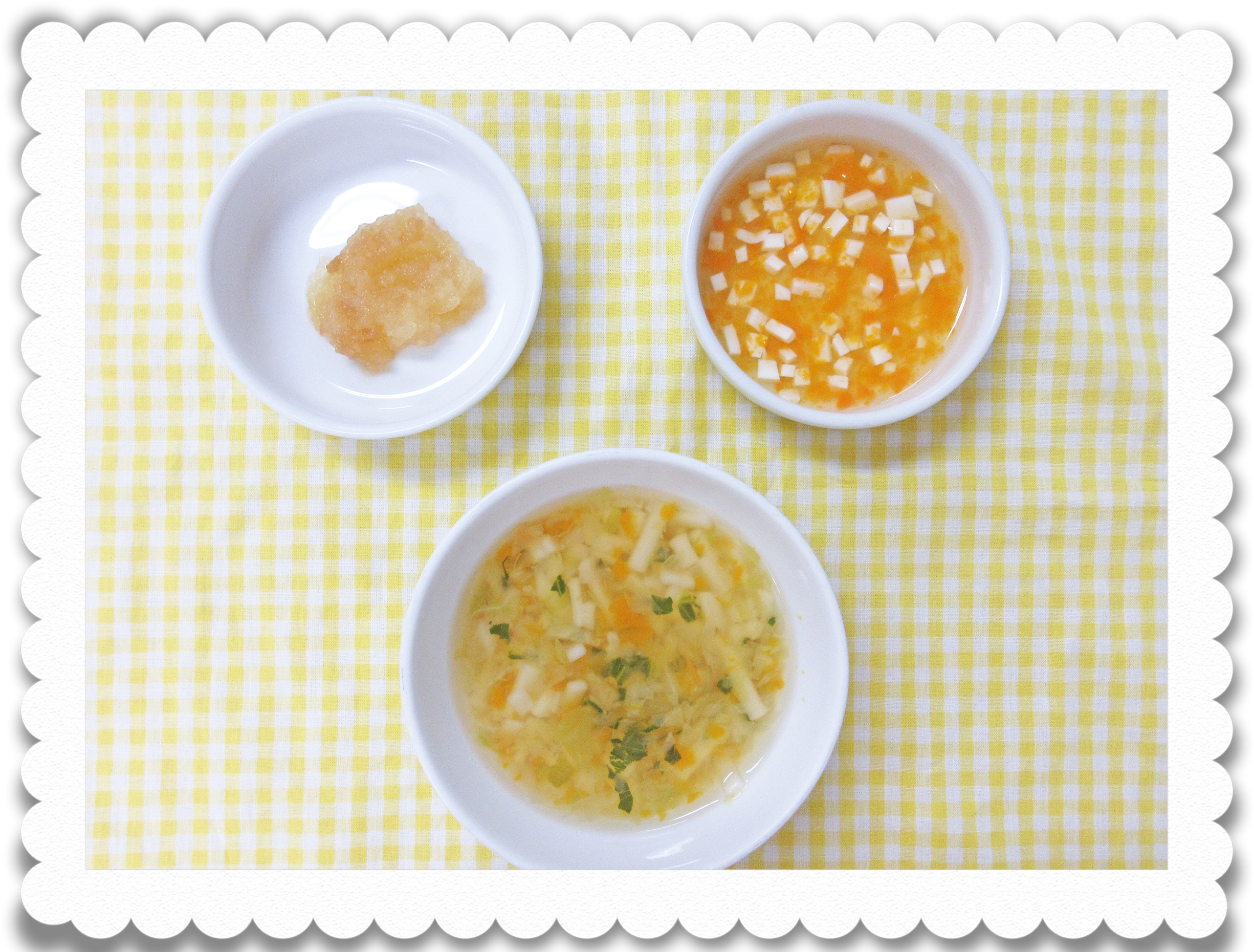 午前食:10倍粥、白身魚のペースト、人参と玉ねぎのうらごし、野菜スープ