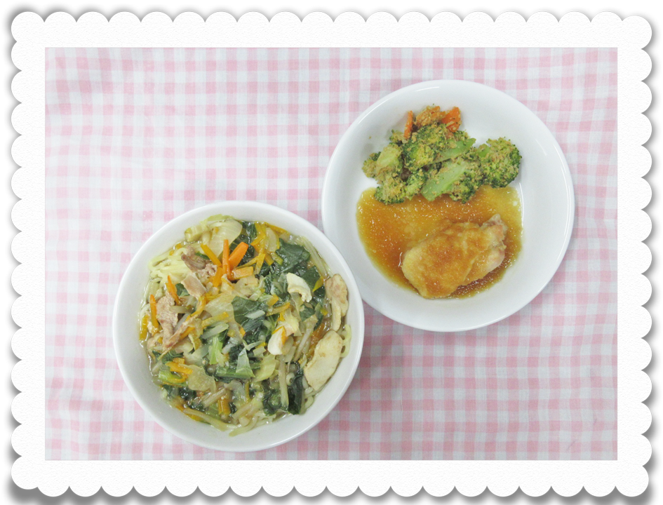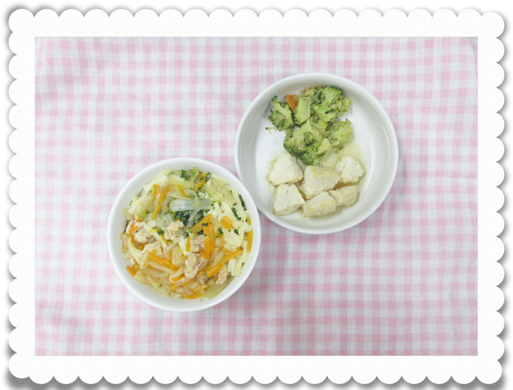 【乳児給食】タンメン、鶏肉のおろしポン酢、ブロッコリーのごま和え