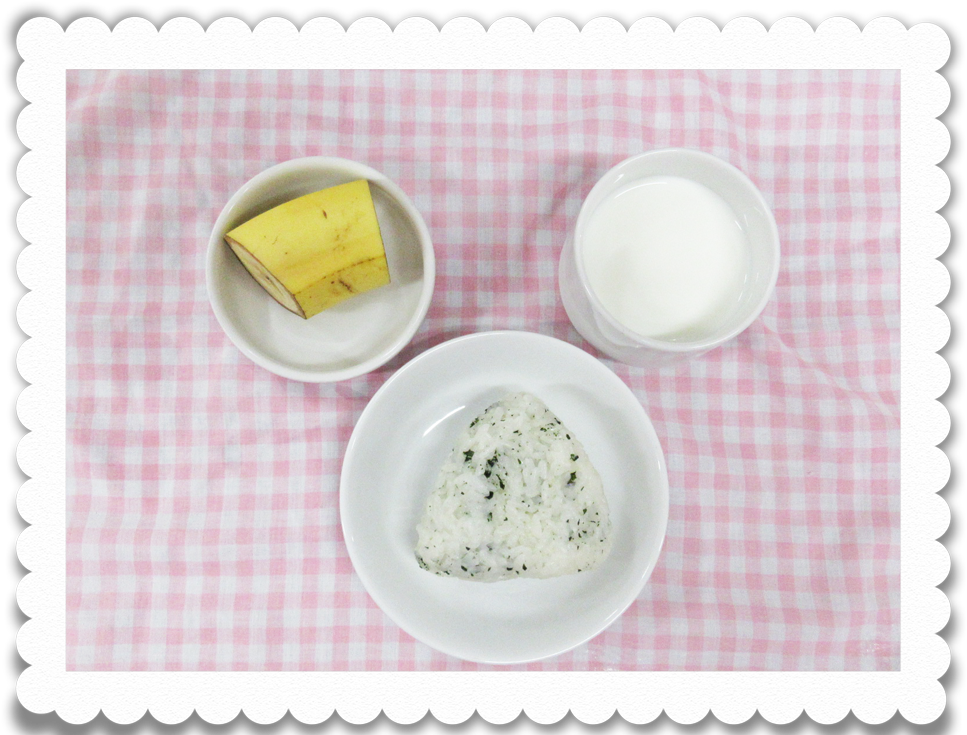 【乳児おやつ】牛乳、わかめおにぎり、果物