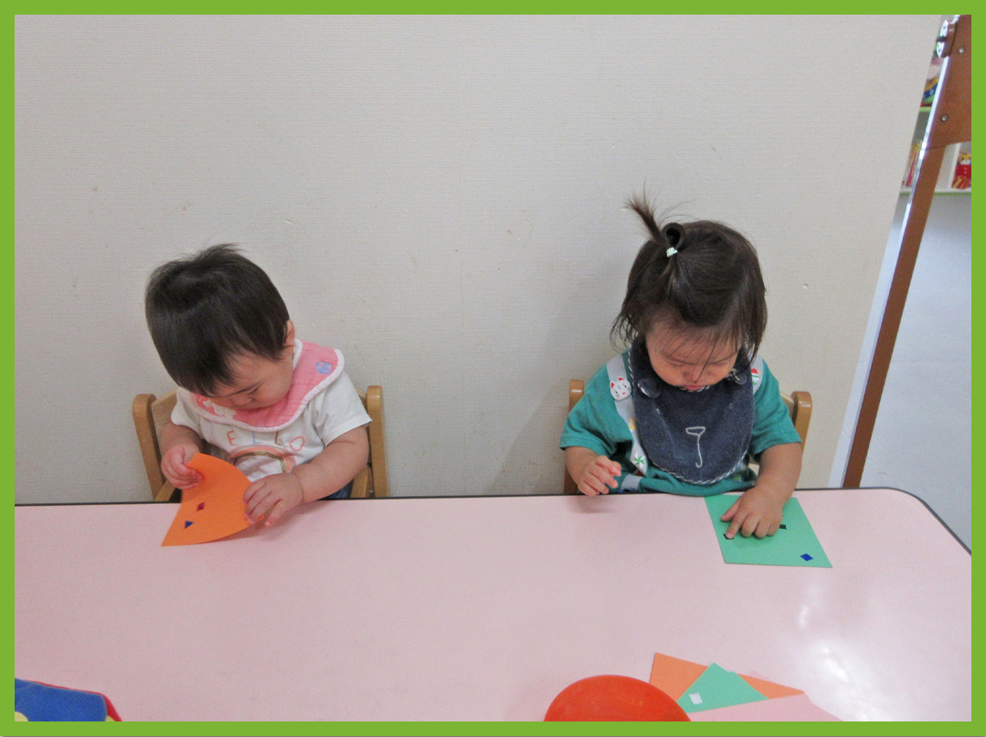 室内でシール貼りの製作を行いました。保育者が「ペタペタしよう」と声をかけながらシールを出すと興味津々な様子で集まってきてくれました。こどもの指先にシールを付けてあげるとどのようにしたら画用紙に貼れるか指の角度を変えながら試行錯誤していました。また、お友だちと隣り合わせで製作をすることが嬉しかったようでお友だちの様子を観察しながら自分も同じようにやってみようと刺激をもらっているようでした。