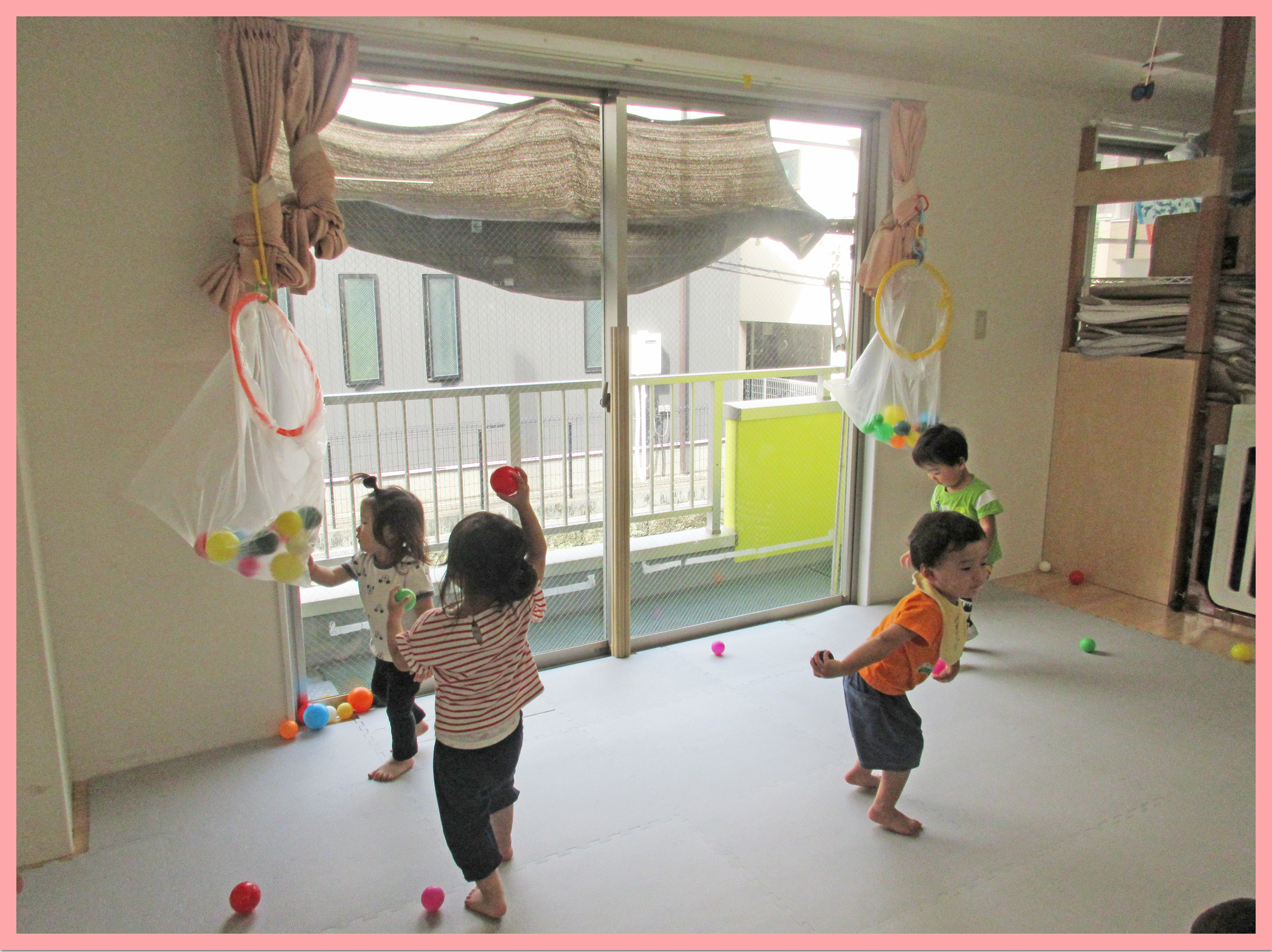 「それっ」と言いながら、袋めがけてボールを入れ、入ると「入ったー」と喜んでいました。